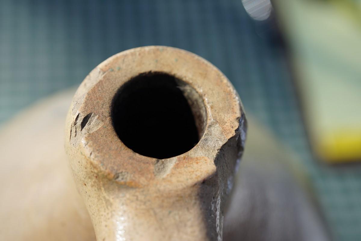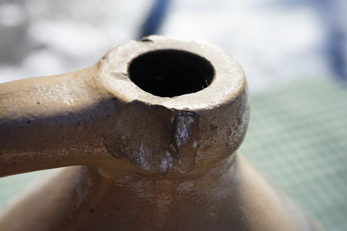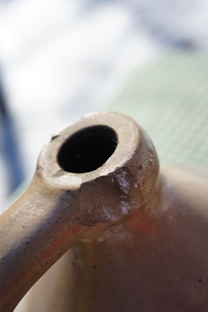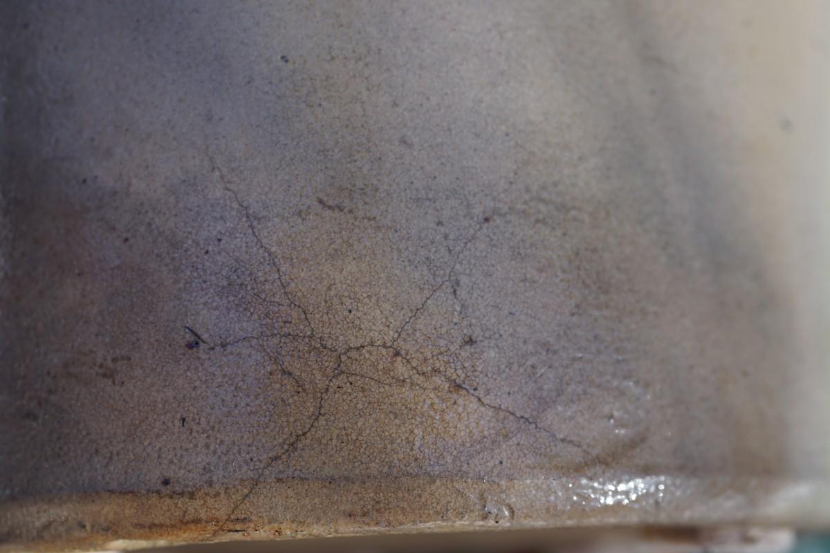 older spider crack near the base on the back side. chips on spout. Staining on the outside glaze