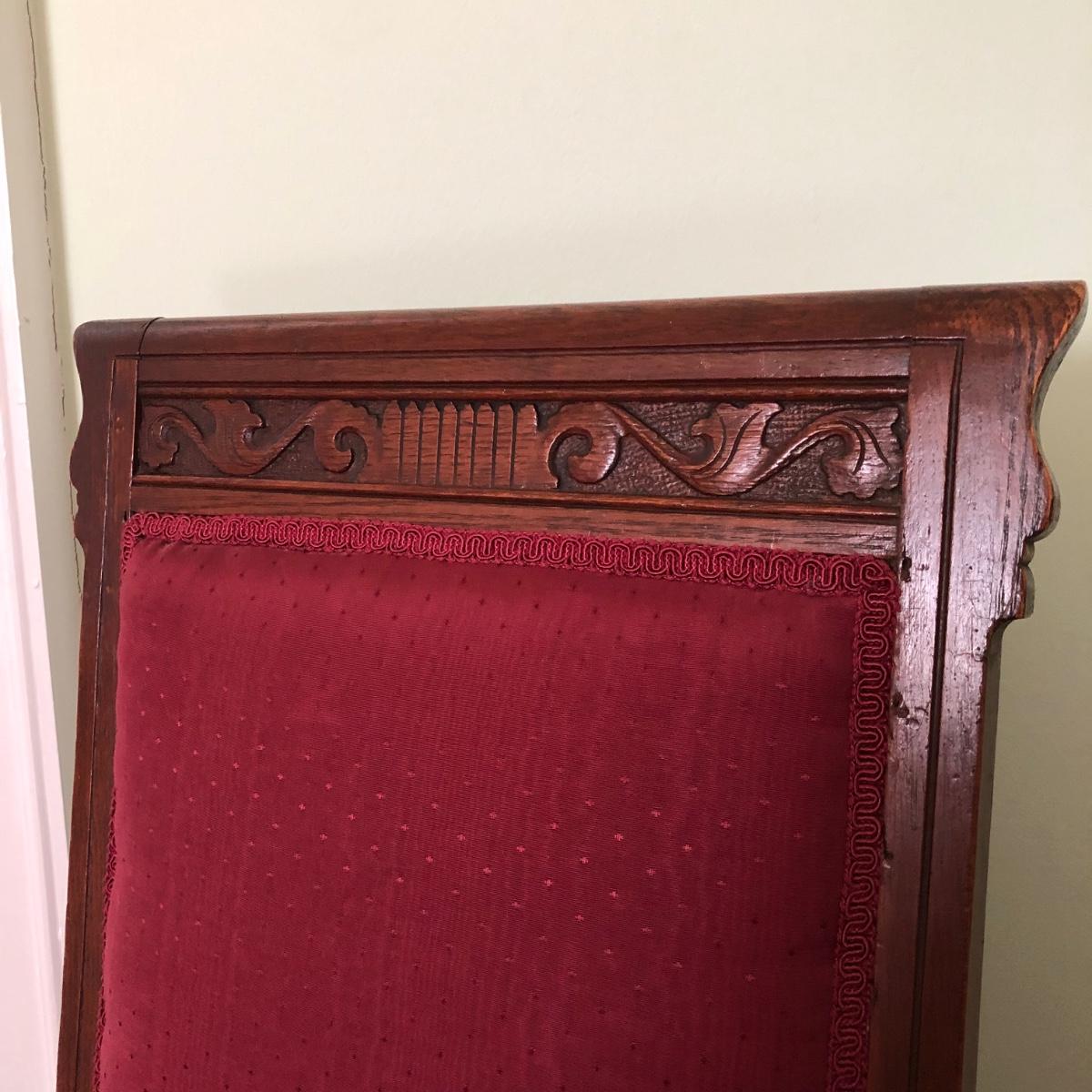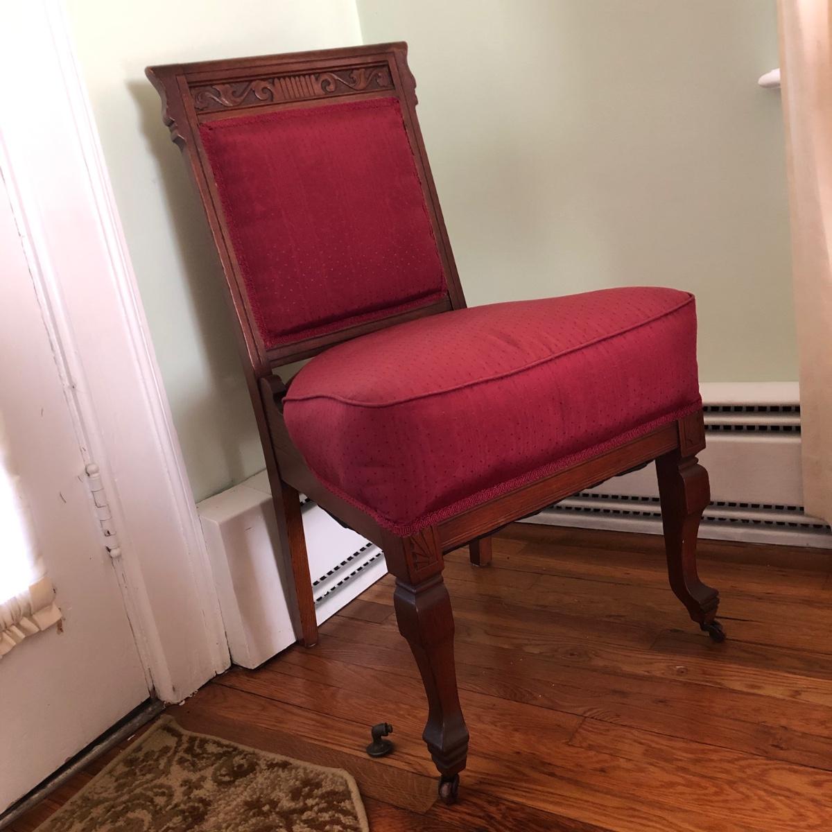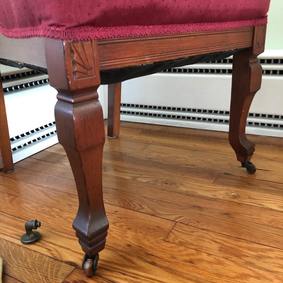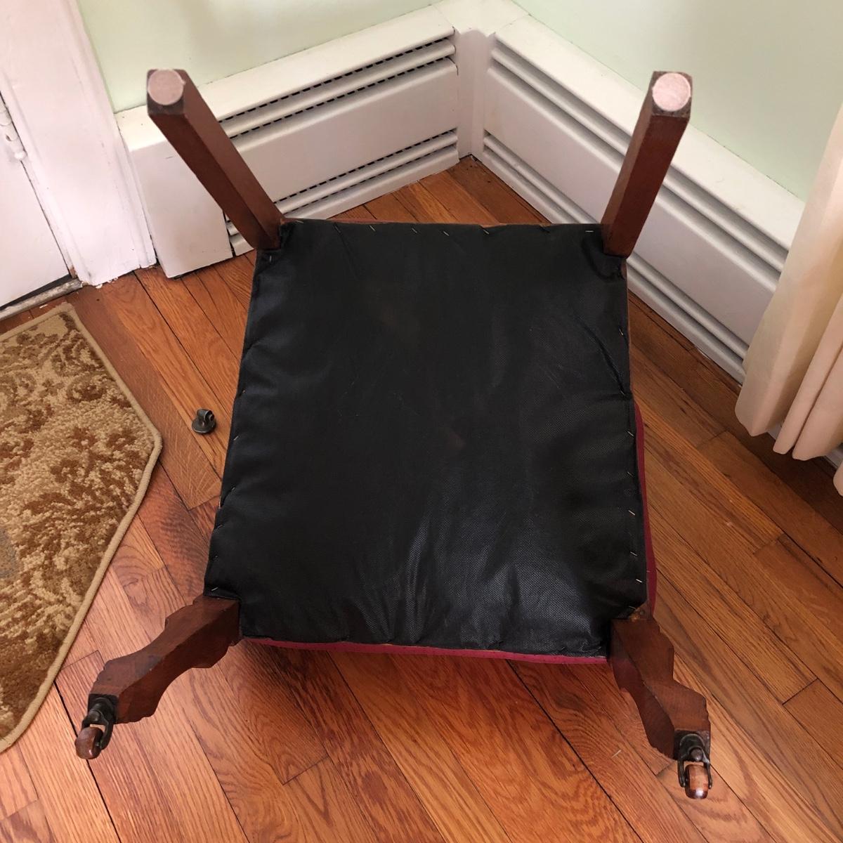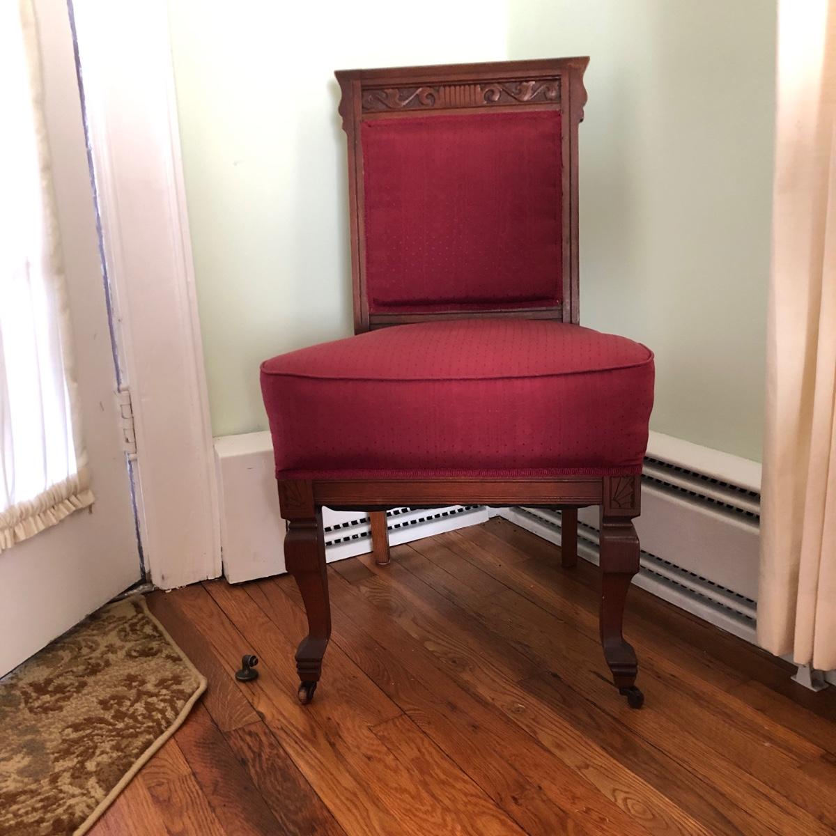 This antique chair has hand carved details in the wood and has been reupholstered in burgundy fabric that has a shine similar to taffeta with a stitched pattern. The wheels, which rolled freely when moved are made of wood with a metal structure holding them. The cushion of the seat is very plush and thicker than the average seat cushion at about 6.5" thick. The seat is 1' 8" from the ground and the chair measures 1' 8.5" x 2' 11.5" x 1'9".