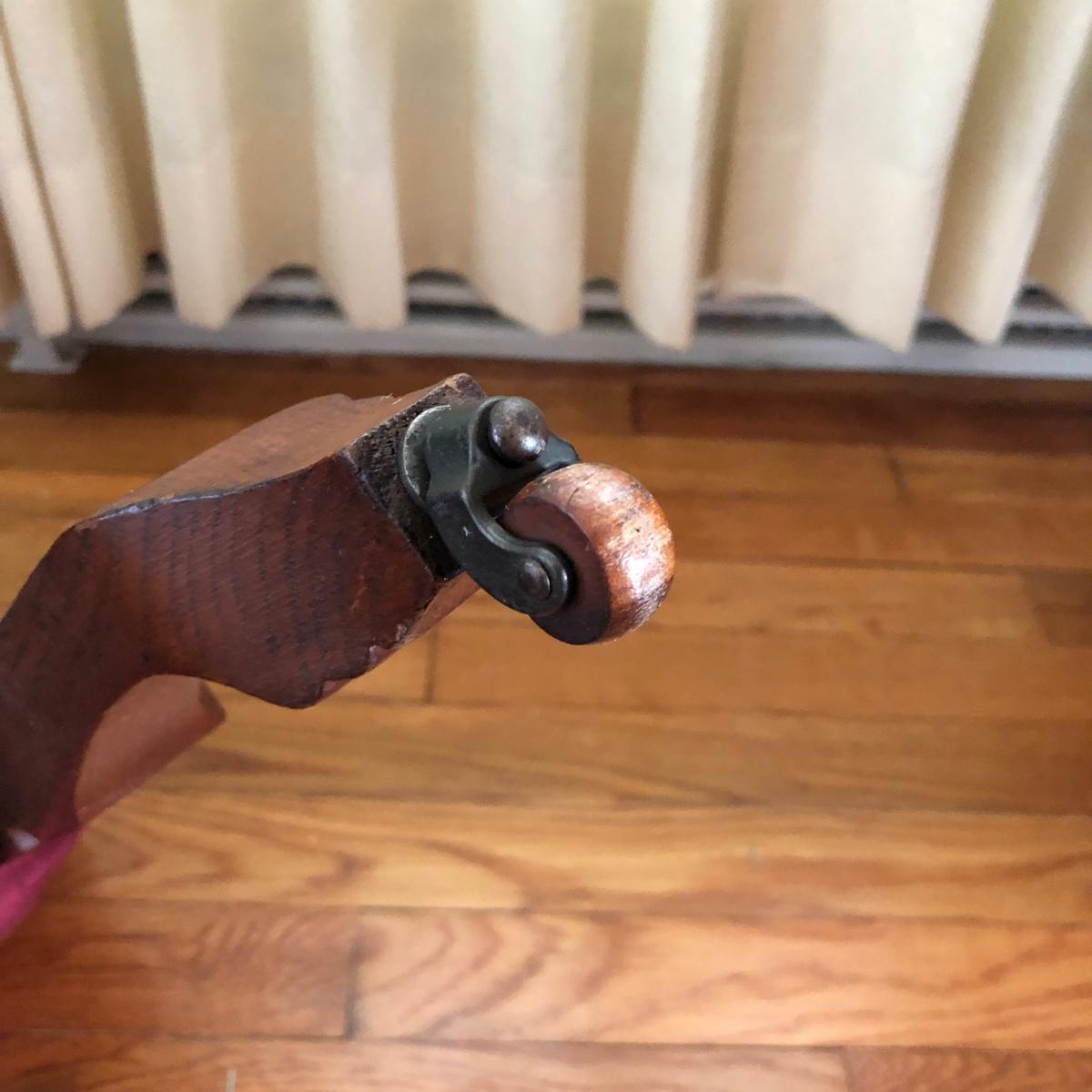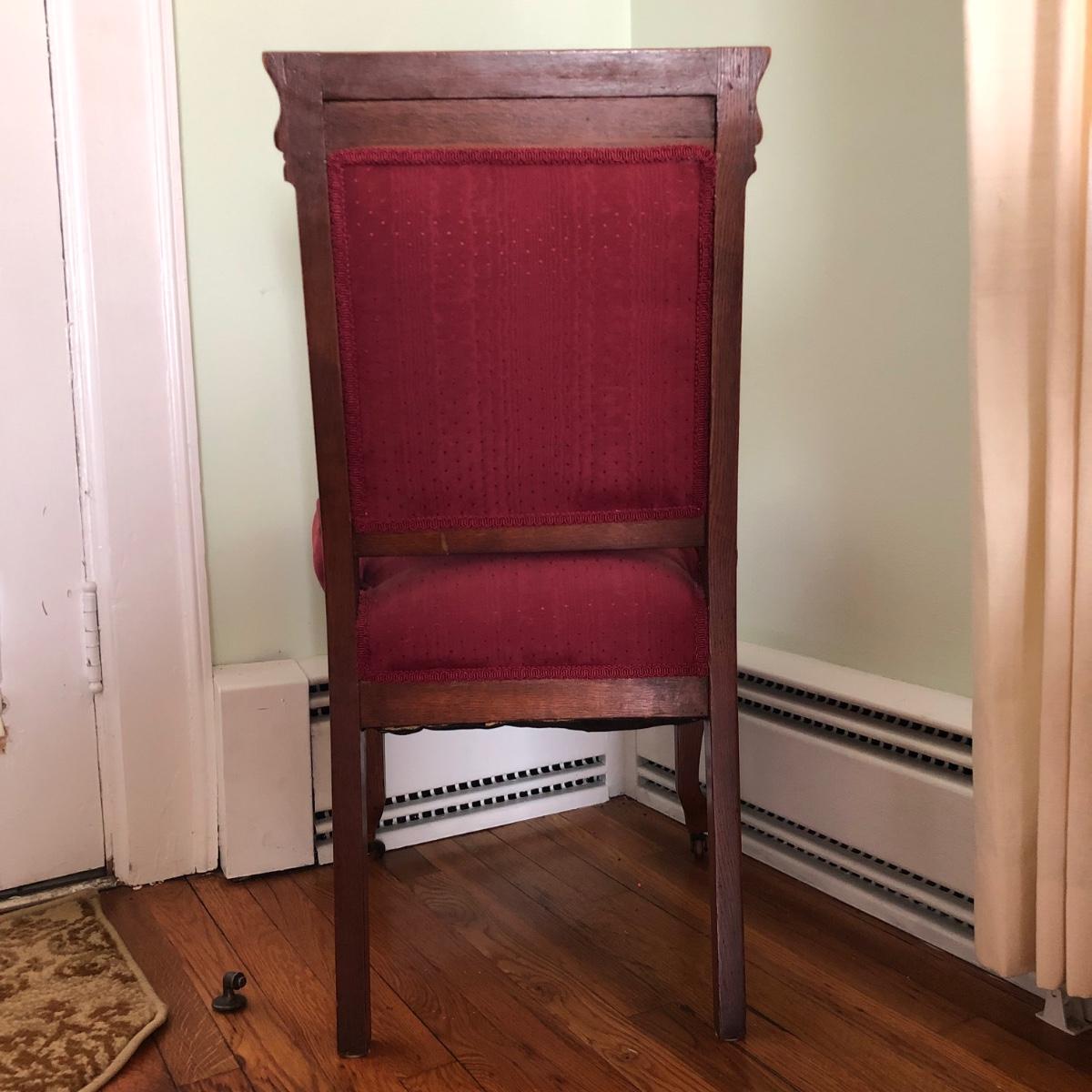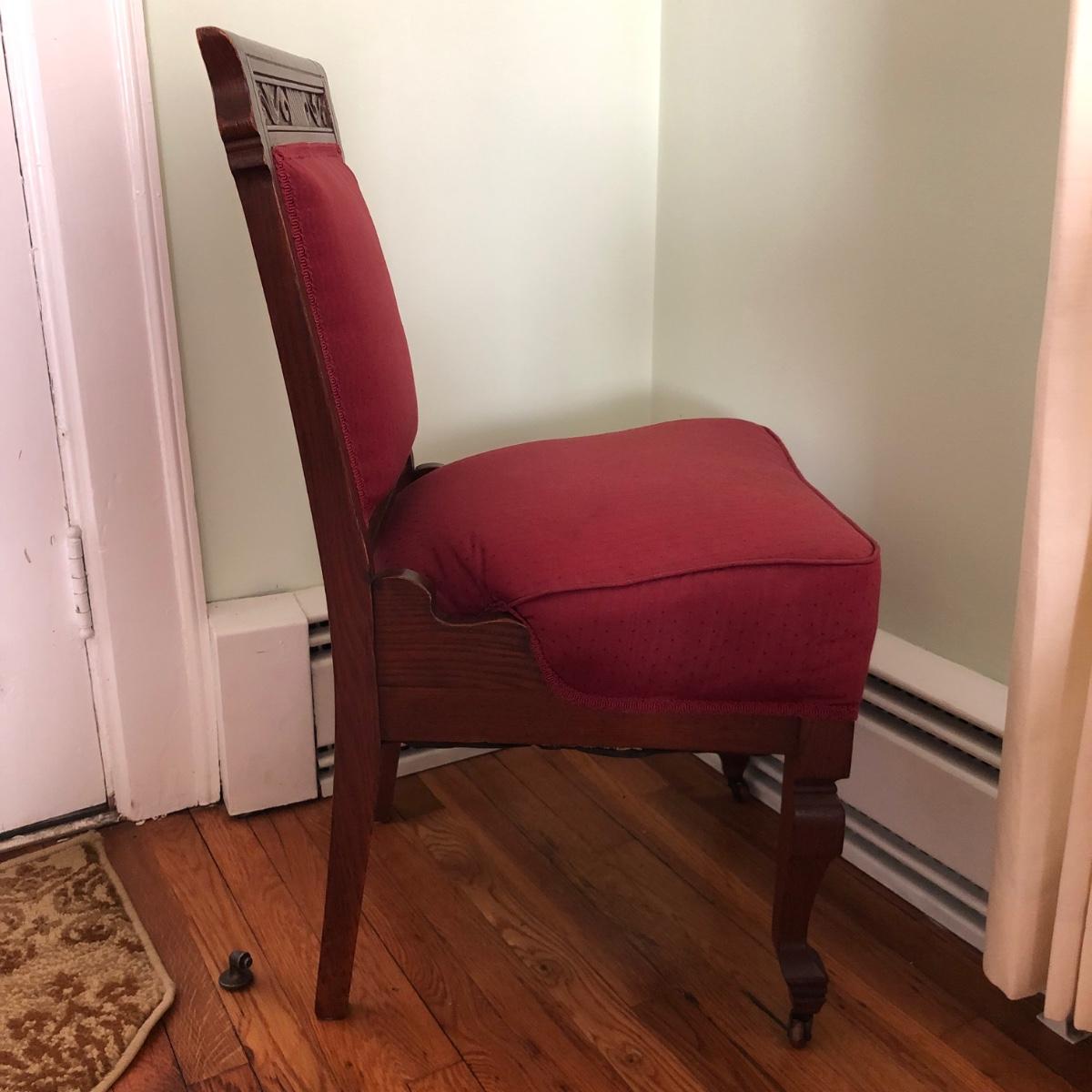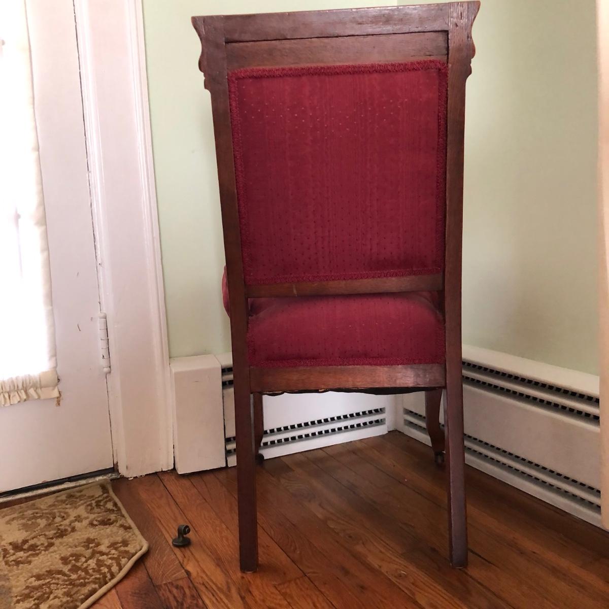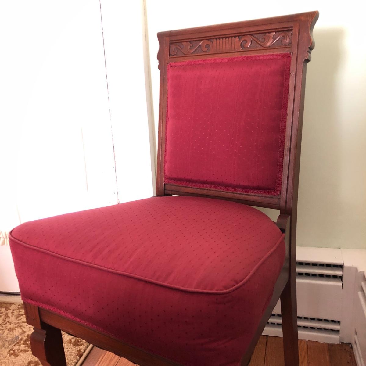 This antique chair has hand carved details in the wood and has been reupholstered in burgundy fabric that has a shine similar to taffeta with a stitched pattern. The wheels, which rolled freely when moved are made of wood with a metal structure holding them. The cushion of the seat is very plush and thicker than the average seat cushion at about 6.5" thick. The seat is 1' 8" from the ground and the chair measures 1' 8.5" x 2' 11.5" x 1'9".