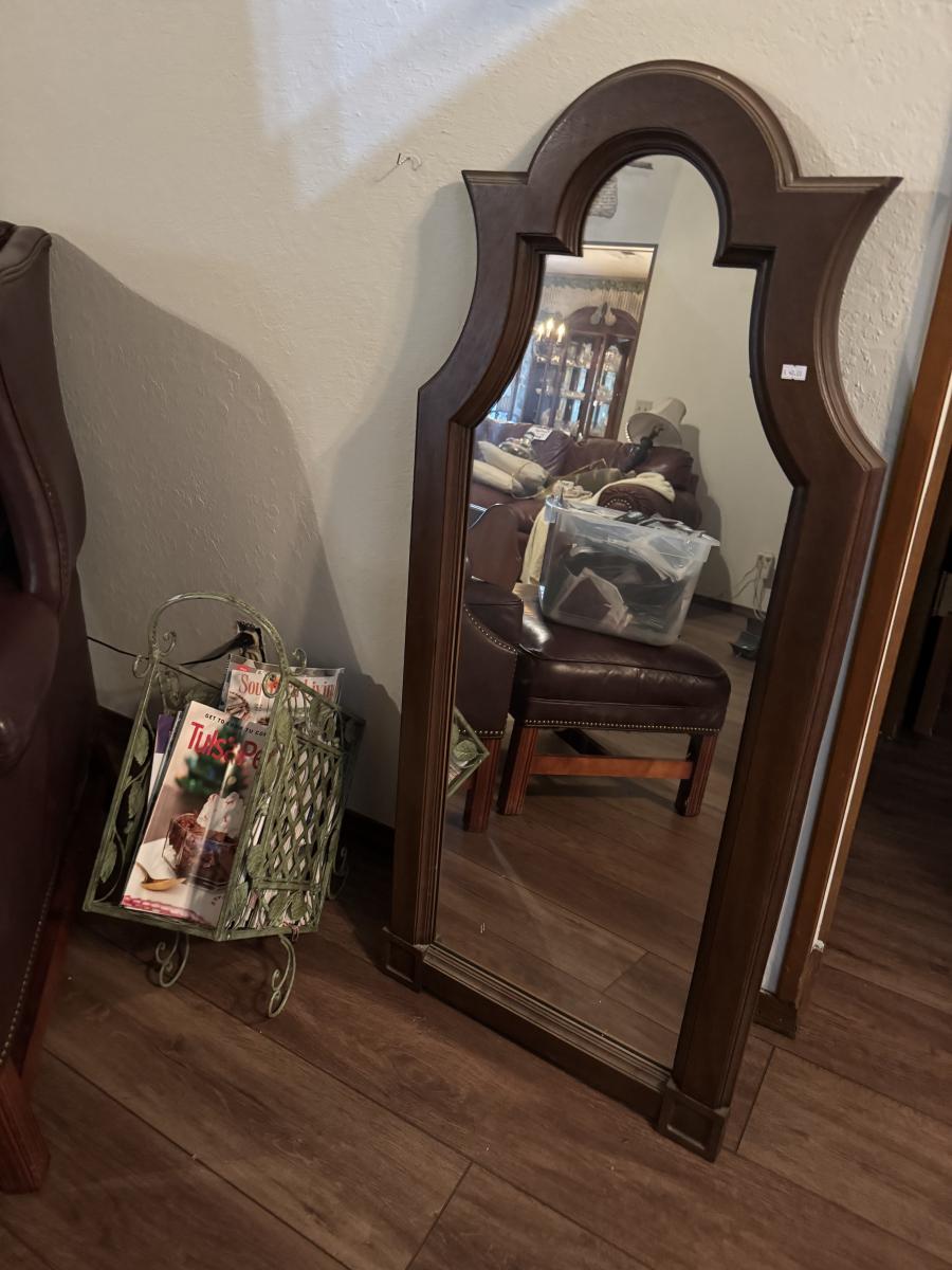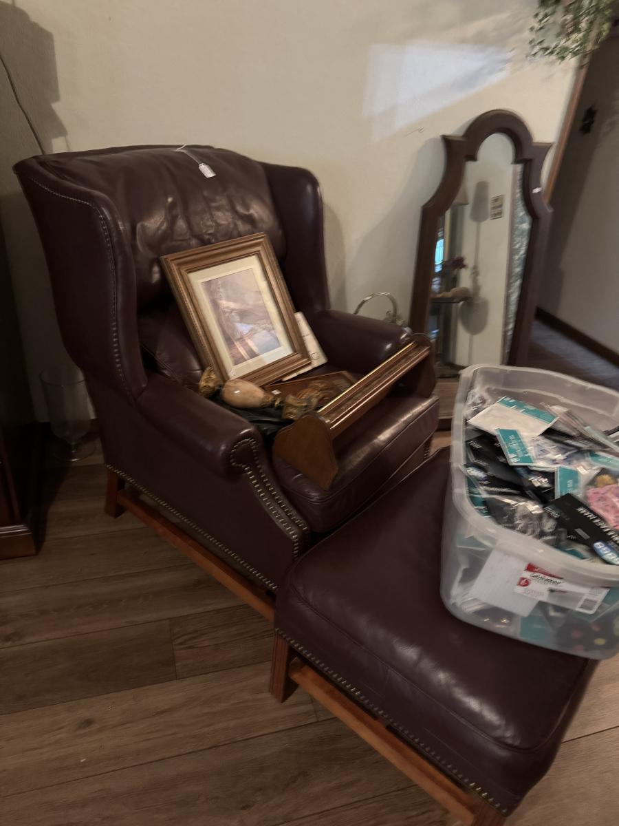 BURGUNDY CHAIR, OTTOMAN, MIRROR LOT