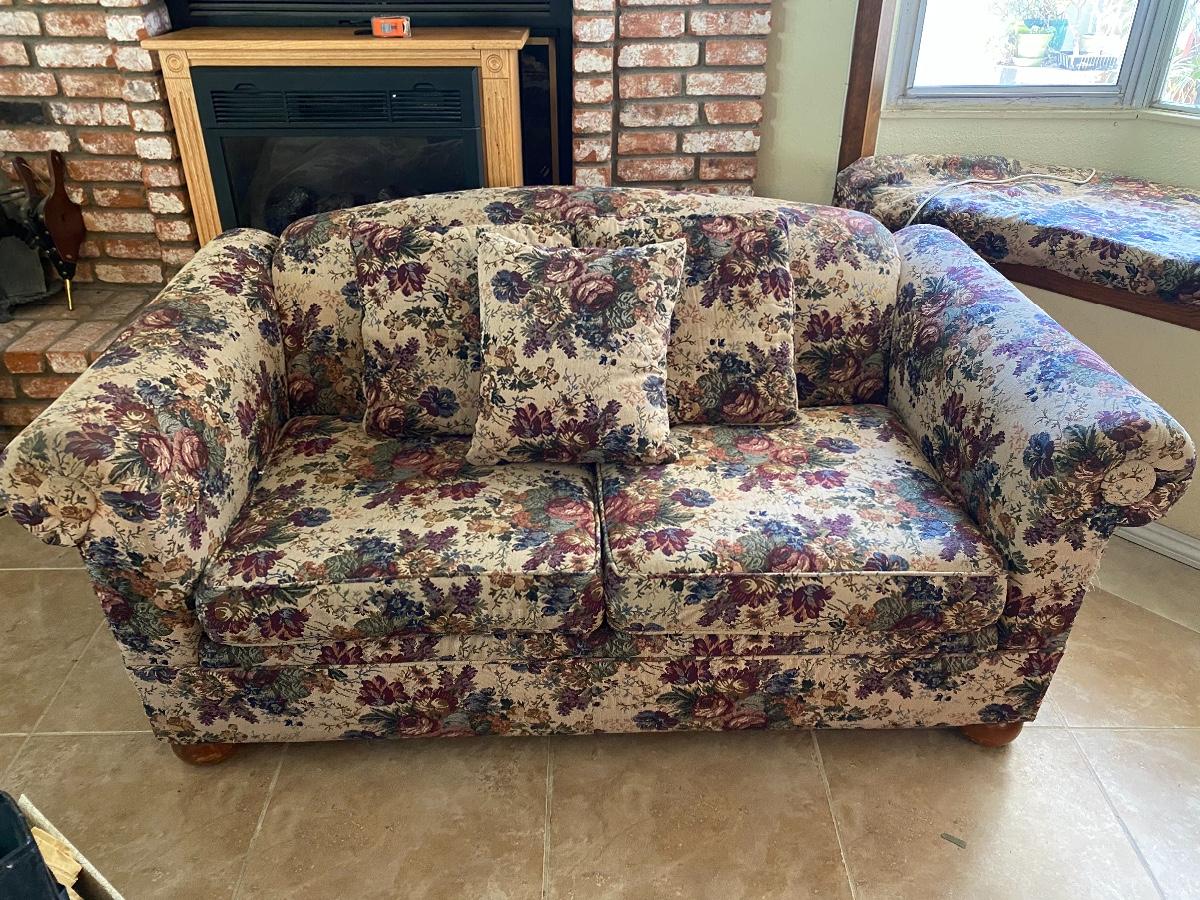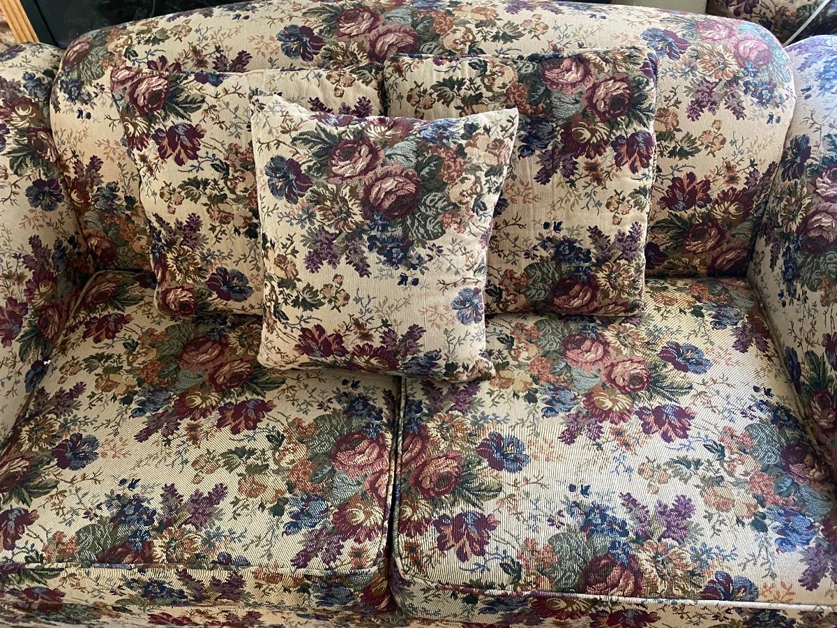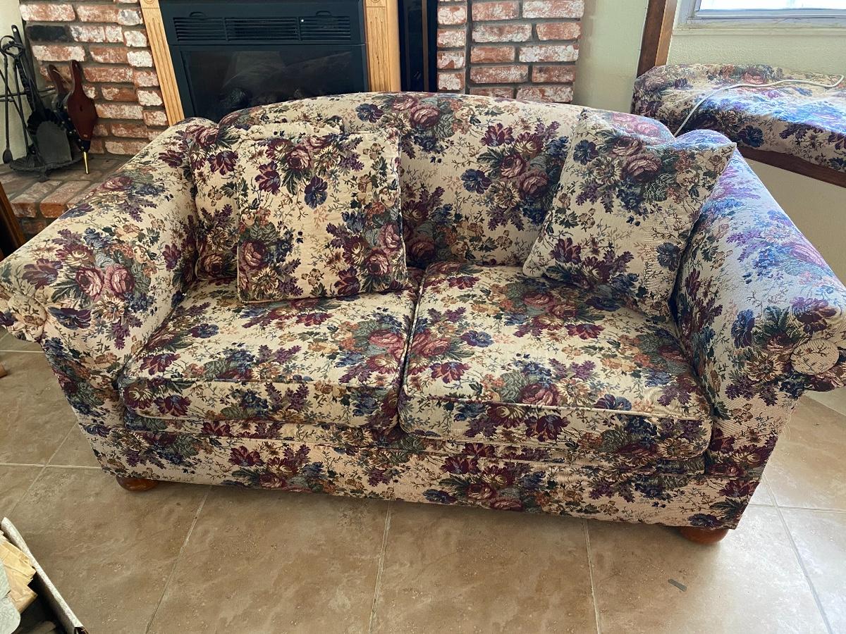 Burgundy floral overstuffed loveseat couch. Fair condition. Some snags on corner from cat. 63" length.