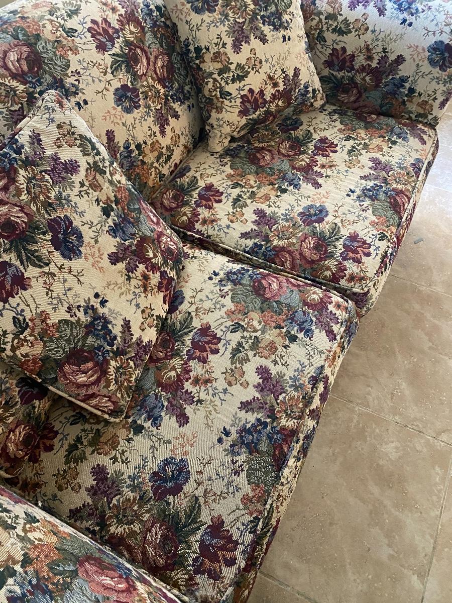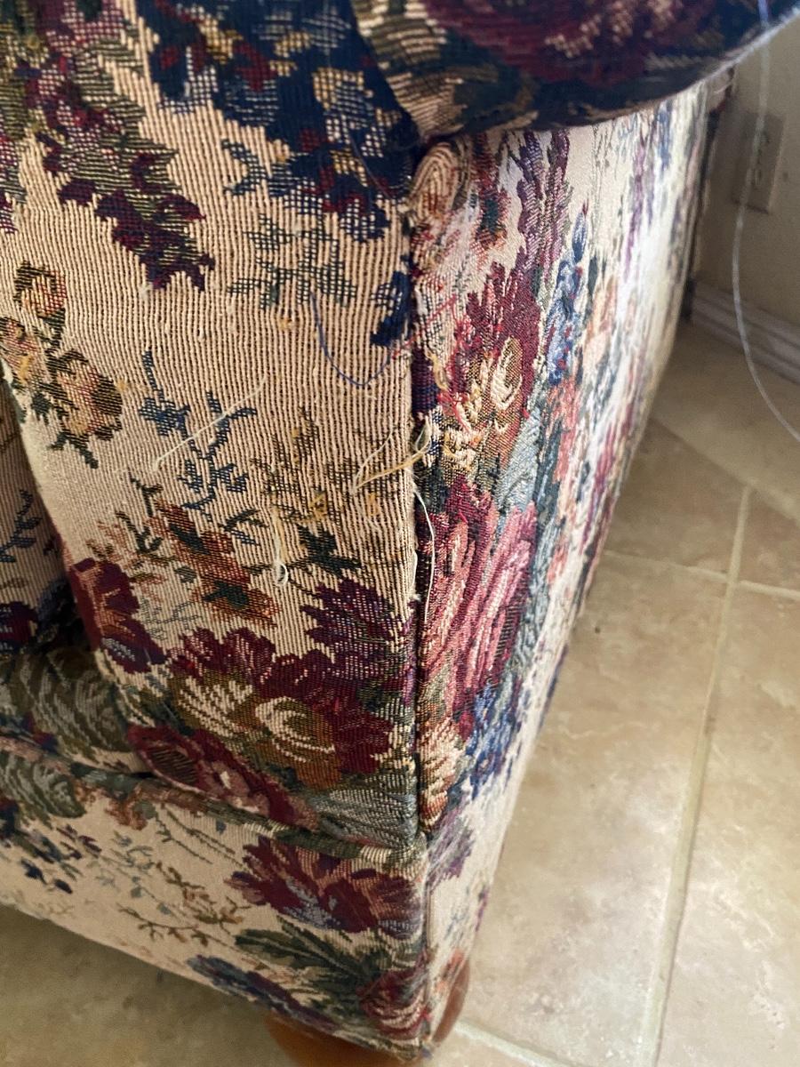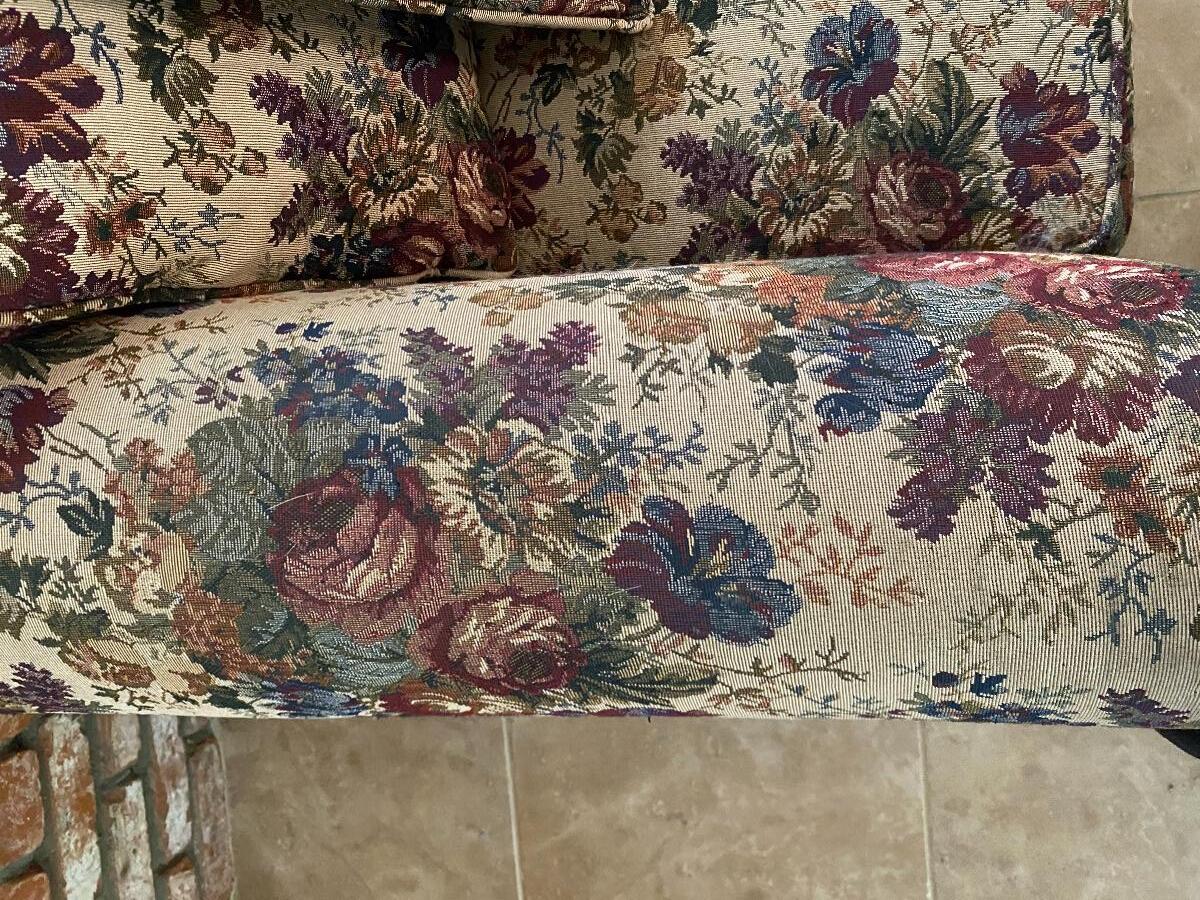 Burgundy floral overstuffed loveseat couch. Fair condition. Some snags on corner from cat. 63" length.