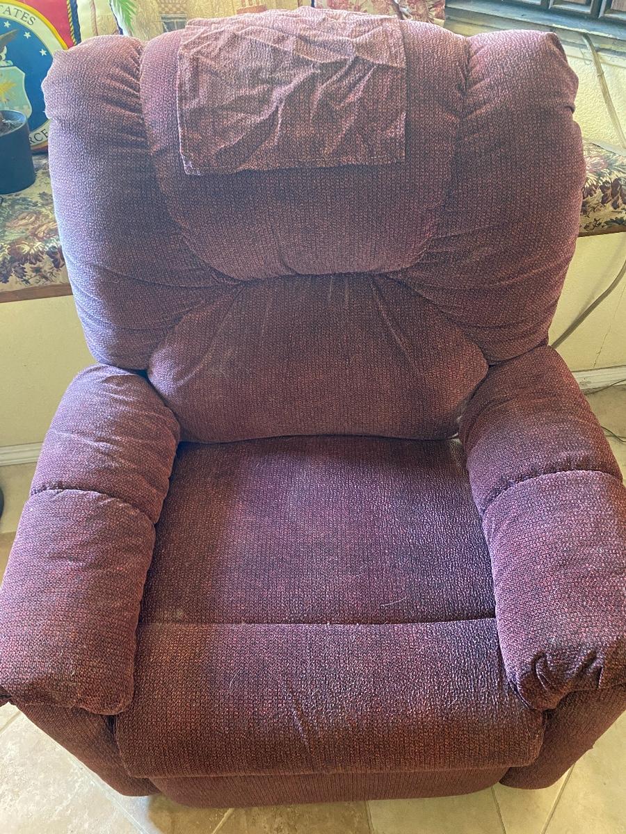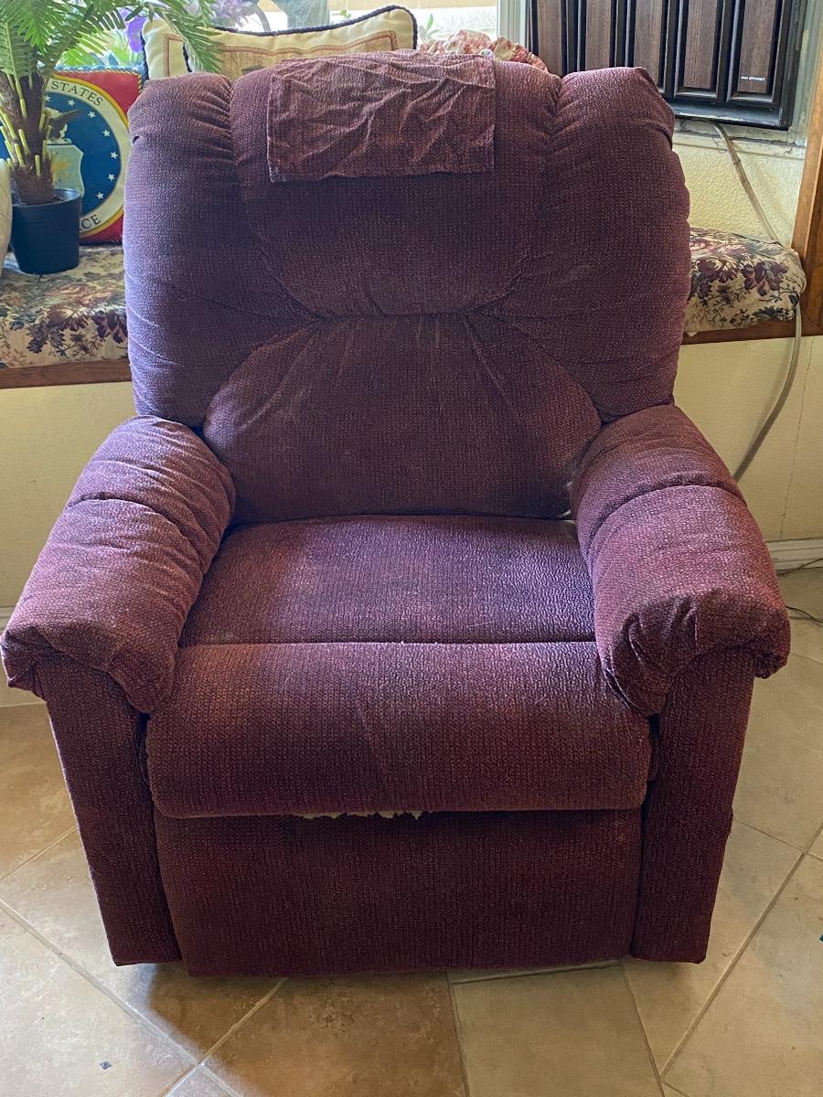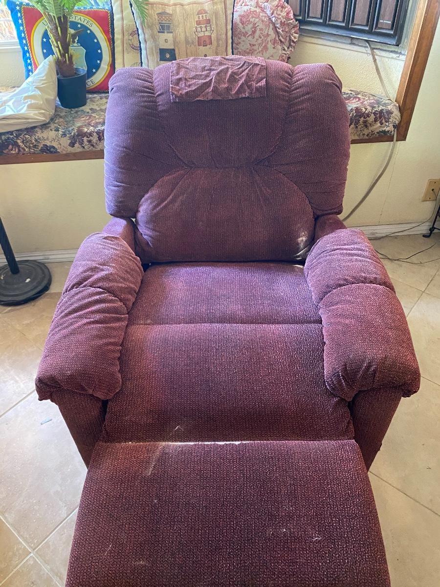 Burgundy violet recliner chair. It is a power chair but missing the outlet part of cord. May actually be a lift and recline chair. Fair condition.