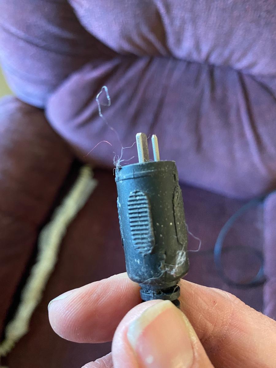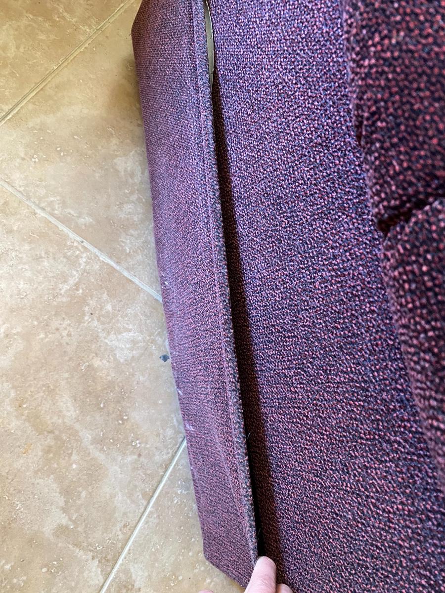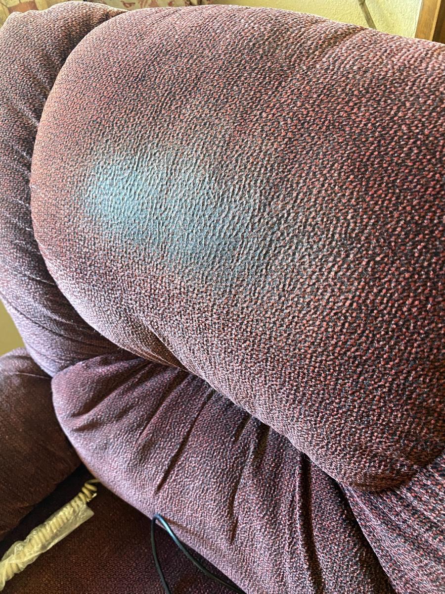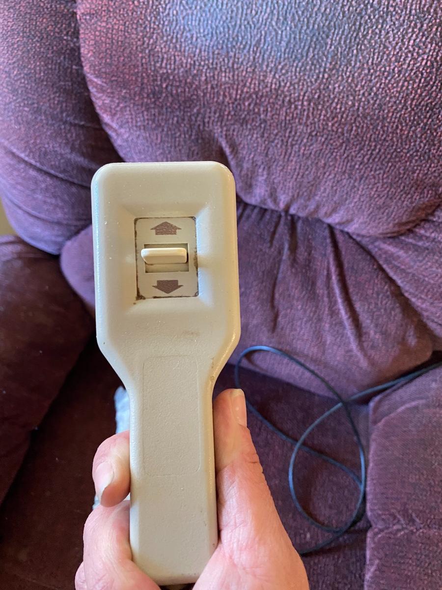 Burgundy violet recliner chair. It is a power chair but missing the outlet part of cord. May actually be a lift and recline chair. Fair condition.