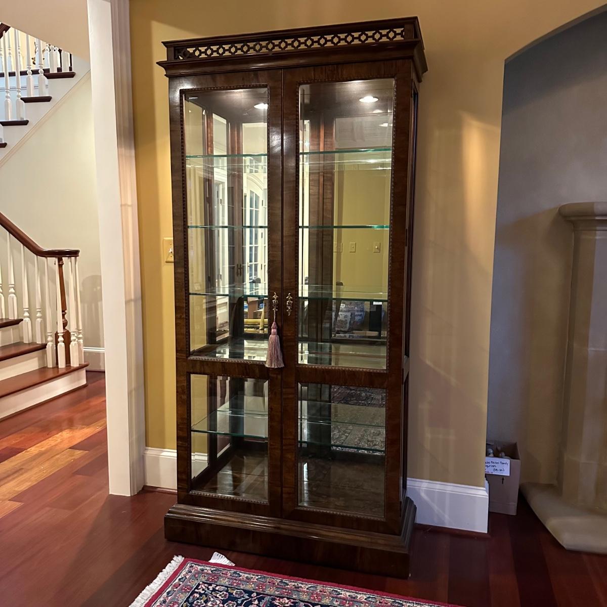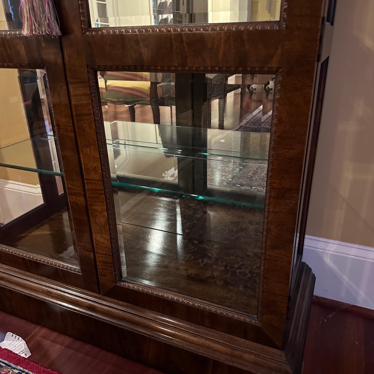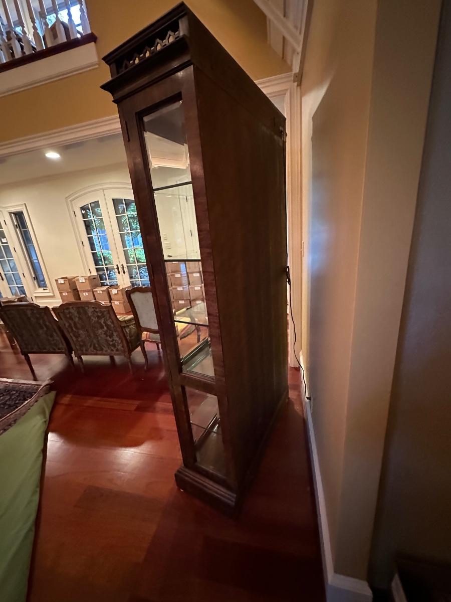 Burl wood veneer display case has four adjustable glass shelves, mirrored back and is lit with four adjustable brightness bulbs. Measures 41” x 16” x 82”H. Local pickup only. Winning bidder must bring assistance to help move and load this item due to its weight and/or size.