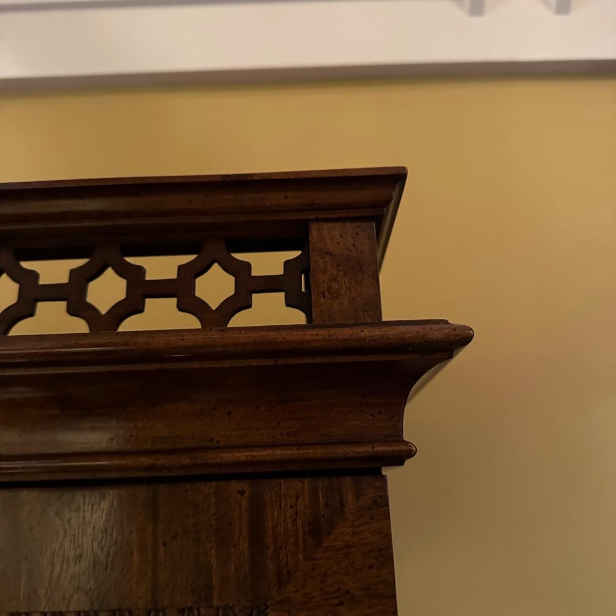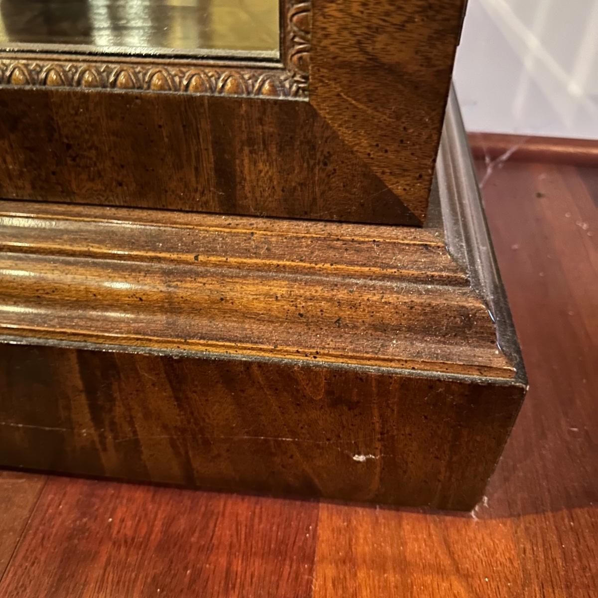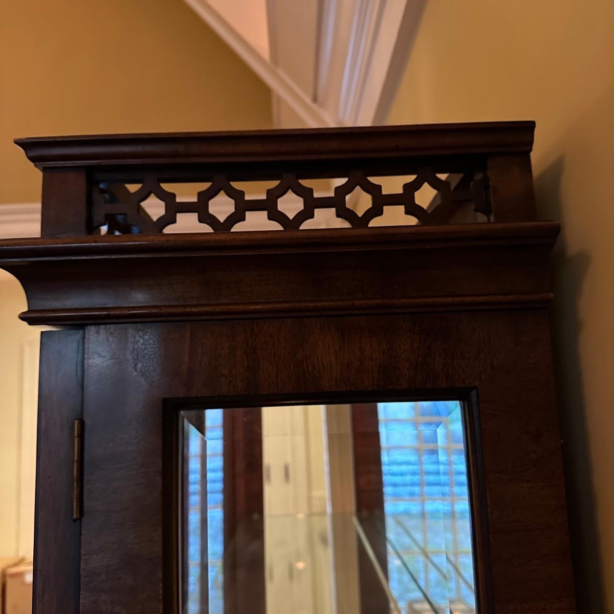 Burl wood veneer display case has four adjustable glass shelves, mirrored back and is lit with four adjustable brightness bulbs. Measures 41” x 16” x 82”H. Local pickup only. Winning bidder must bring assistance to help move and load this item due to its weight and/or size.