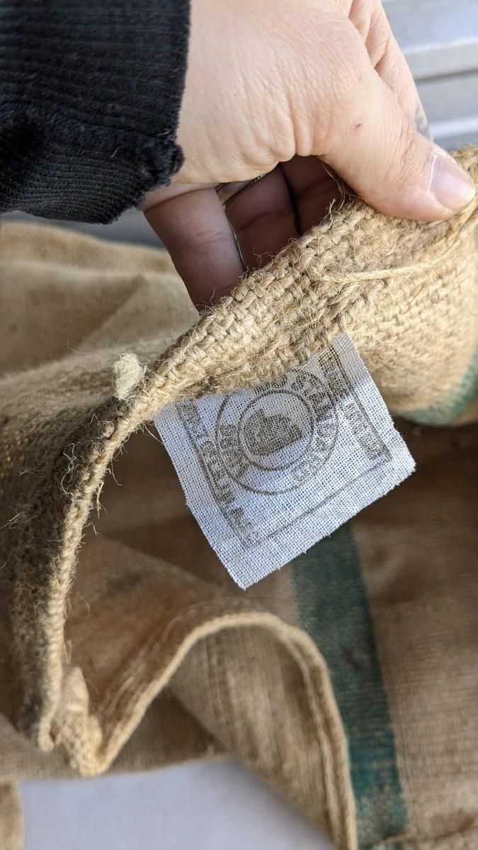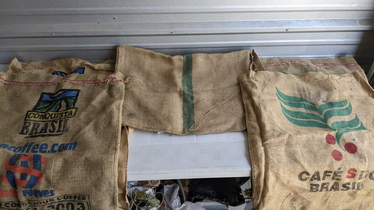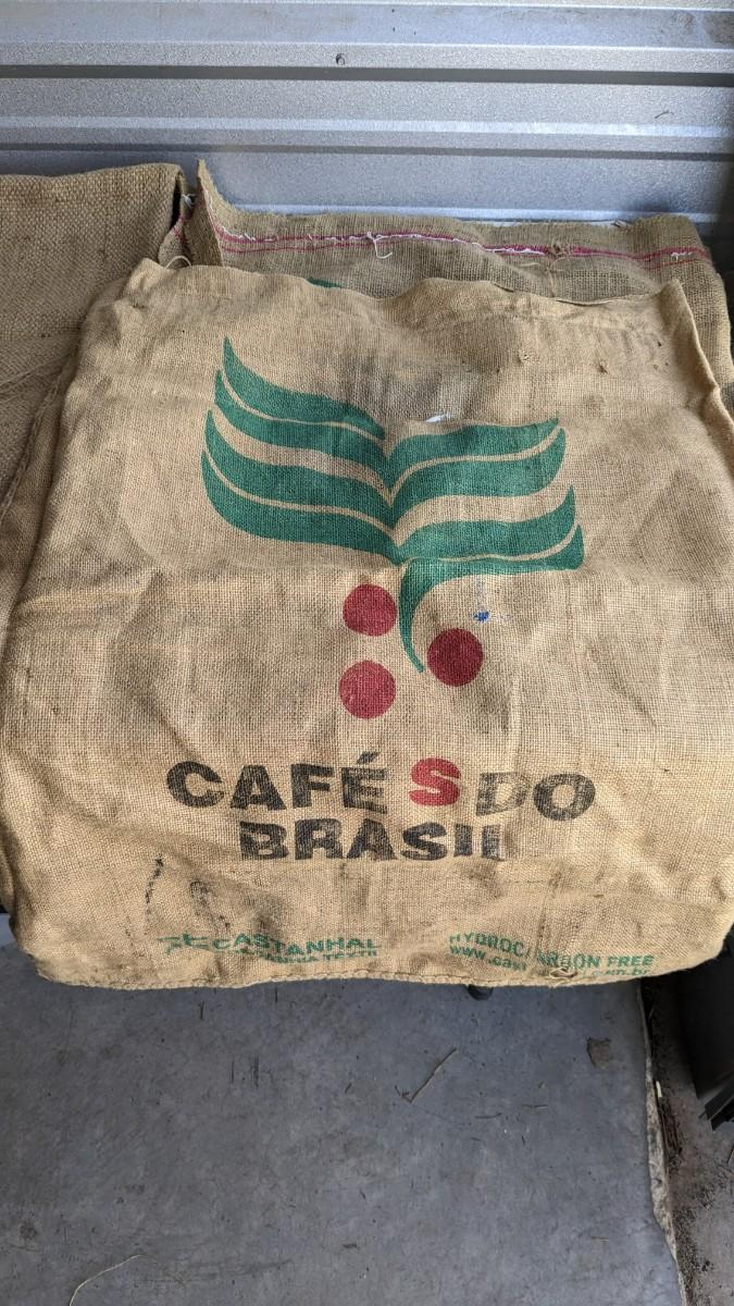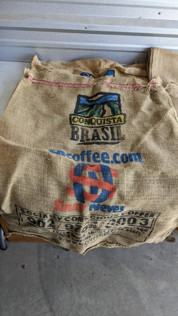 7 burlap pieces. All used to be bags with 2 having been separated but could easily be repaired or upcycled. 4 marked Conquista Brazil Coffee bags, one unmarked. Note: 2 more were added after photos were taken. 2616