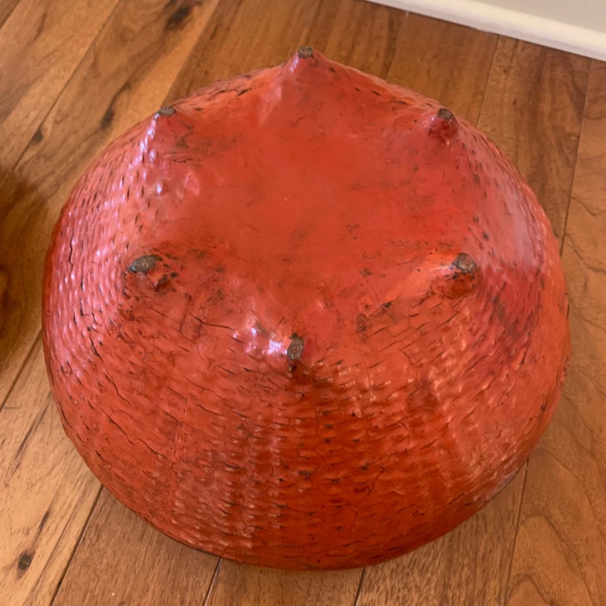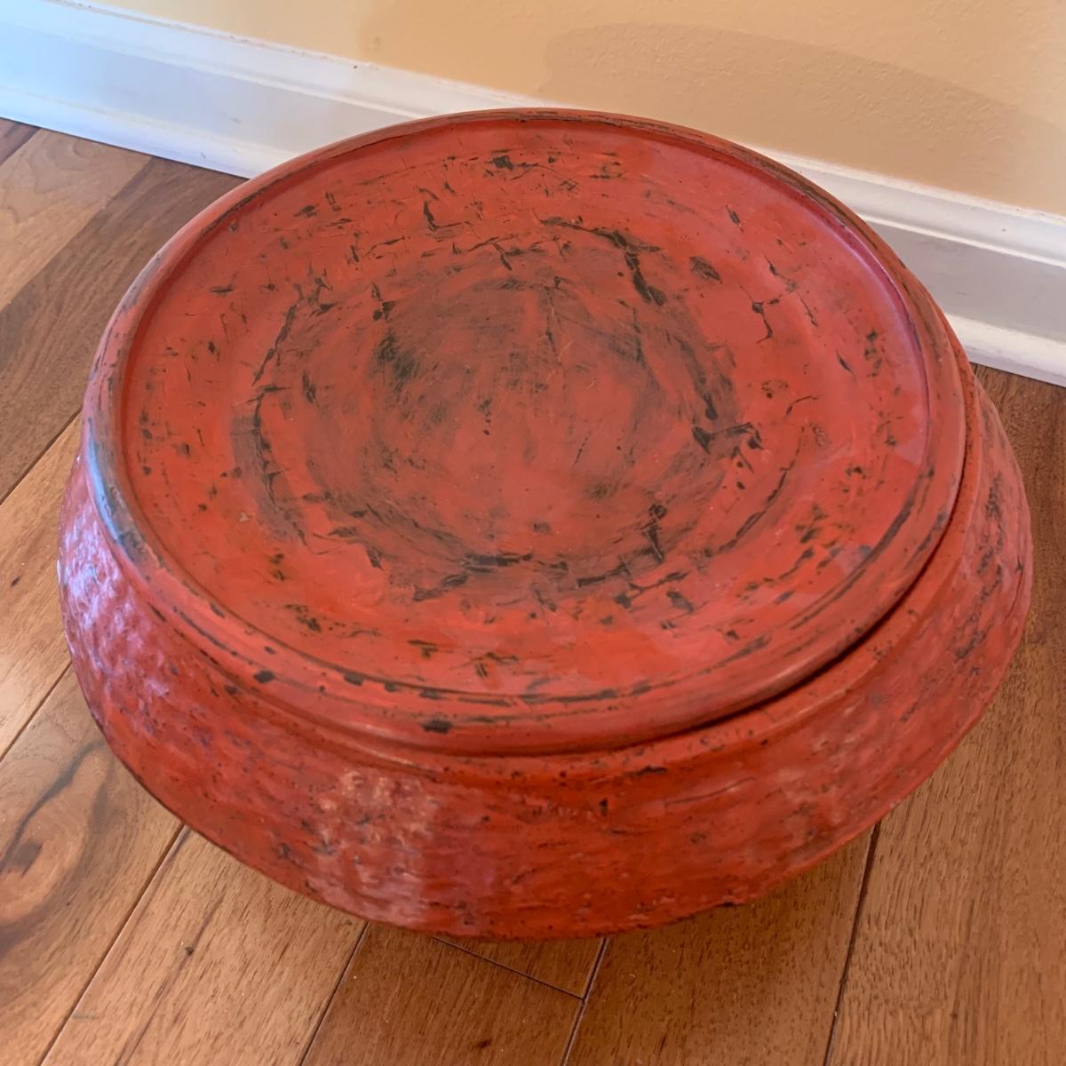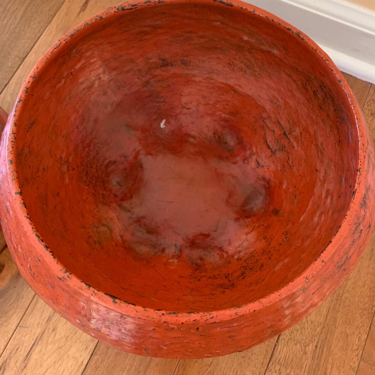 Three ceremonial offering vessels. Label suggests they are Burmese. Each piece is painted cinnabar red with lacquered finished. Unique pieces. Please see photos for more details. Largest vessel measures approximately, 13”D x 30.4”H.