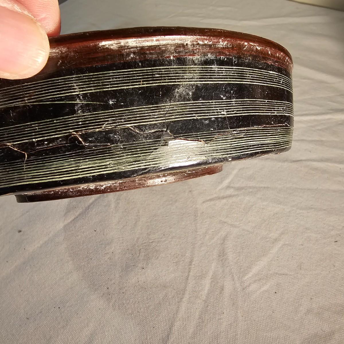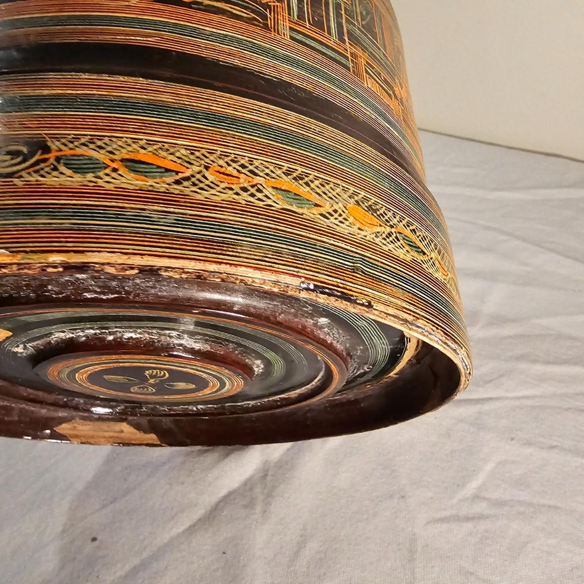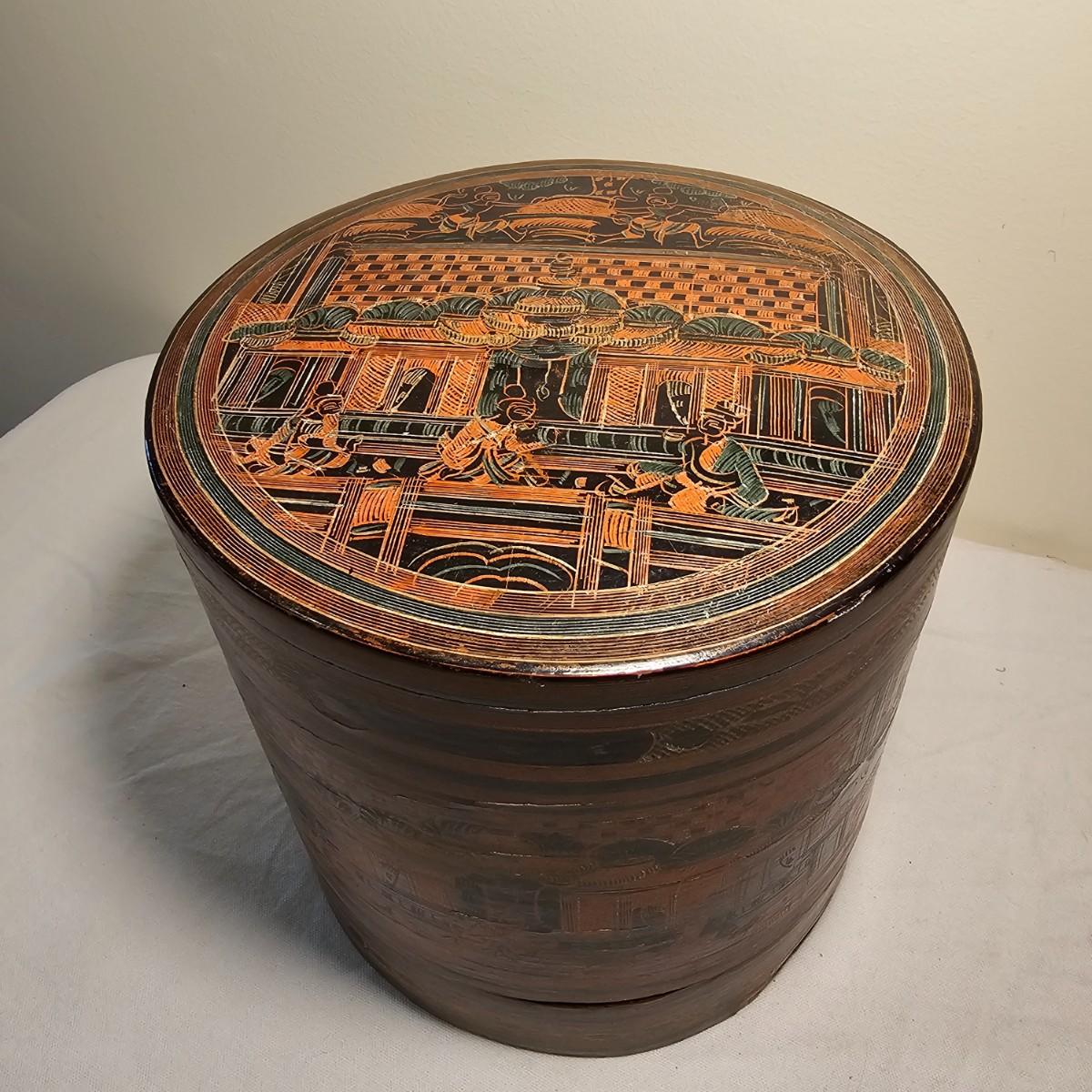 A highly decorated lacquer betel nut box with scenes, designs and more. Box measures 8"D x 8"H, has lift off top and two smaller trays inside. Trays are worn and have some cracking, as does the outside of the box. Also included is a lacquer plaque of a Hindu goddess sitting in repose. Decorated edge design all around and hanging hooks attached, this item is 12" x 15"H and about a 1/4" thick. See photos for details. Shipping available.