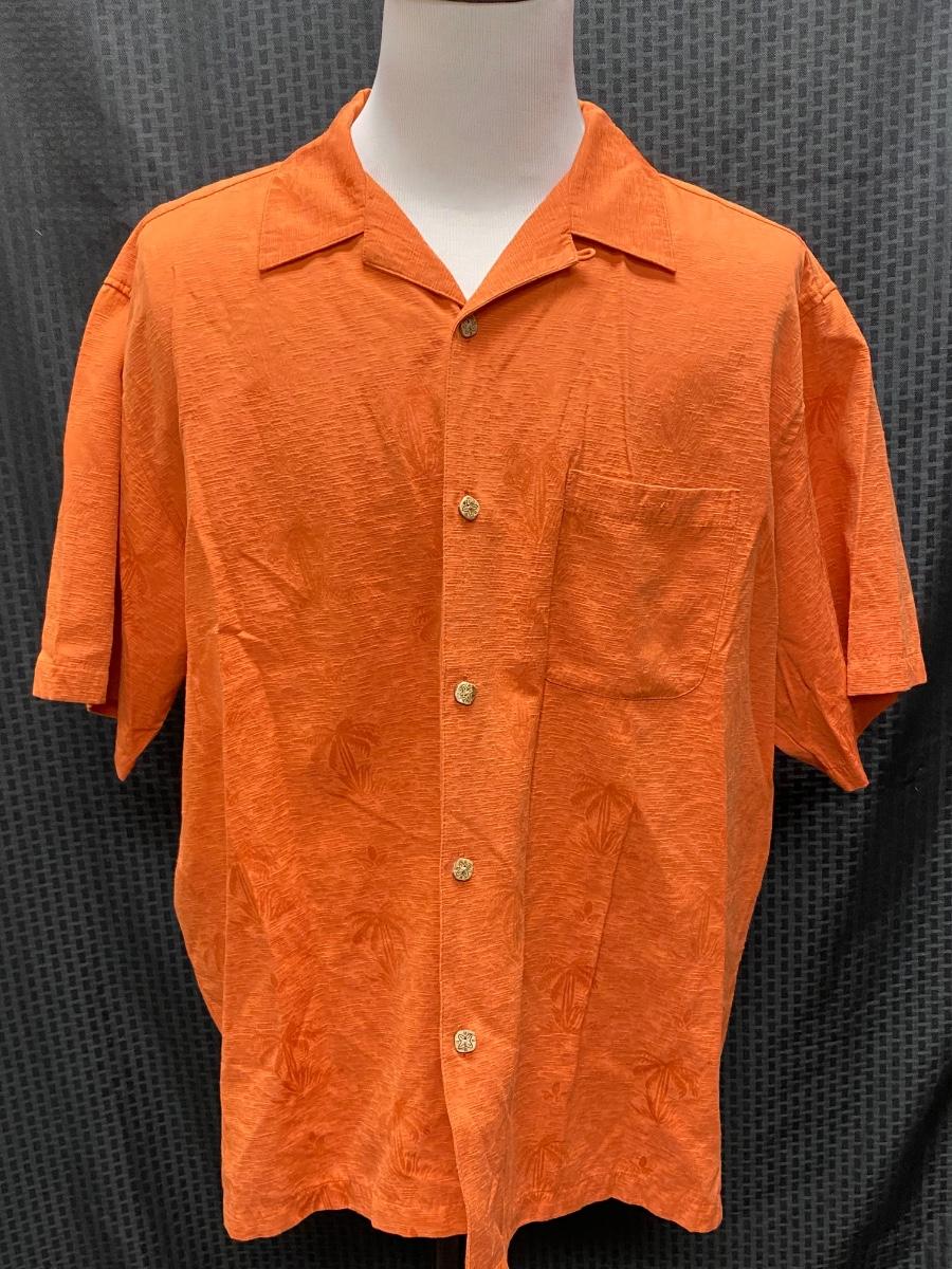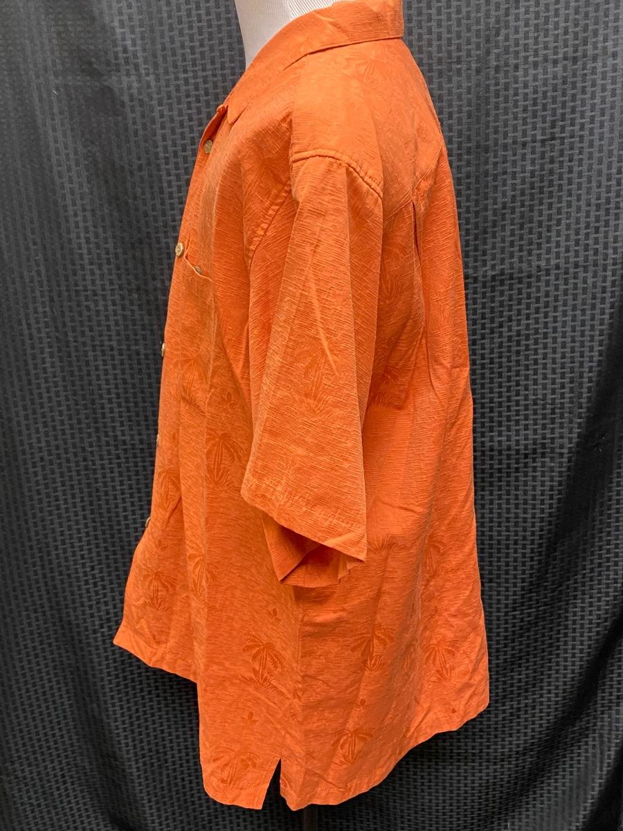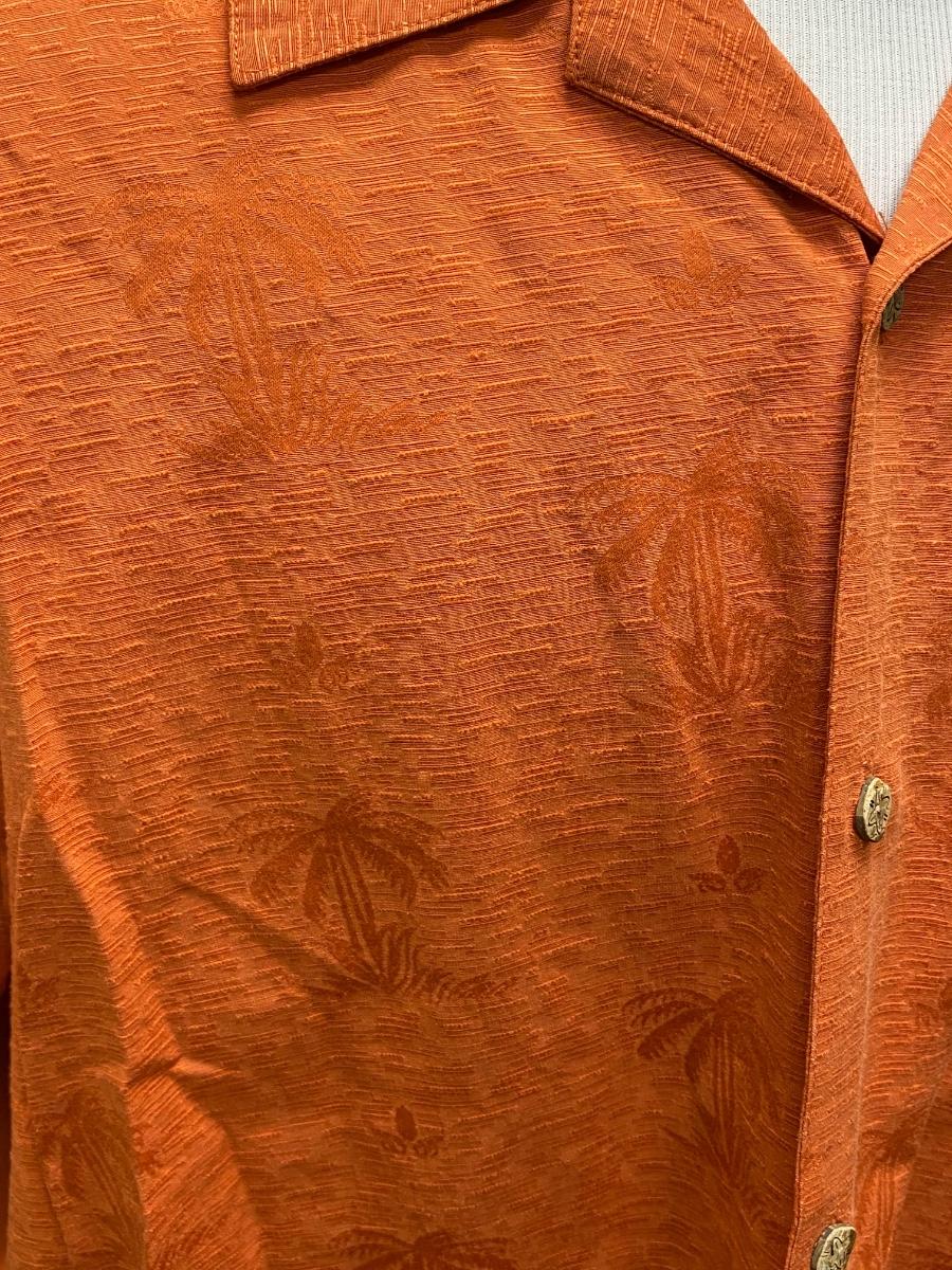 Burnt Orange Button Front Men's Hawaiian Shirt. Size XXL from Gordon Clothing Co. Made with a palm tree pattern jacquard material, cotton poly blend.