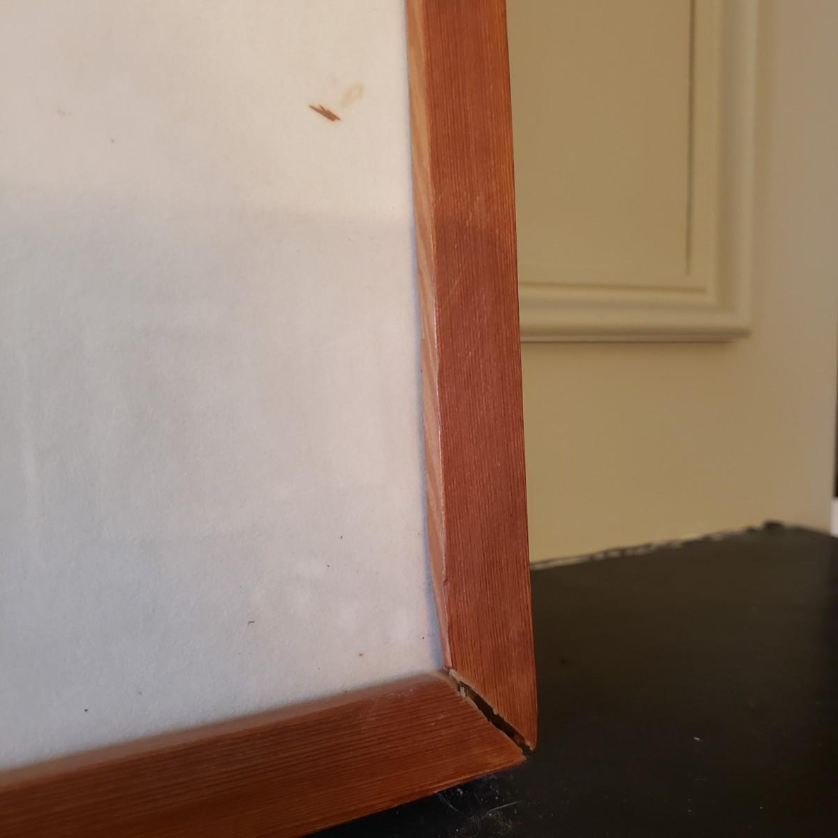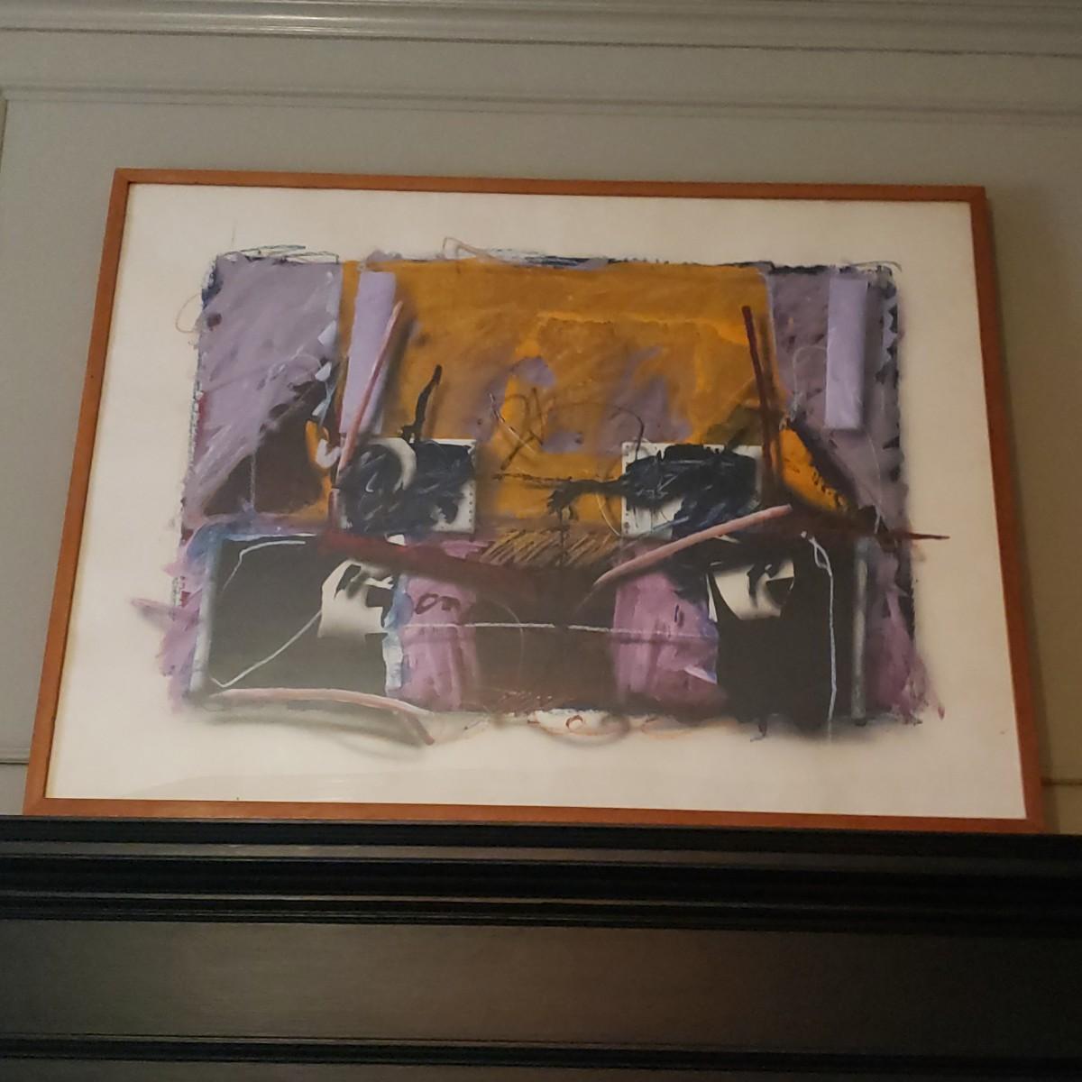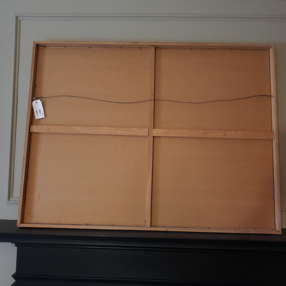 This large 49" x 37" mixed art piece has "Burnt Orange" on the bottom left corner. The glass covered frame is a light wood. One corner is separated, see picture.