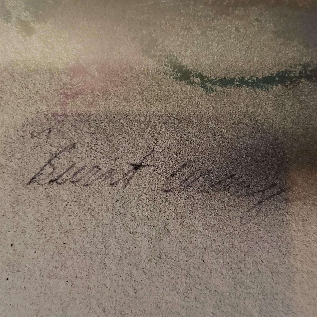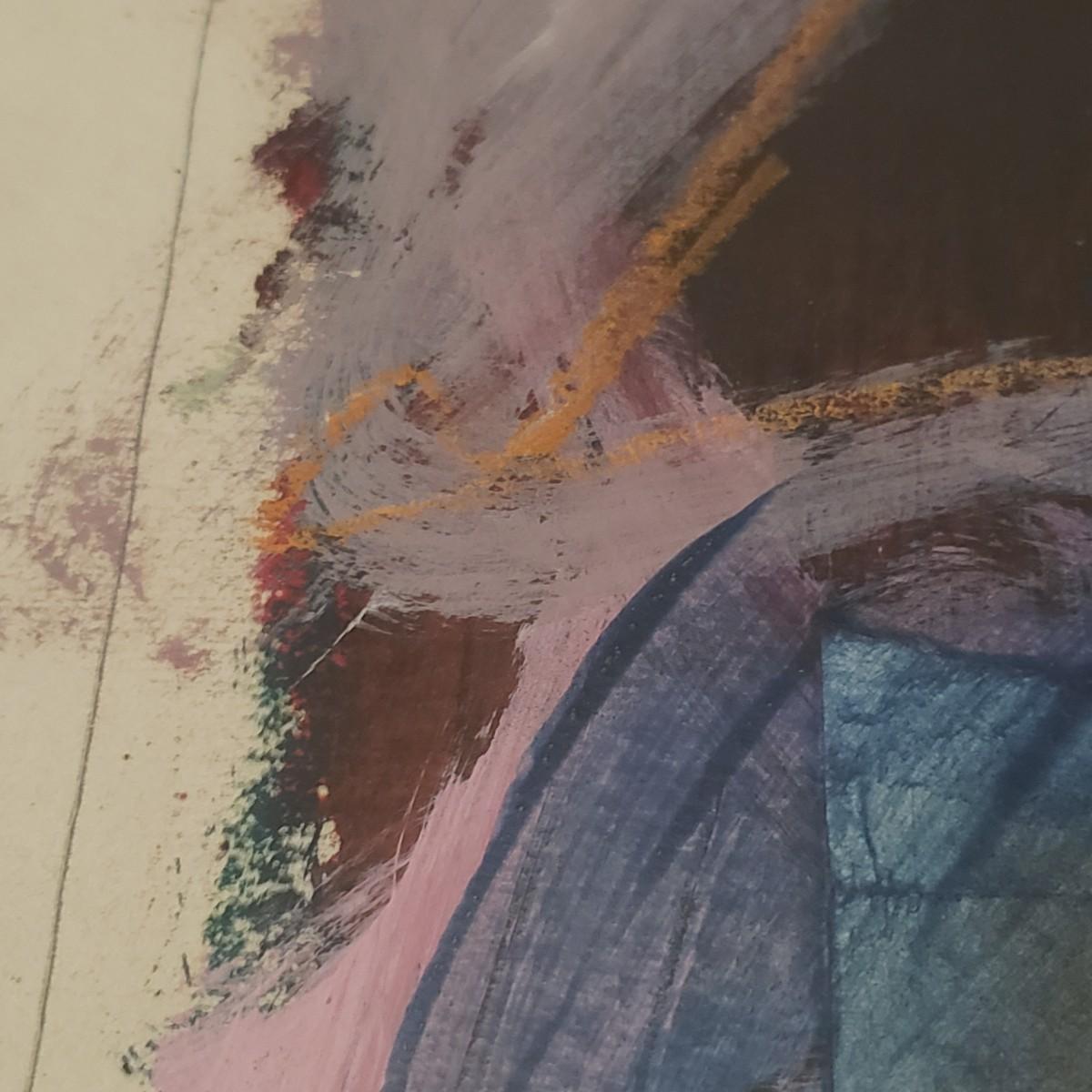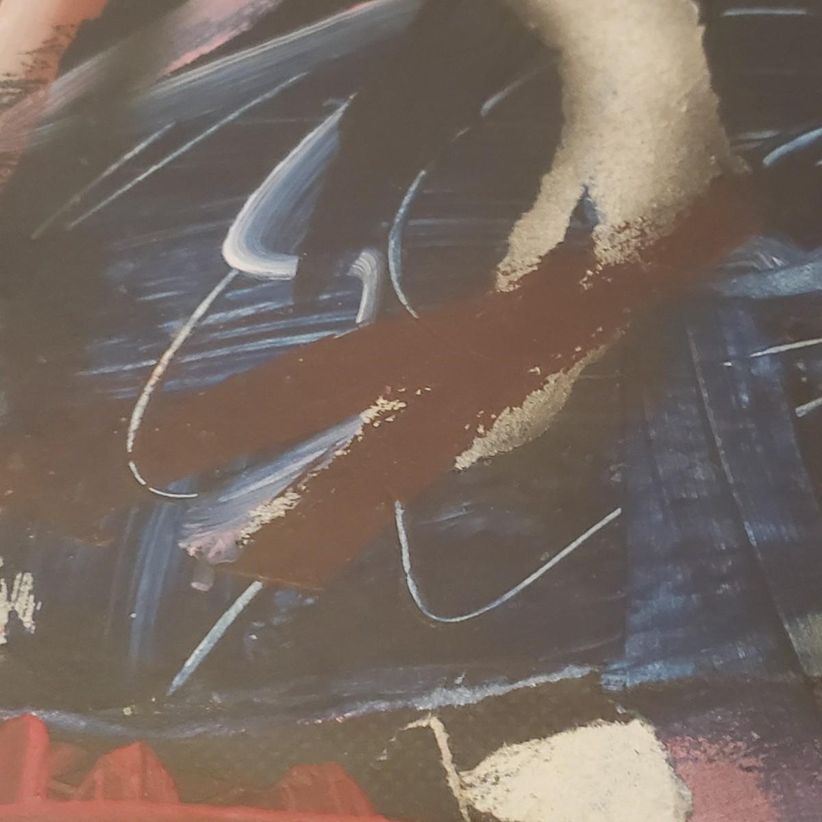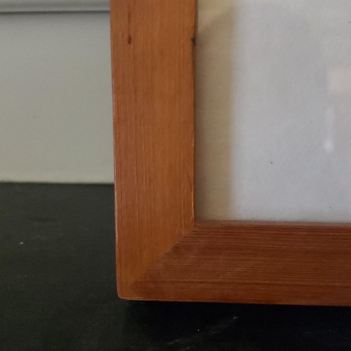 This large 49" x 37" mixed art piece has "Burnt Orange" on the bottom left corner. The glass covered frame is a light wood. One corner is separated, see picture.