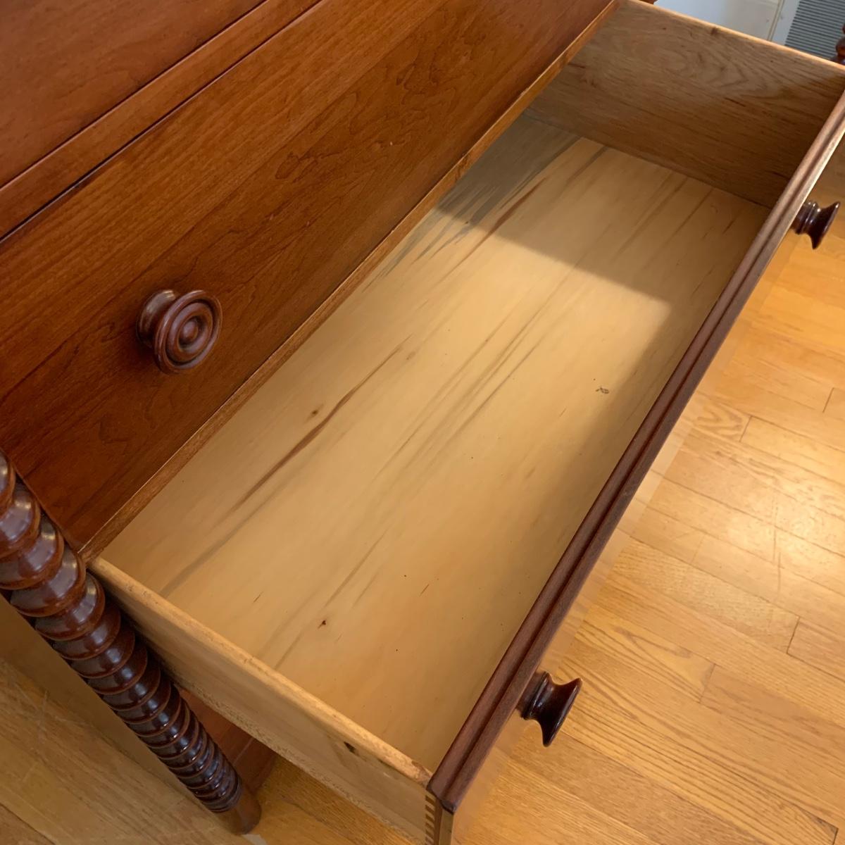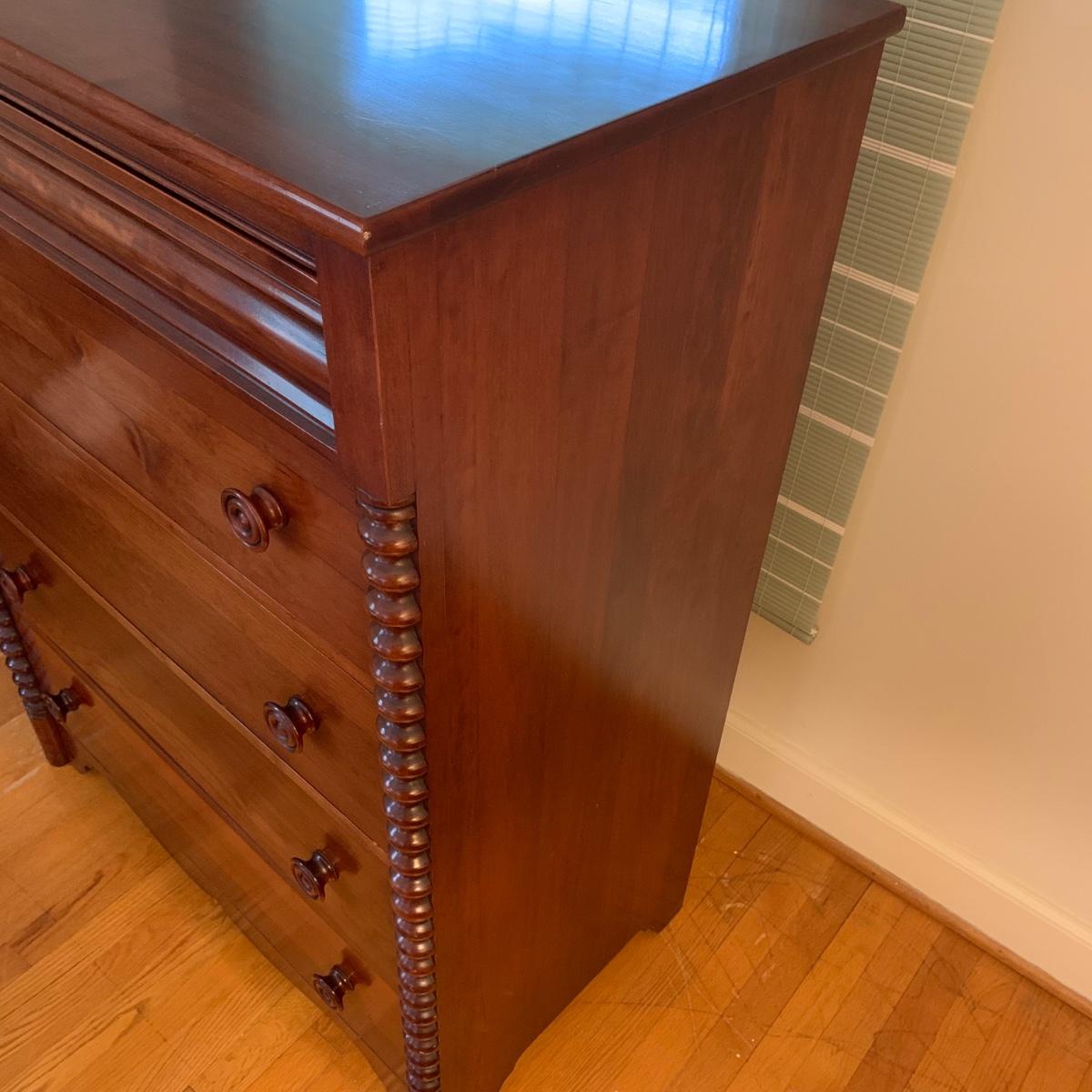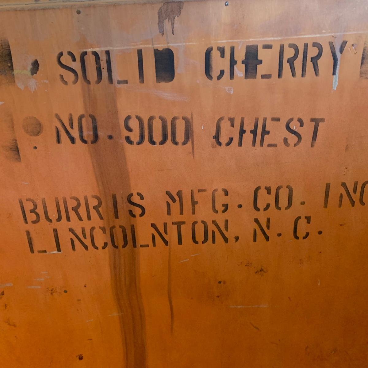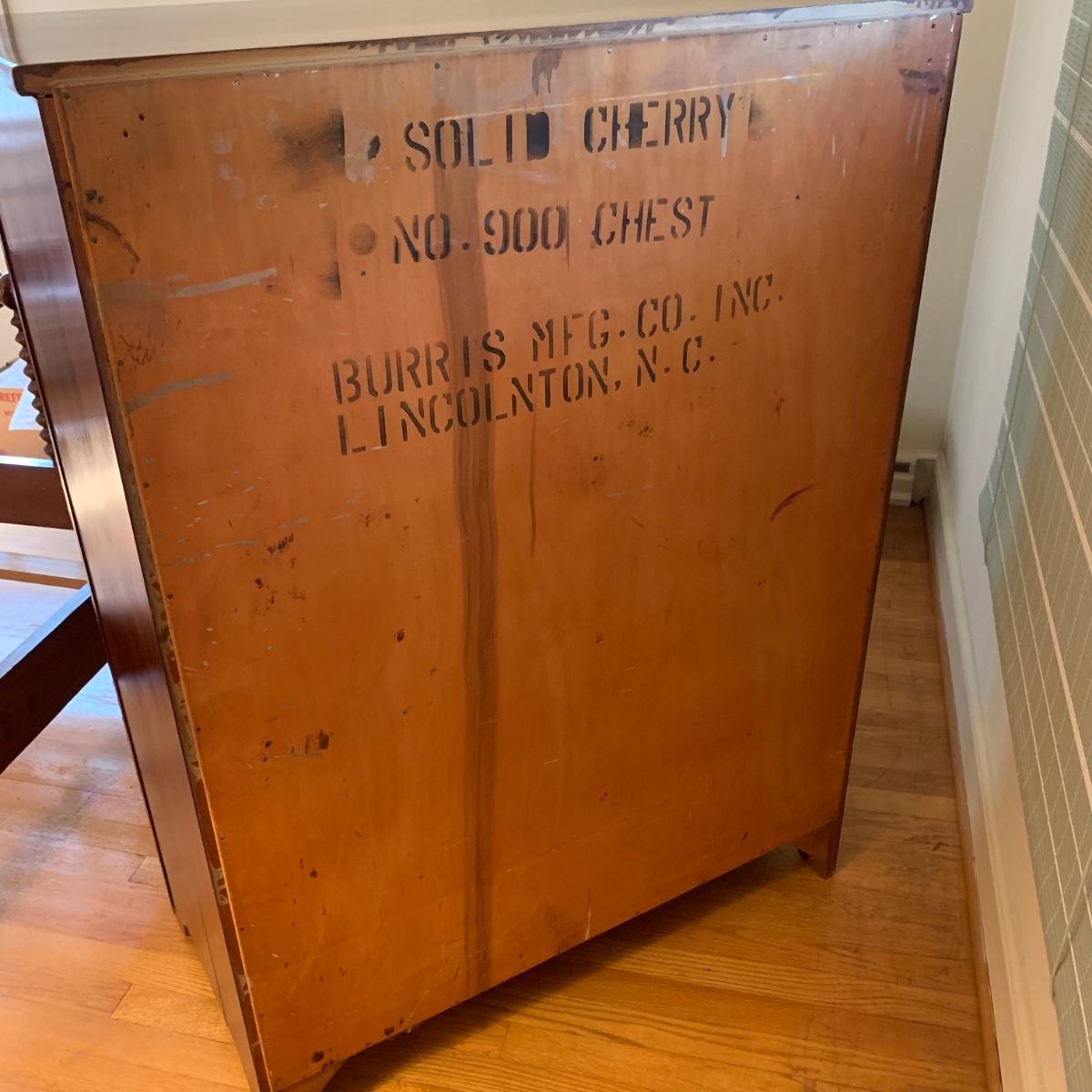 Beautiful solid cherry wood five drawer chest of drawers (No. 900) from Burris Manufacturing Co. in Lincolnton, NC. All drawers are dovetailed. The chest measures 36” x 20” x 48.5”. It is in very good condition. There are just a few very small scratches on the top surface, noted in photos. Local pickup only. The winning bidder will need to bring help to move this item down one flight of stairs.