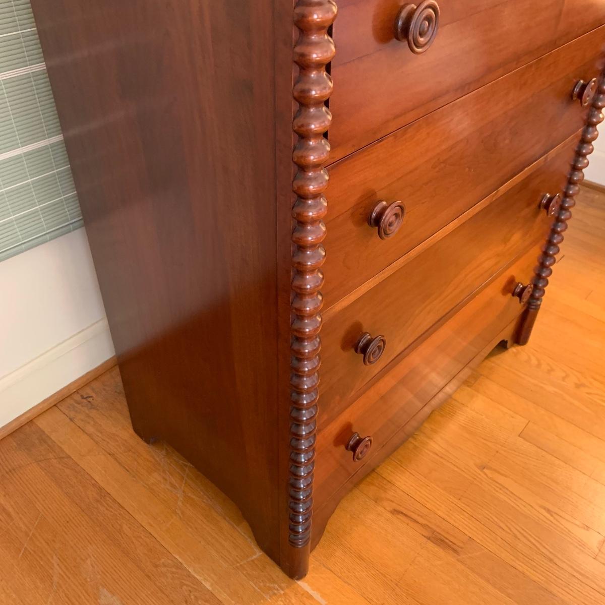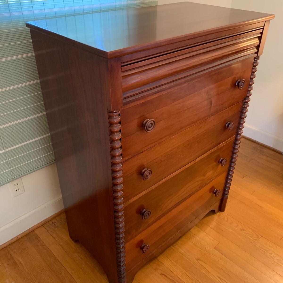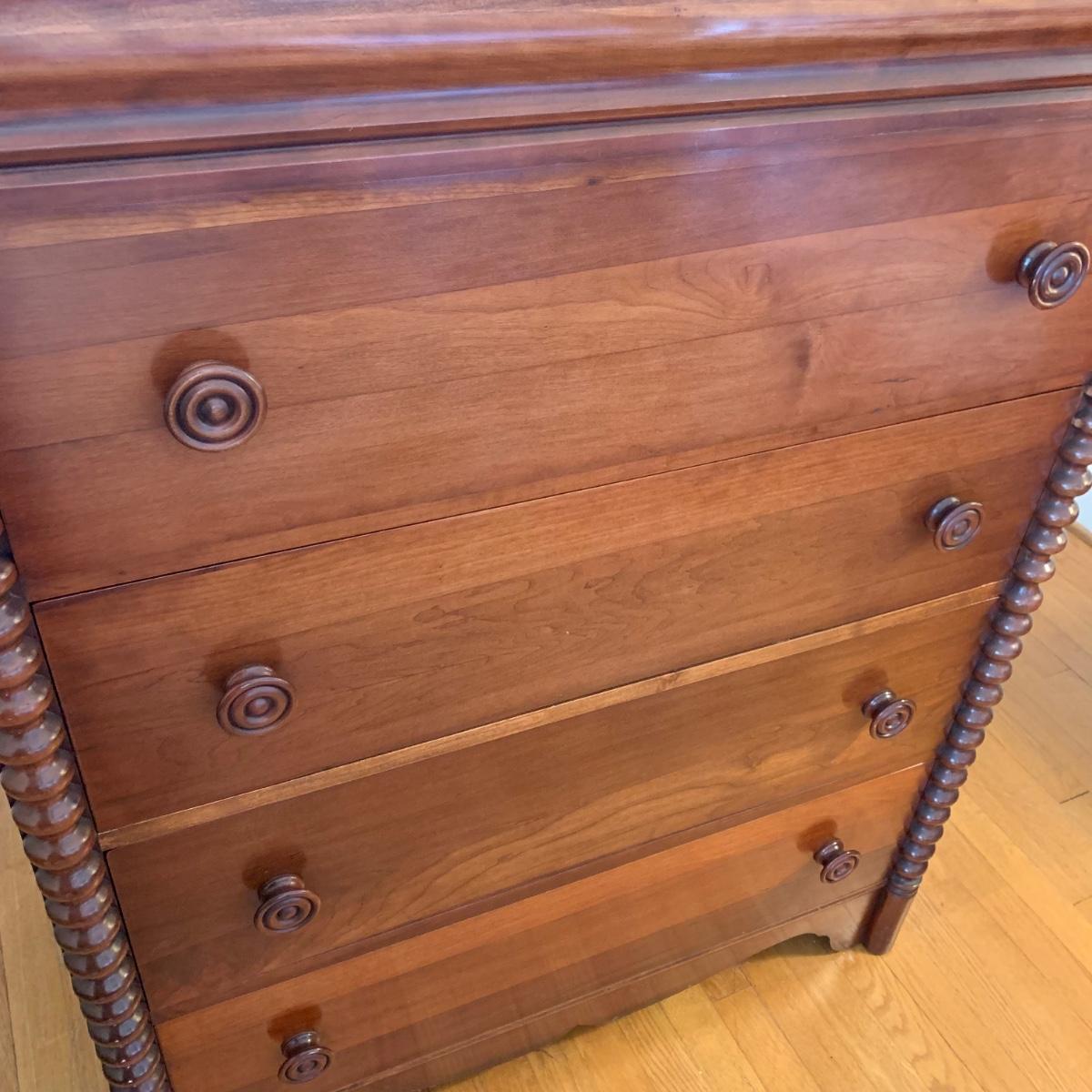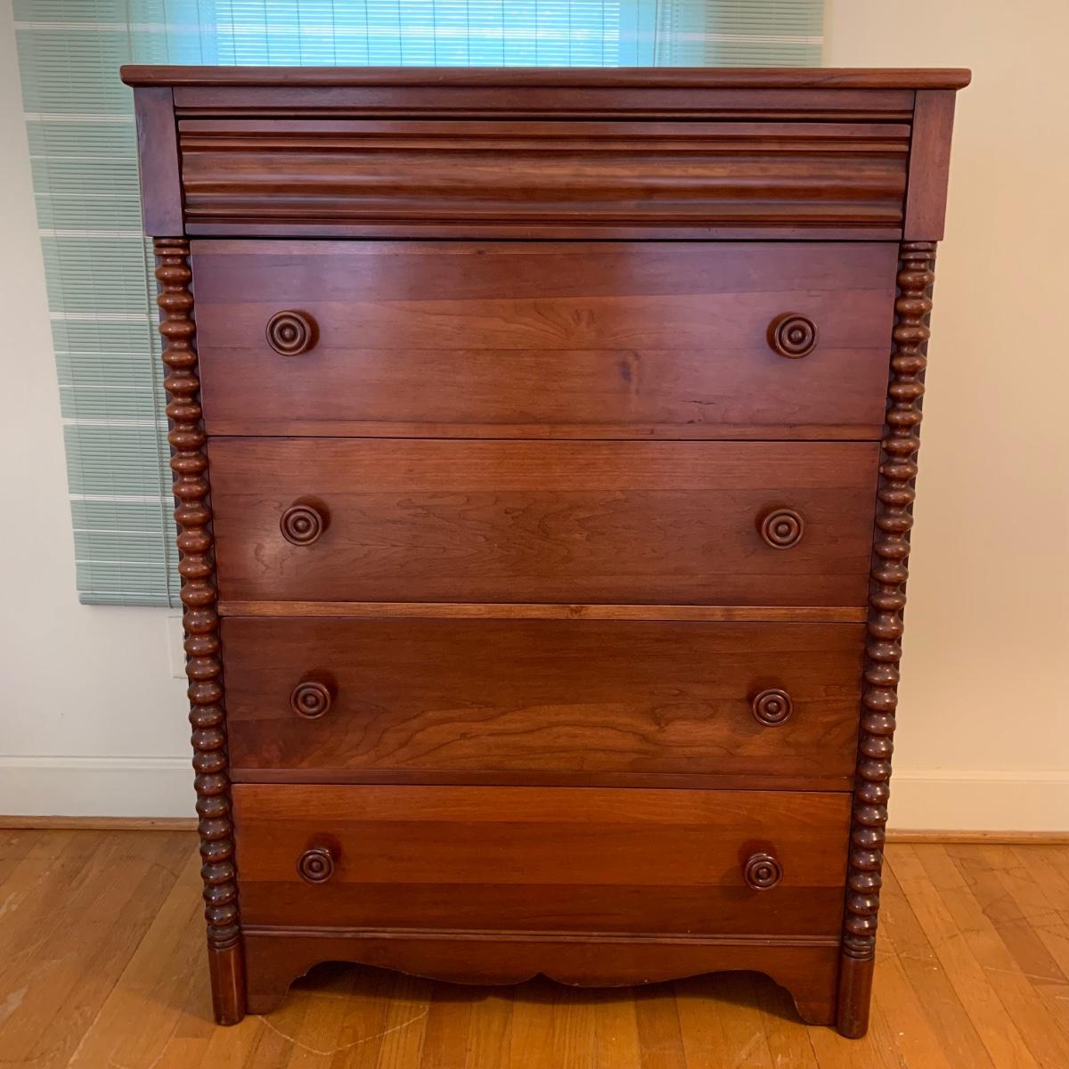 Beautiful solid cherry wood five drawer chest of drawers (No. 900) from Burris Manufacturing Co. in Lincolnton, NC. All drawers are dovetailed. The chest measures 36” x 20” x 48.5”. It is in very good condition. There are just a few very small scratches on the top surface, noted in photos. Local pickup only. The winning bidder will need to bring help to move this item down one flight of stairs.