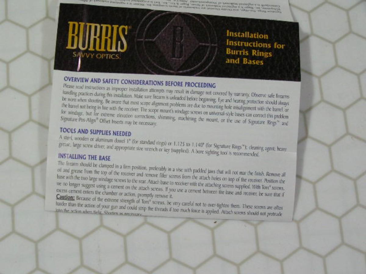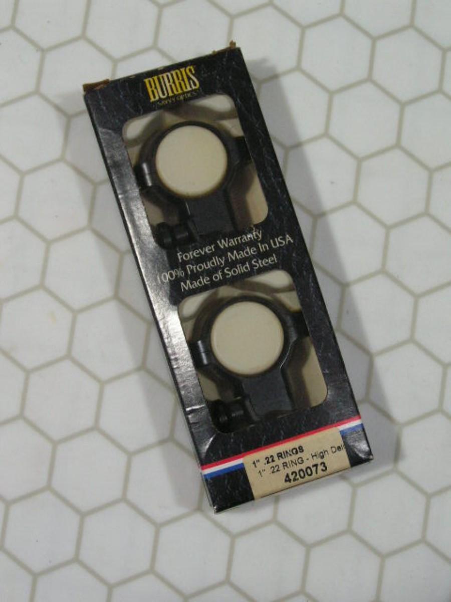 Burris scope rings. Pair for 22LR rifle. 3/8” dovetail high mount style. Strong ALL steel construction. W/instructions & tool, original boxF. Pre-owned, Like New in box.