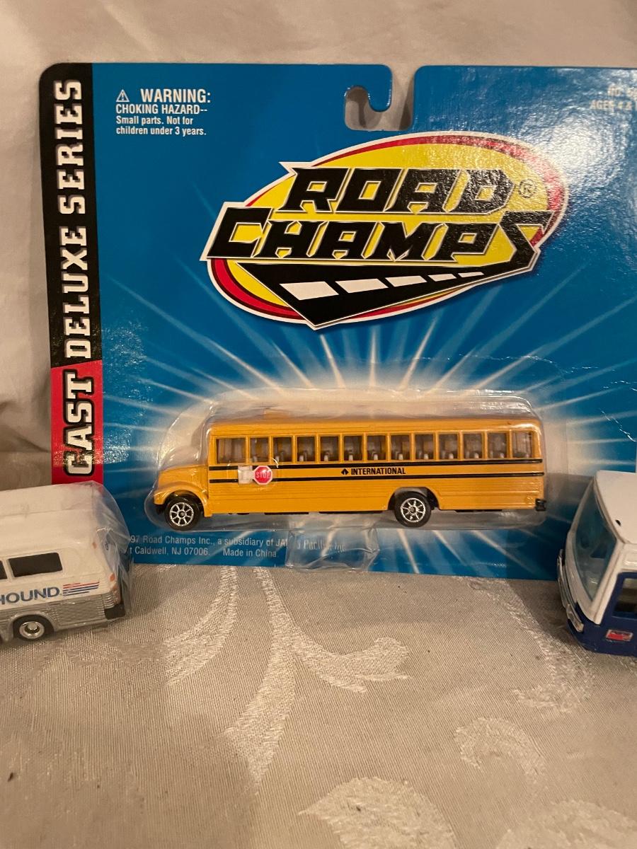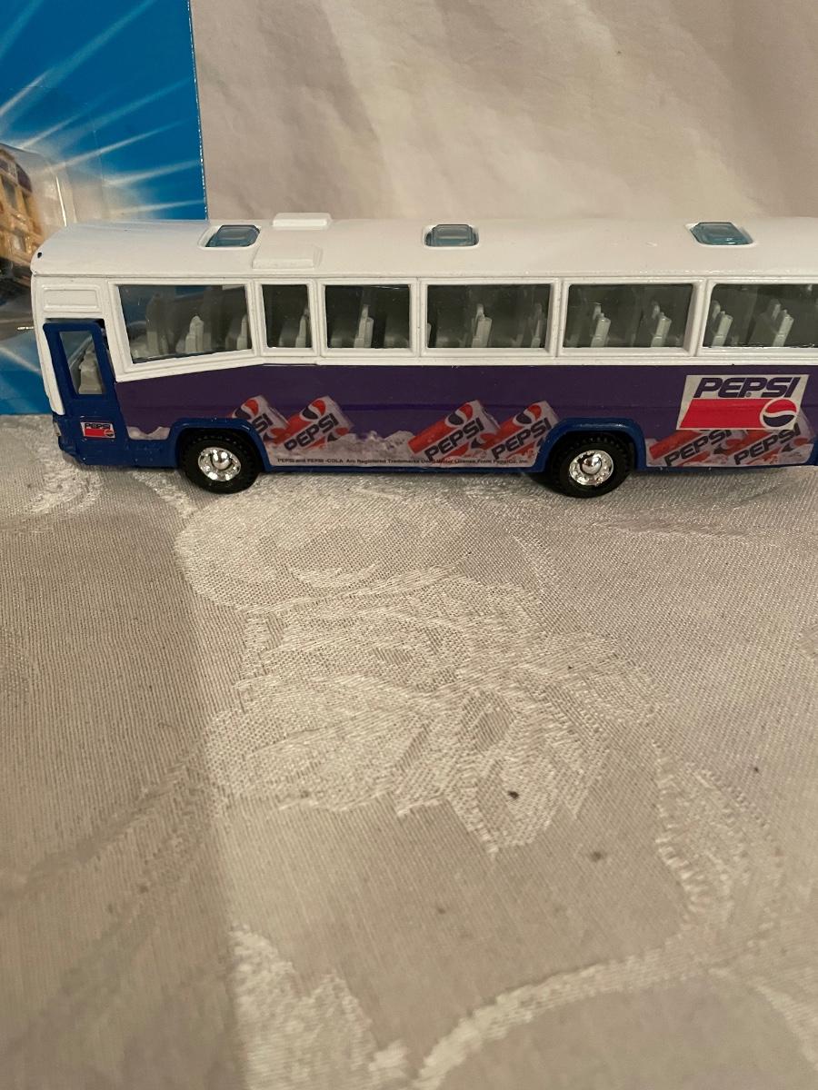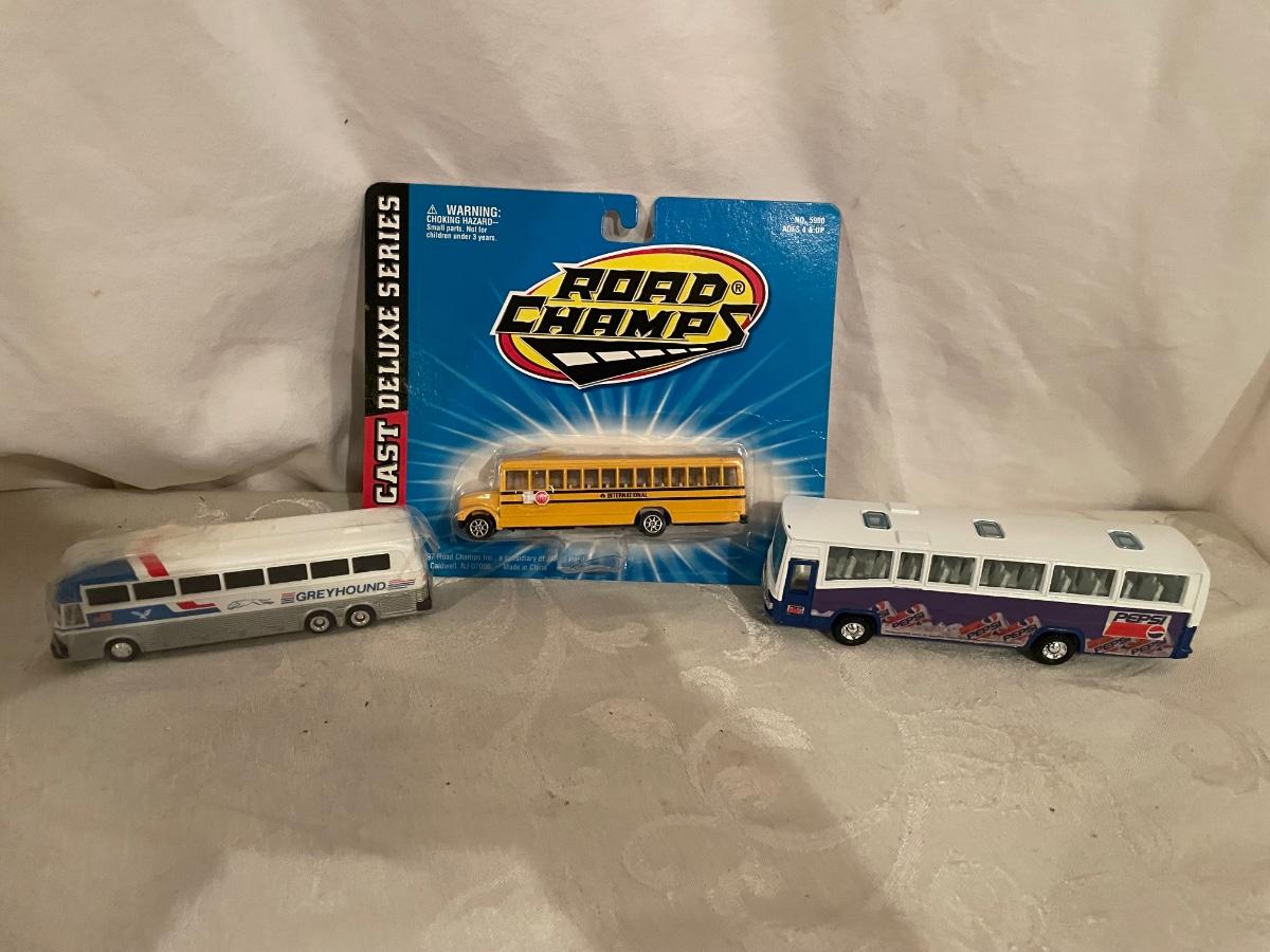Includes three buses School bus, Greyhound bus and a Pepsi-Cola bus
