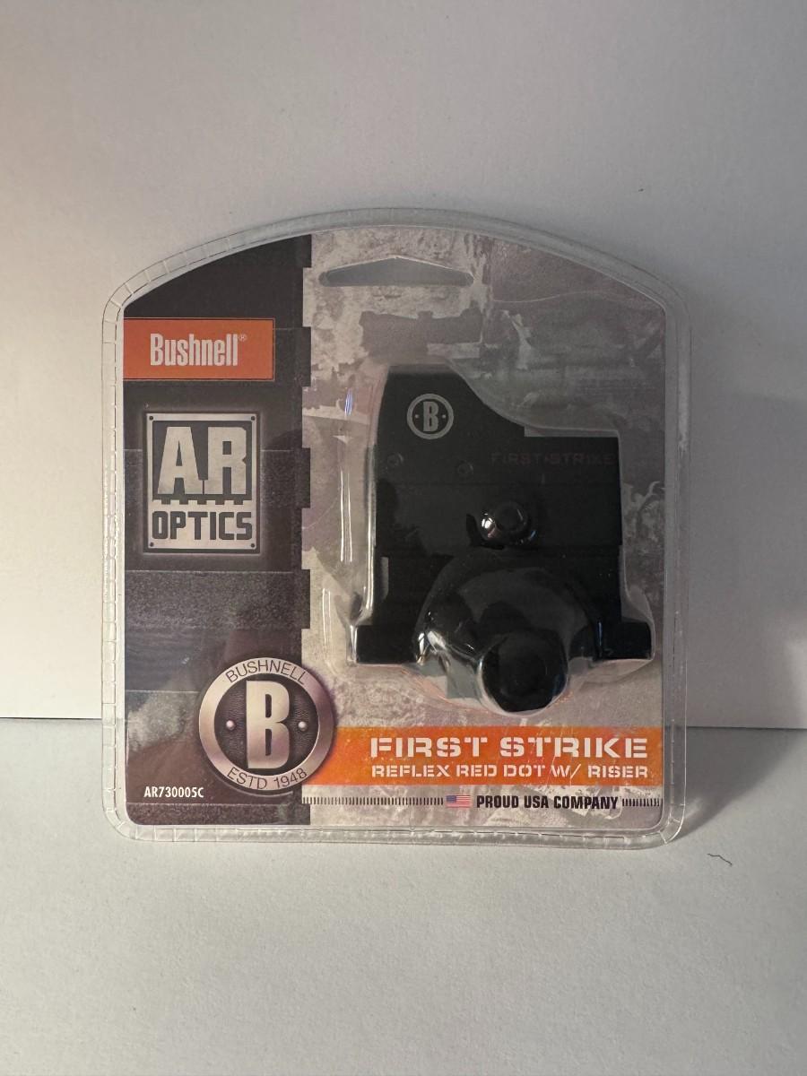 Bushnell AR Optics First Strike Reflex Red Dot Sight with Riser. This sight, identified by the model number AR730005C, is designed as a lightweight tactical optic, ideal for close-range targeting and versatile enough for various firearms like AR-style rifles, shotguns, and even pistols.