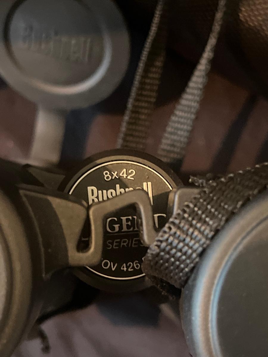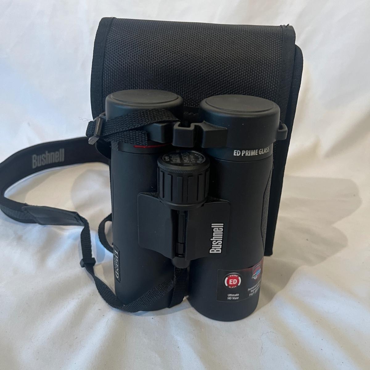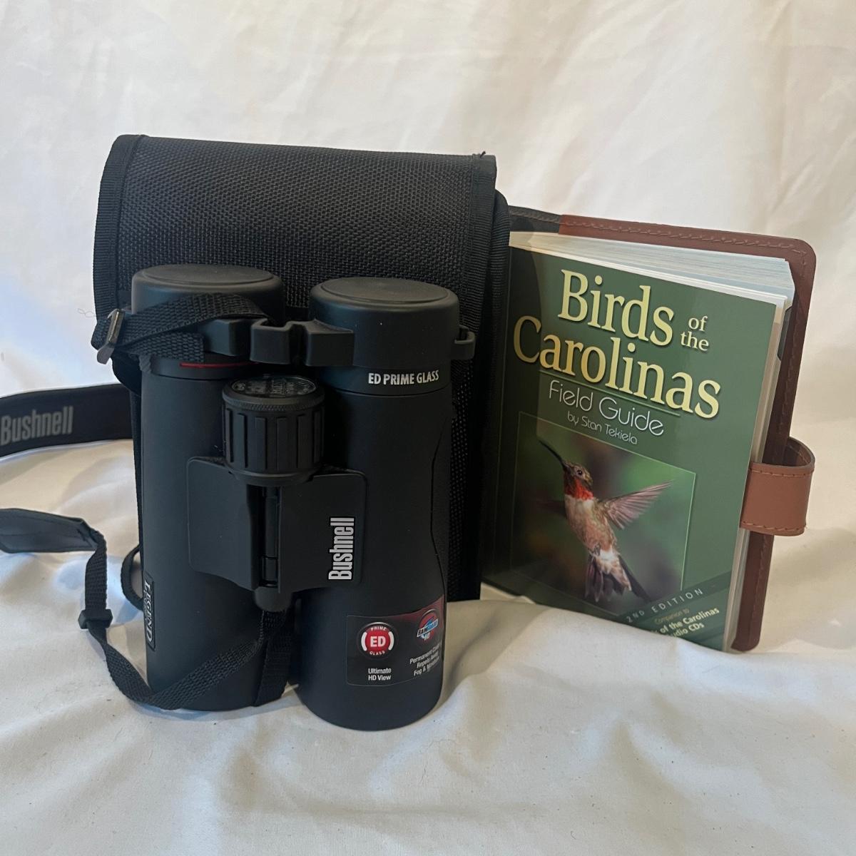 Lot includes a Bushnell Legend series 8 x 42 binoculars with case and a Birds of the Carolinas Field Guide.