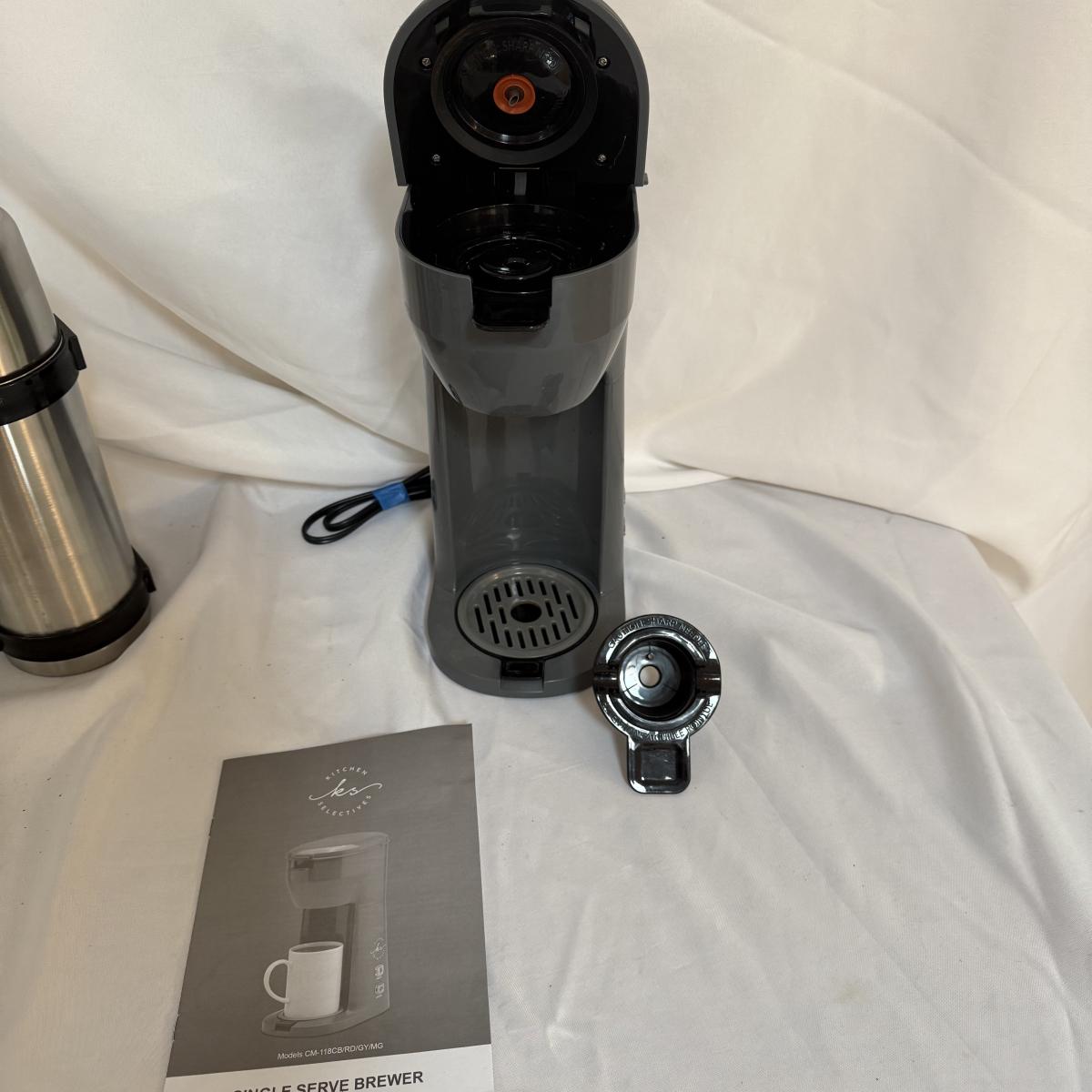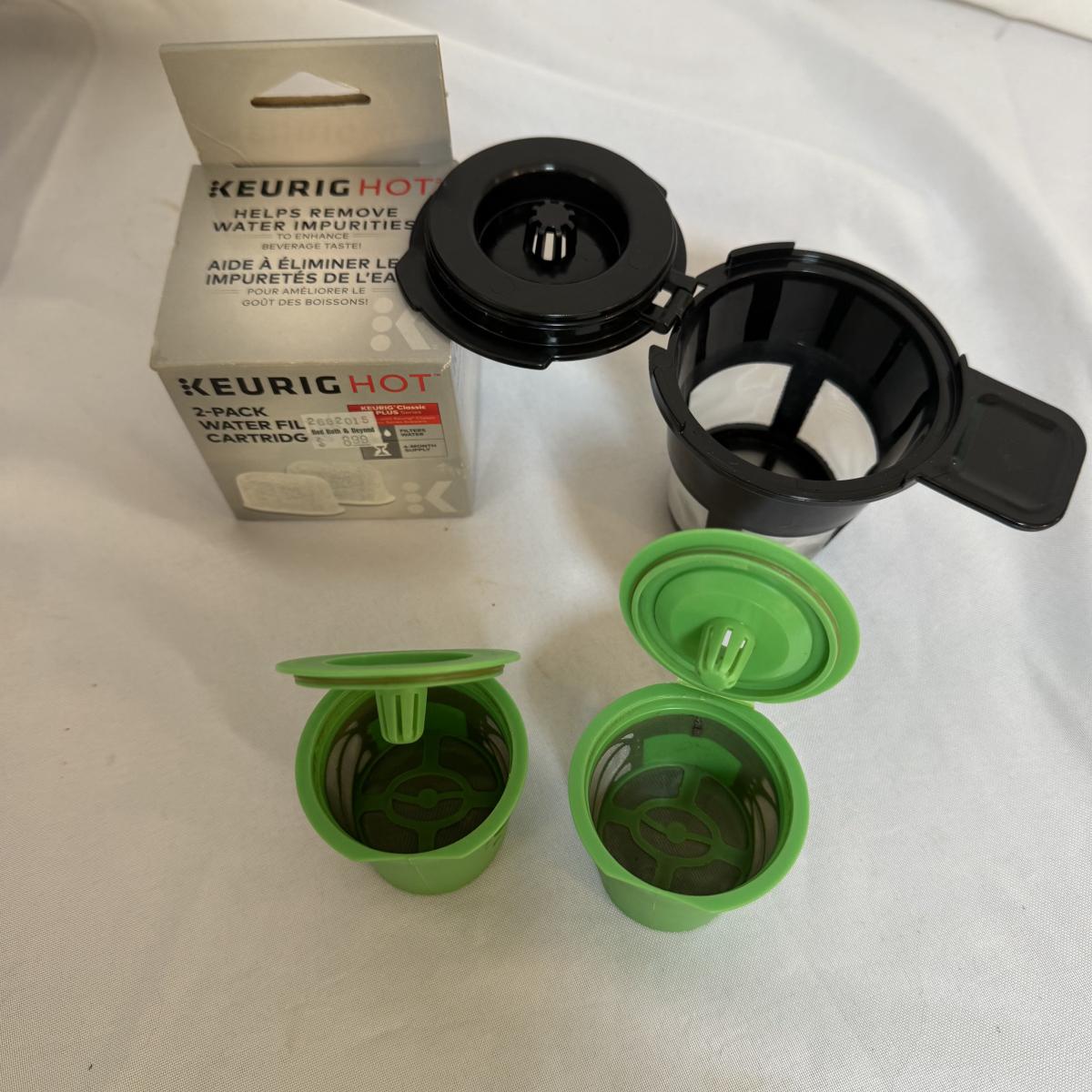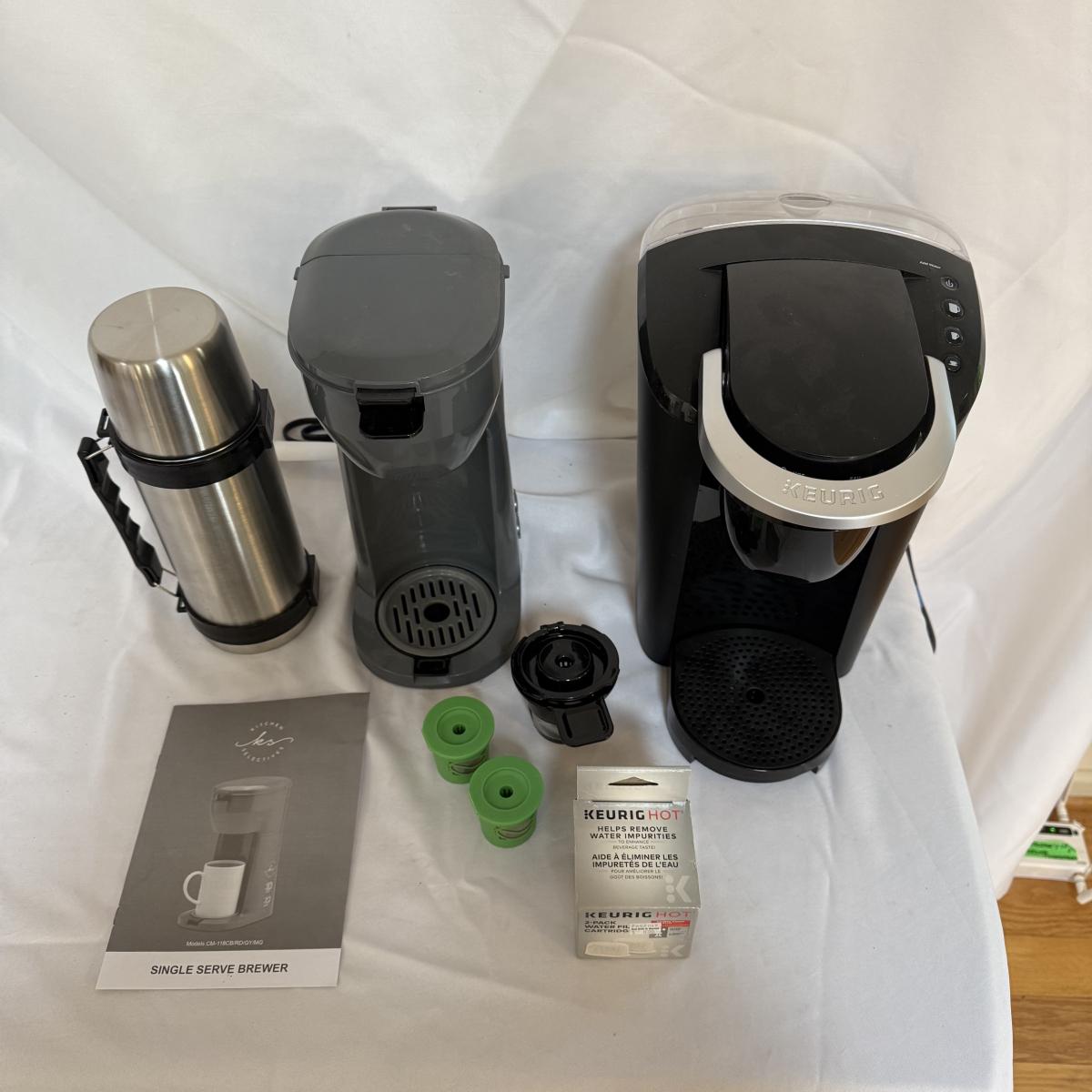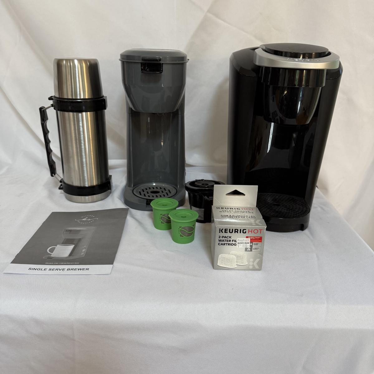 This lot contains a Keurig coffee maker, a Kitchen Selectives single serve brewer, a canteen, a Keurig water filter cartridge, and a couple of refillable Keurig filters. Both the Keurig and the KS single serve brewer do turn on. The Keurig measures 8” x 14” x 12.5”H. The canteen measures 11.25” x 4”D. Shipping available.