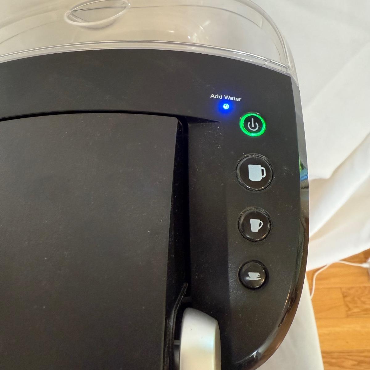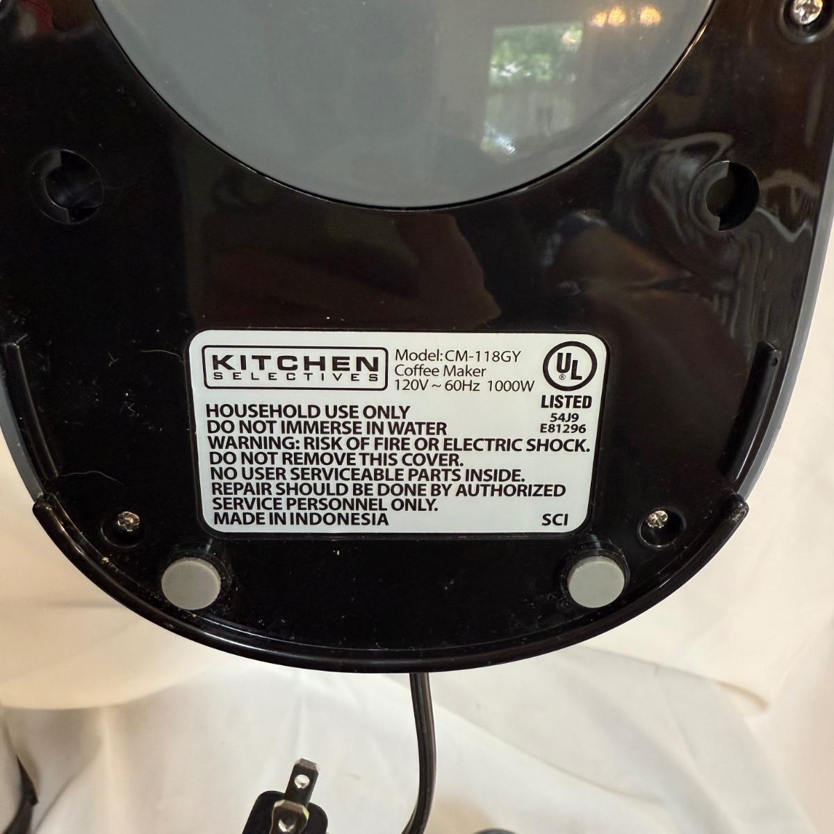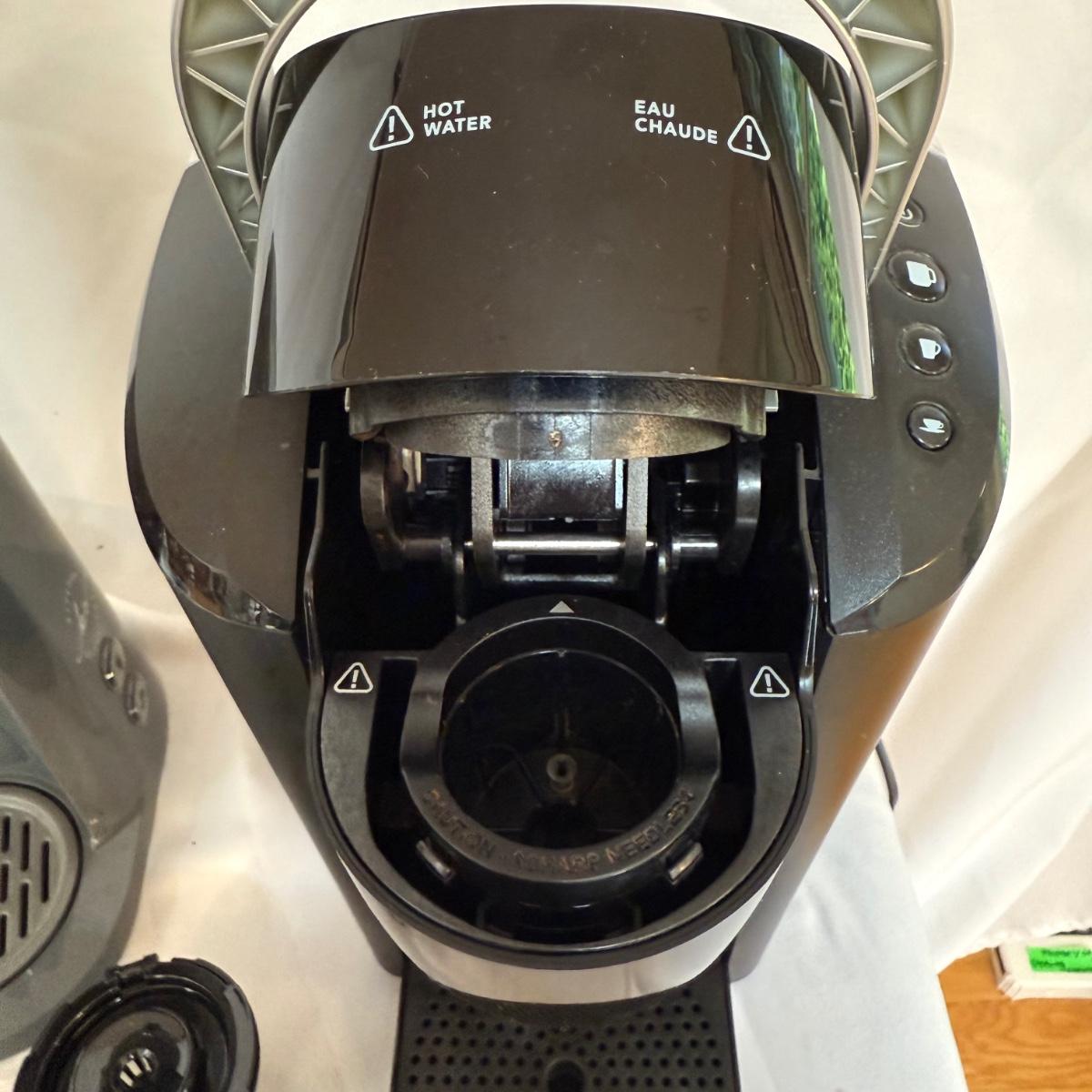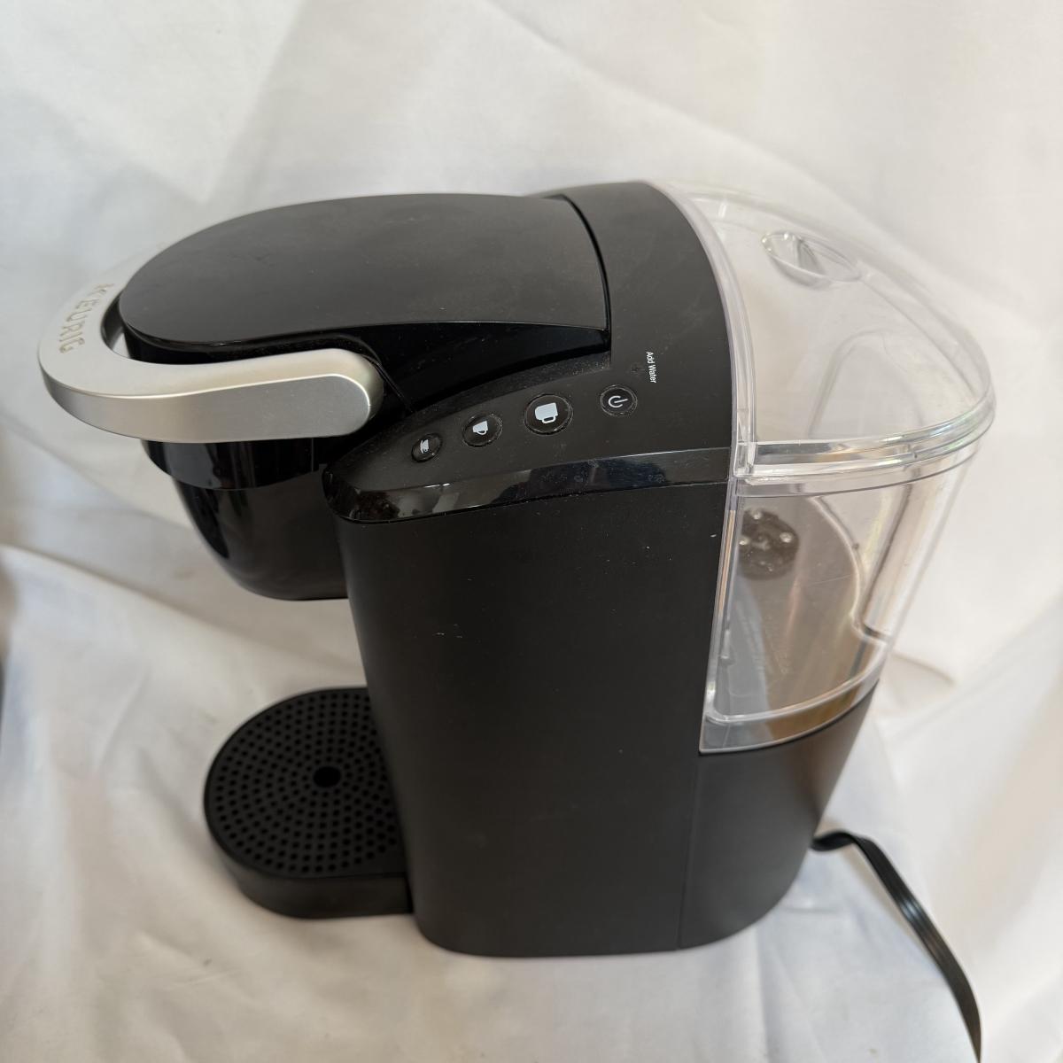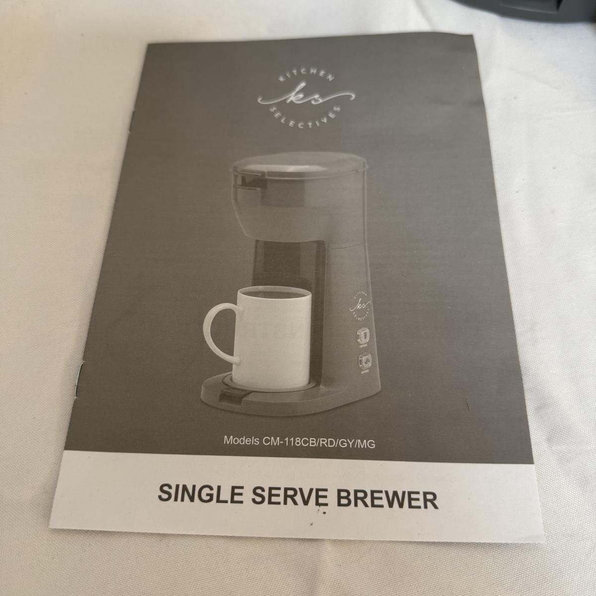 This lot contains a Keurig coffee maker, a Kitchen Selectives single serve brewer, a canteen, a Keurig water filter cartridge, and a couple of refillable Keurig filters. Both the Keurig and the KS single serve brewer do turn on. The Keurig measures 8” x 14” x 12.5”H. The canteen measures 11.25” x 4”D. Shipping available.