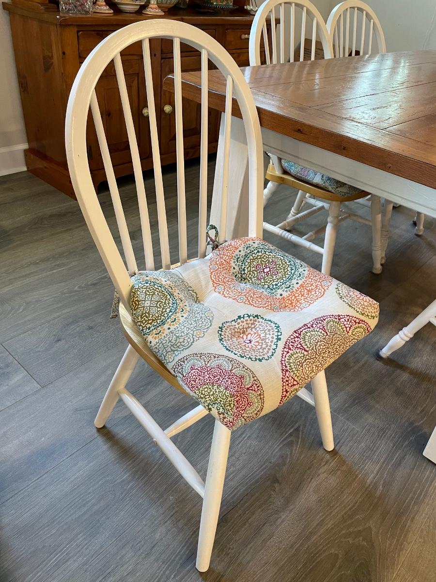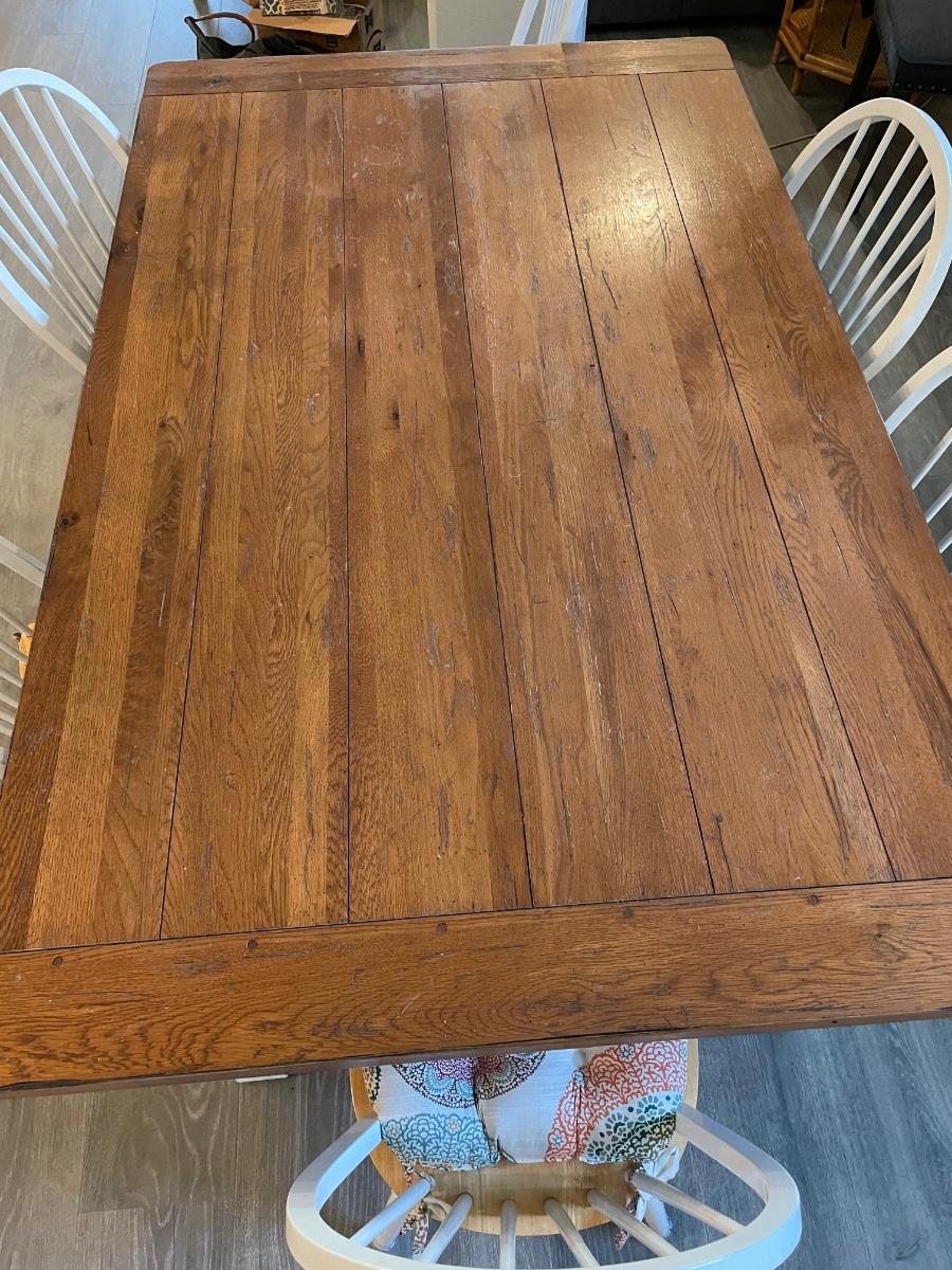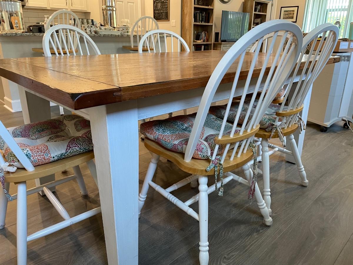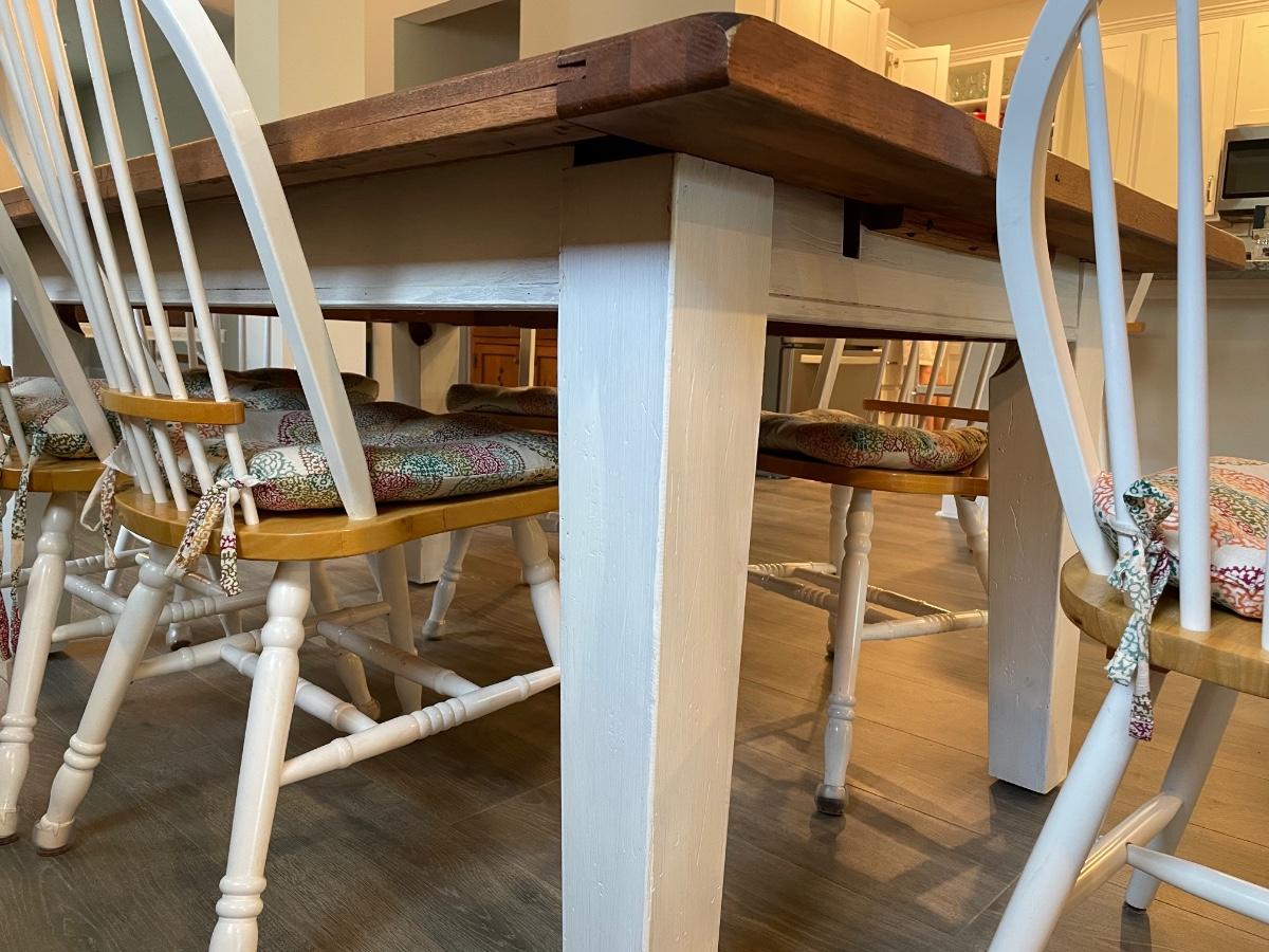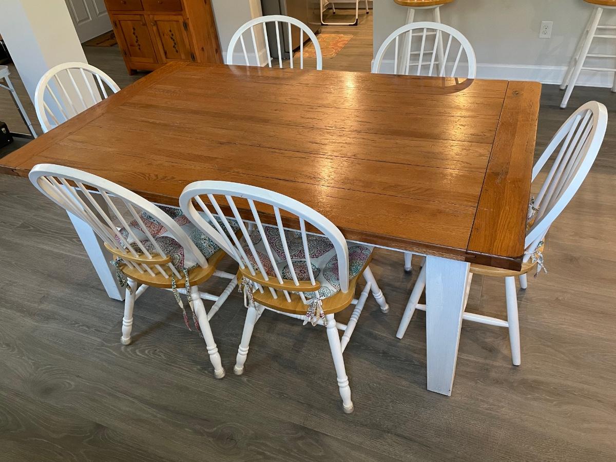 Nice handmade butcher block dining table with 6 chairs and 2 extra leaves.