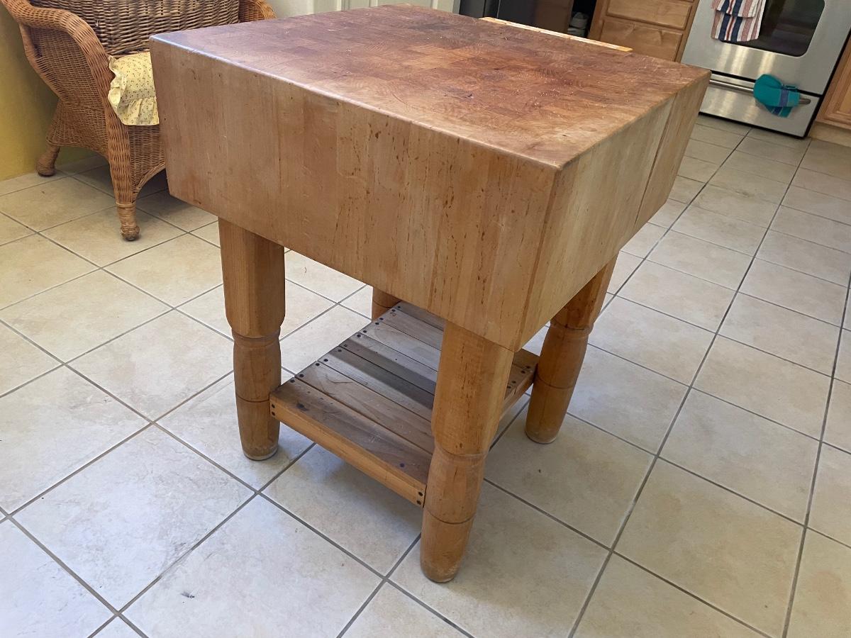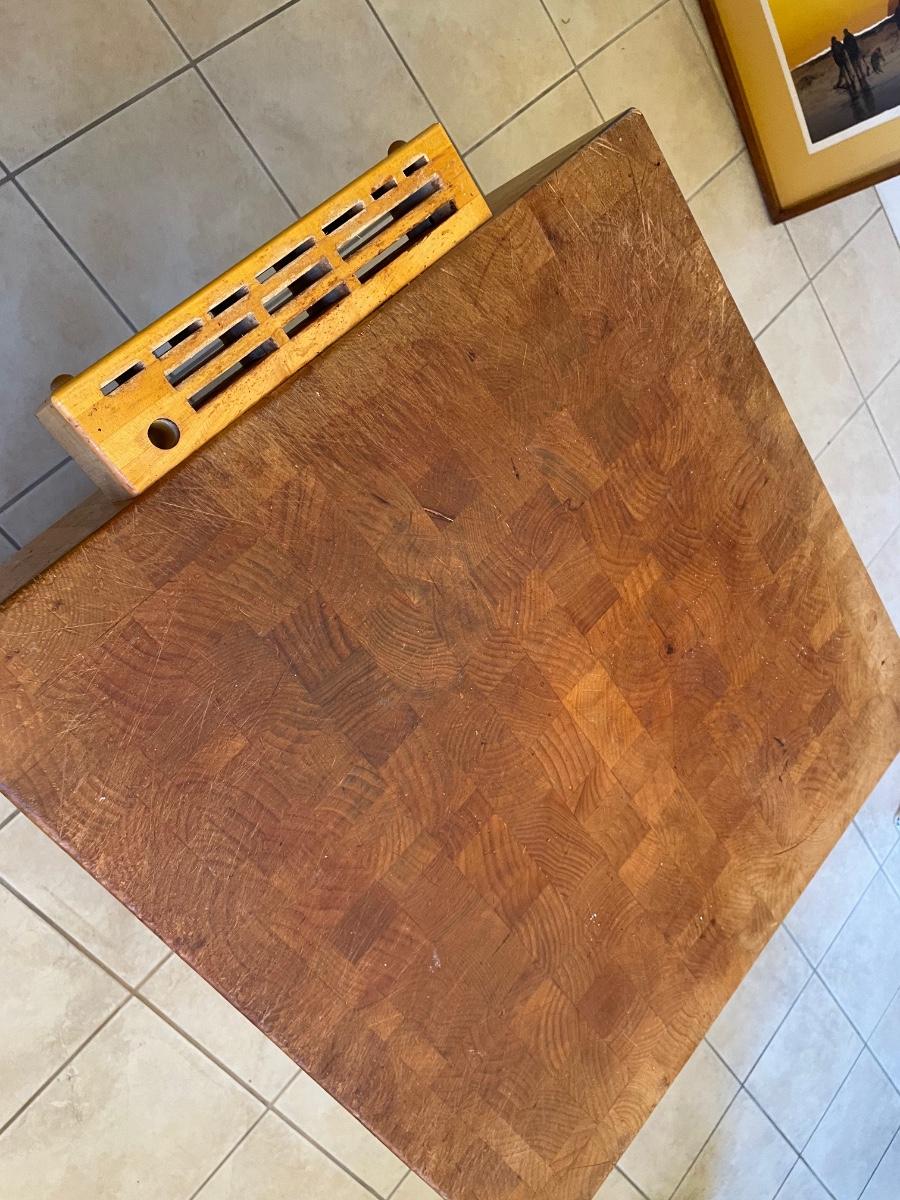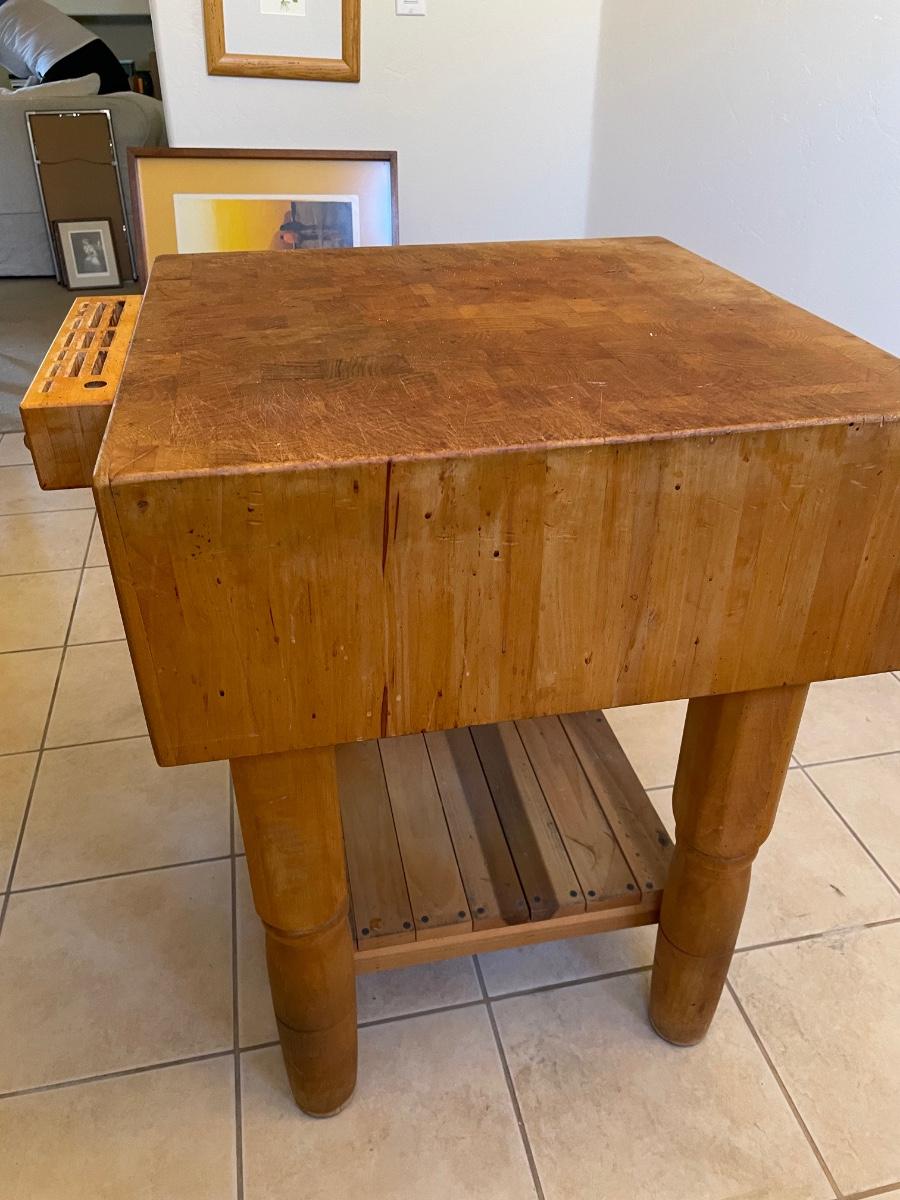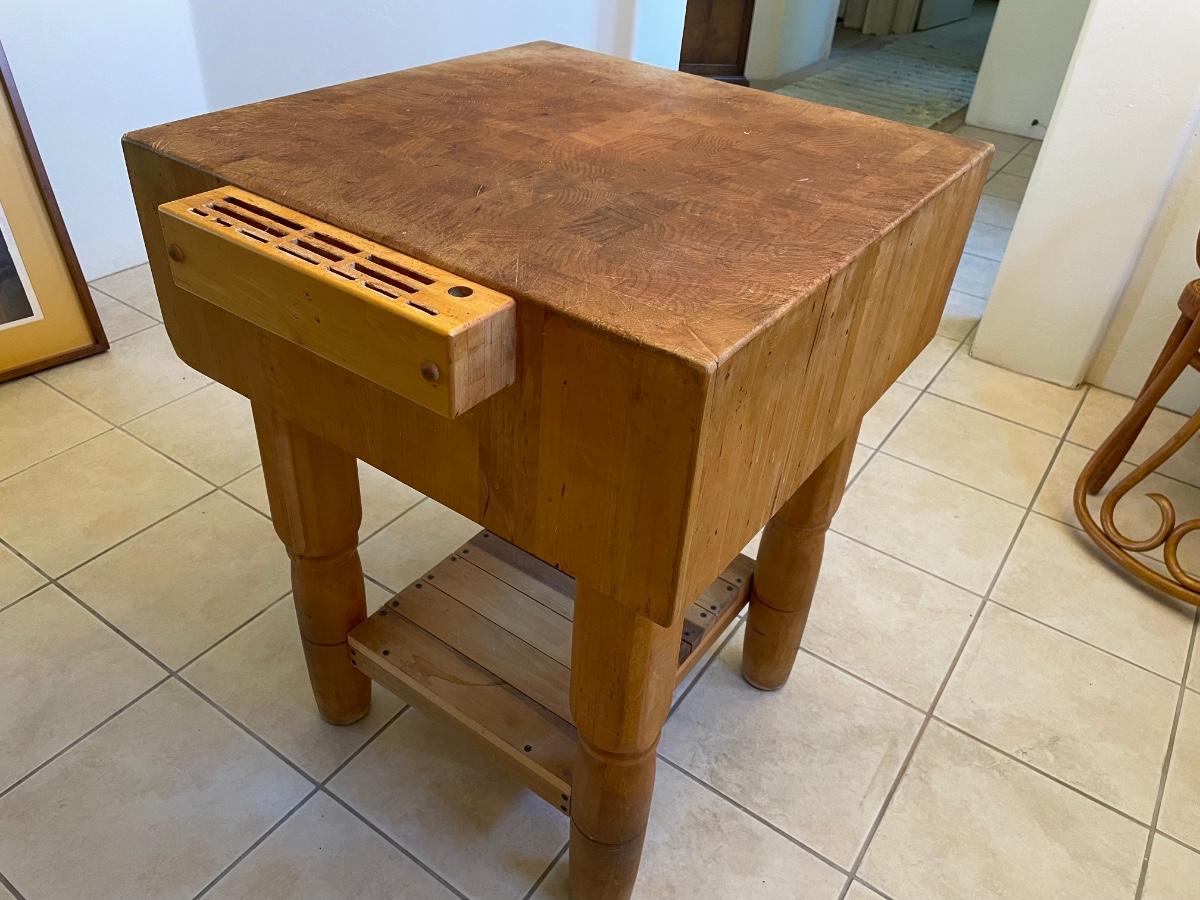 Butcher block island with attached knife holder in good condition. (24inX24inX32in)