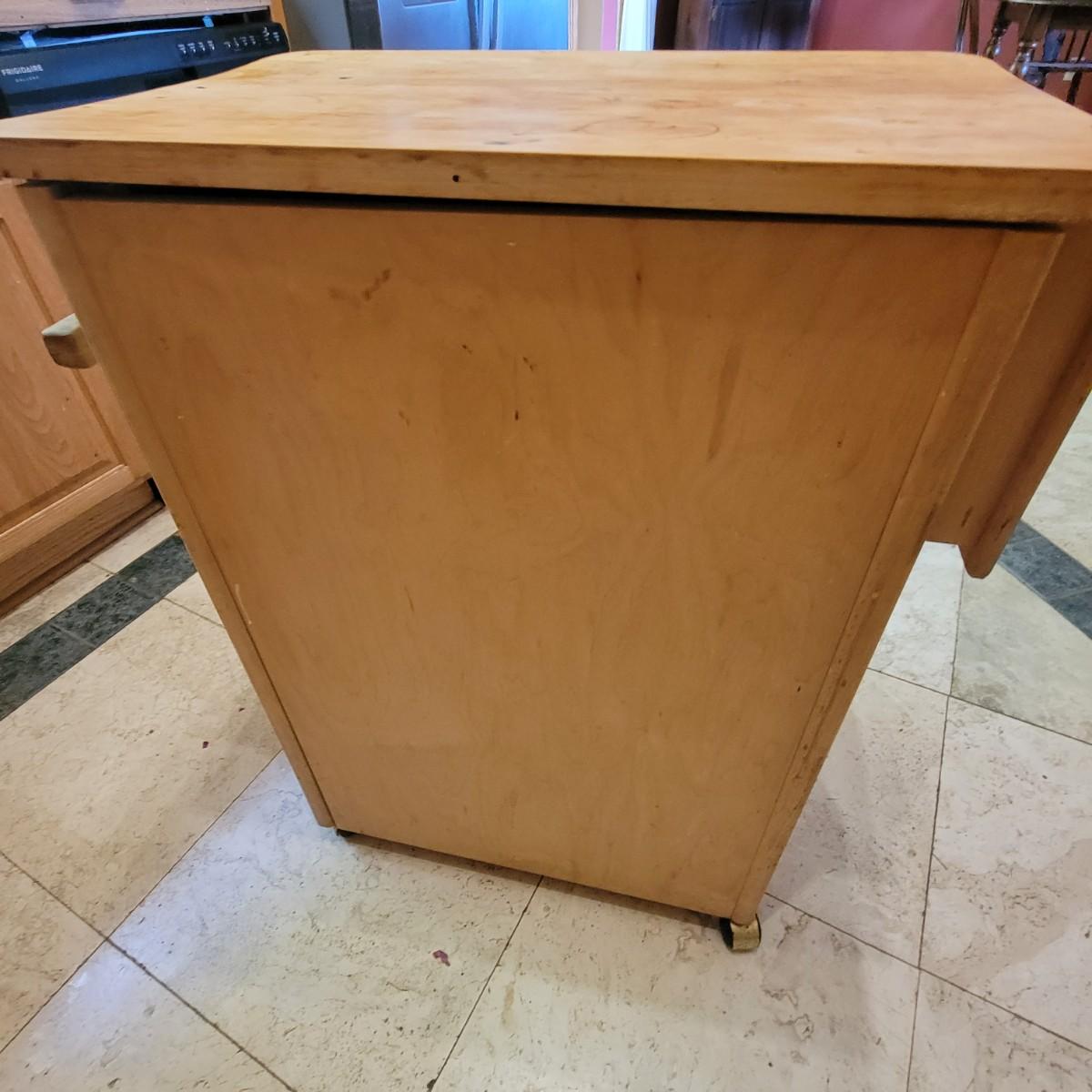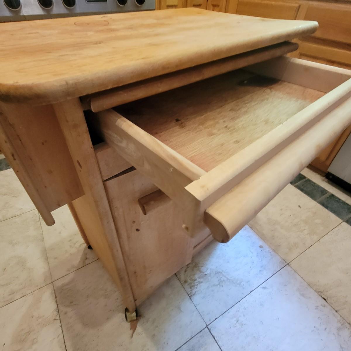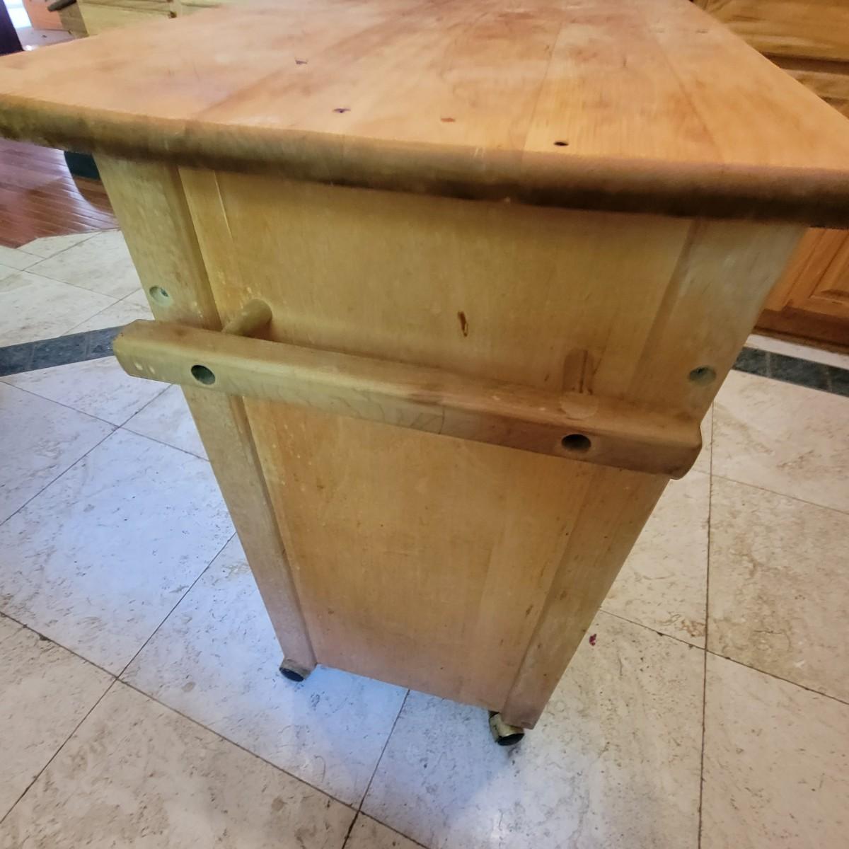 Solid wood butcher block island on wheels, with a pull out tray, drawer and cabinet. Measures approximately 35" x 27" x 17.5"