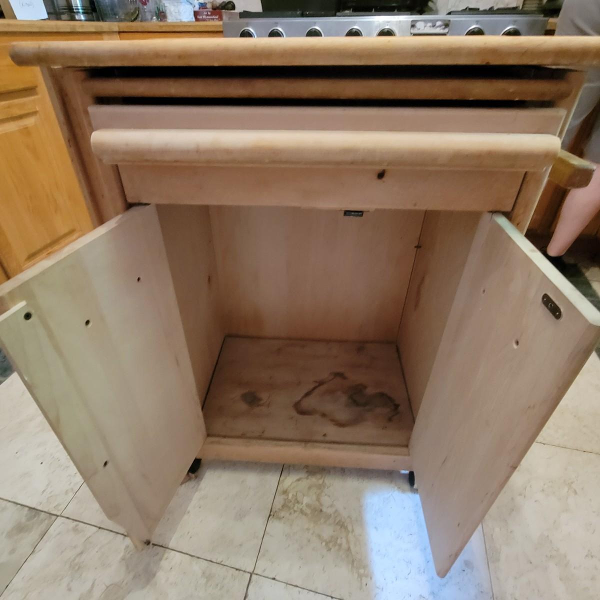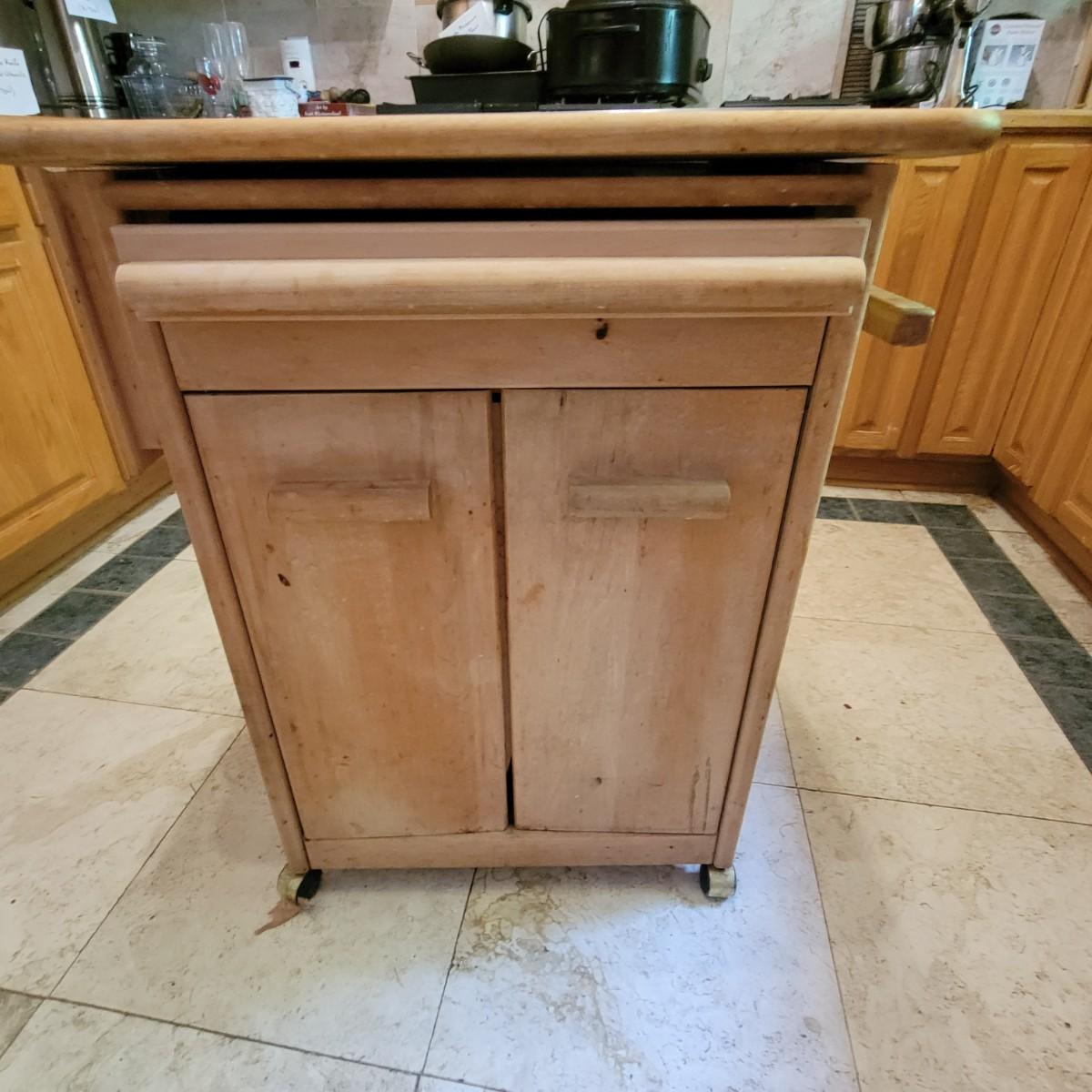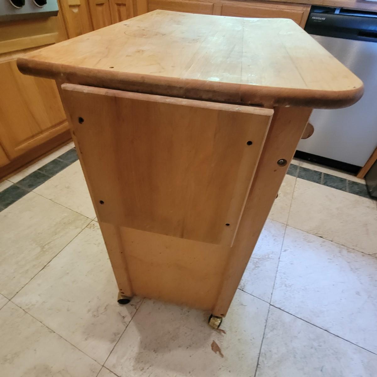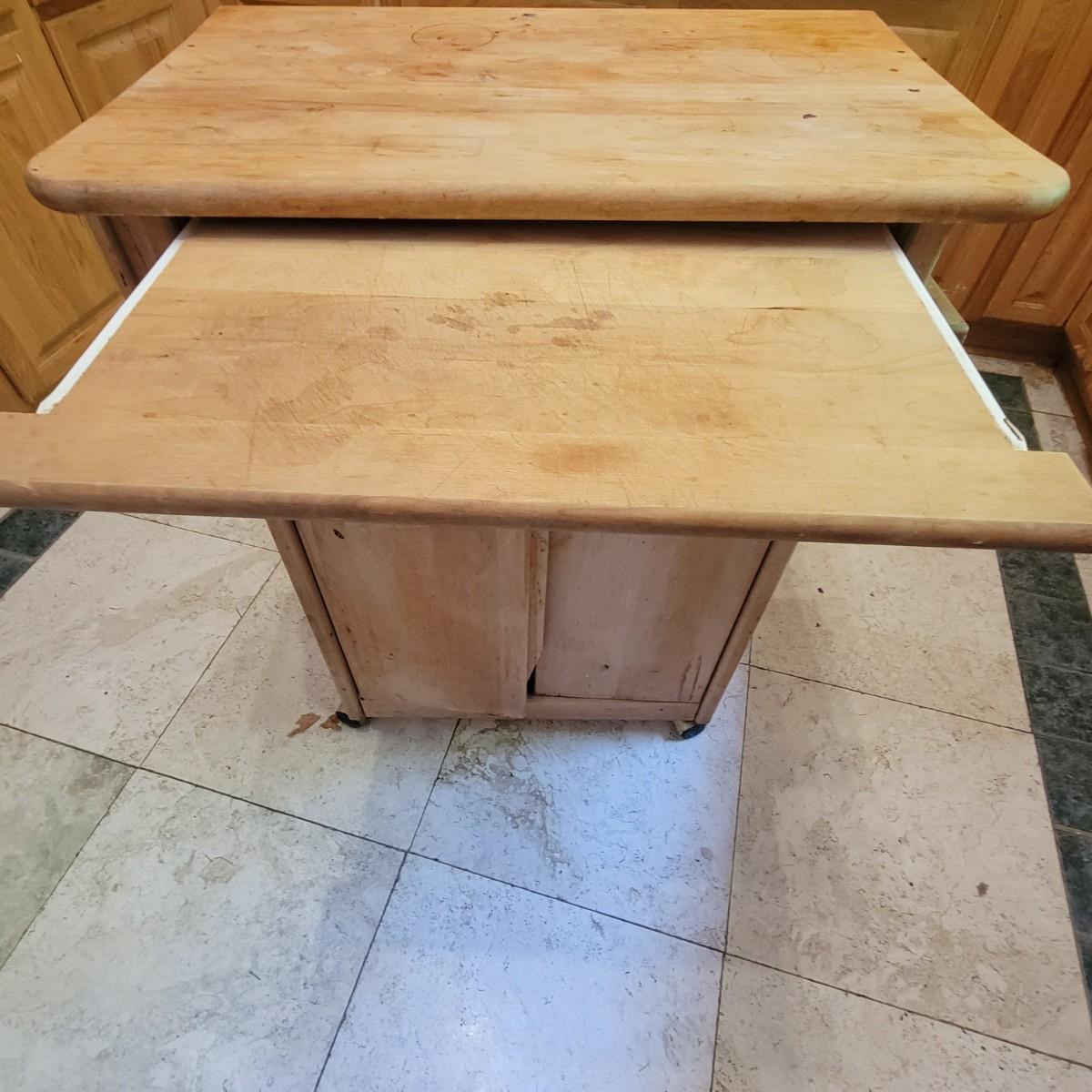 Solid wood butcher block island on wheels, with a pull out tray, drawer and cabinet. Measures approximately 35" x 27" x 17.5"