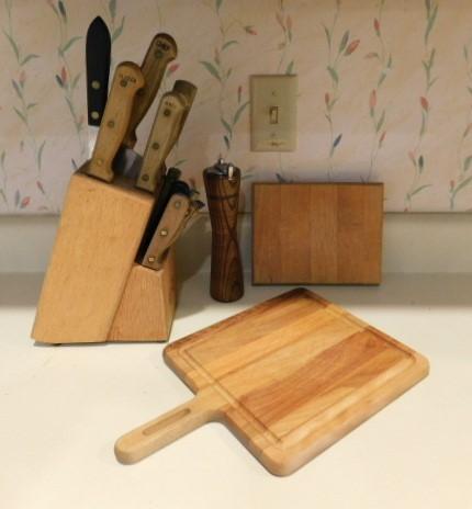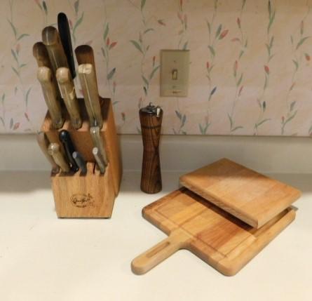 Butcher Block with Mixed Brand Cutlery, Wood Cutting Board, Pepper Mill