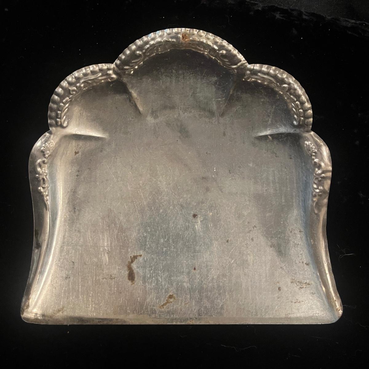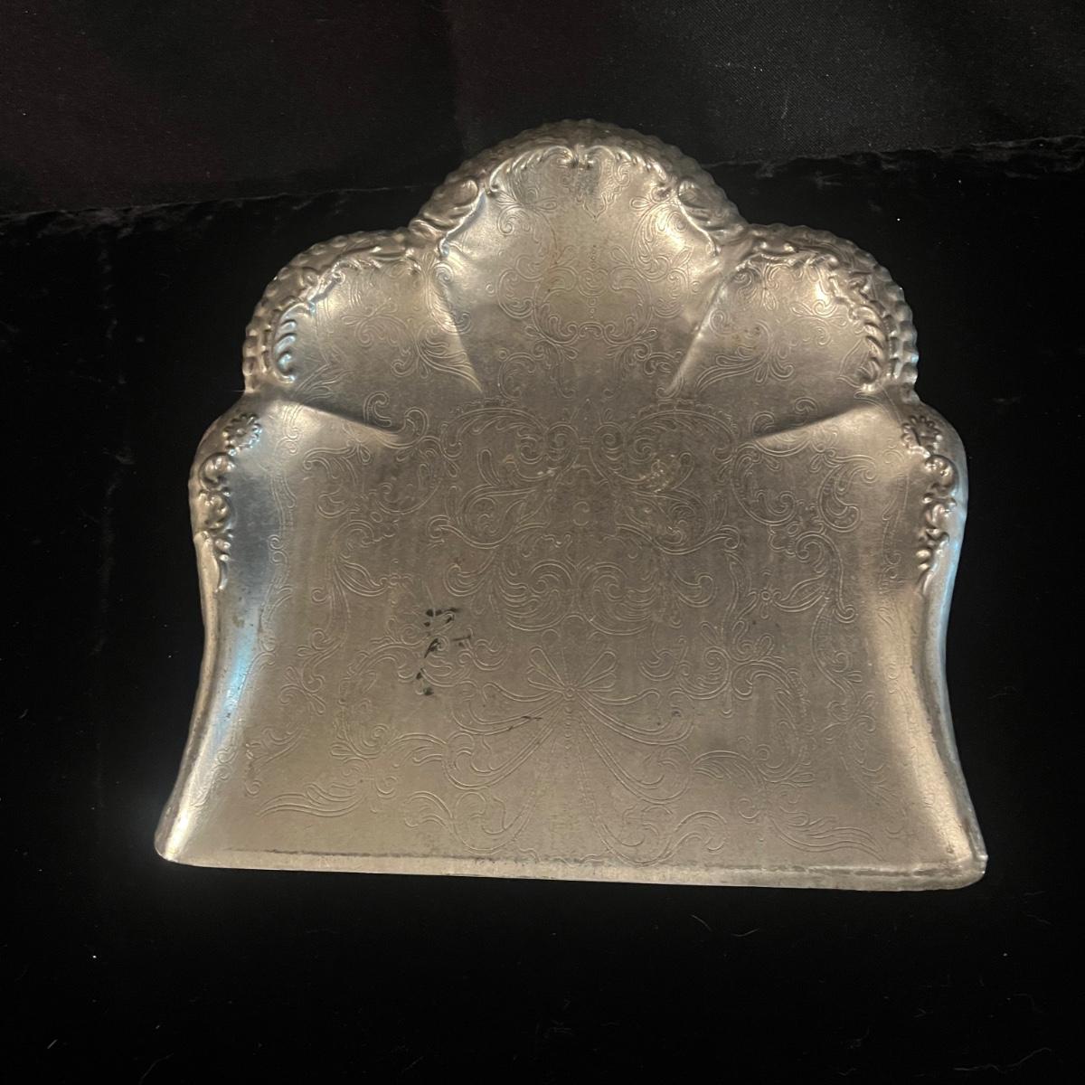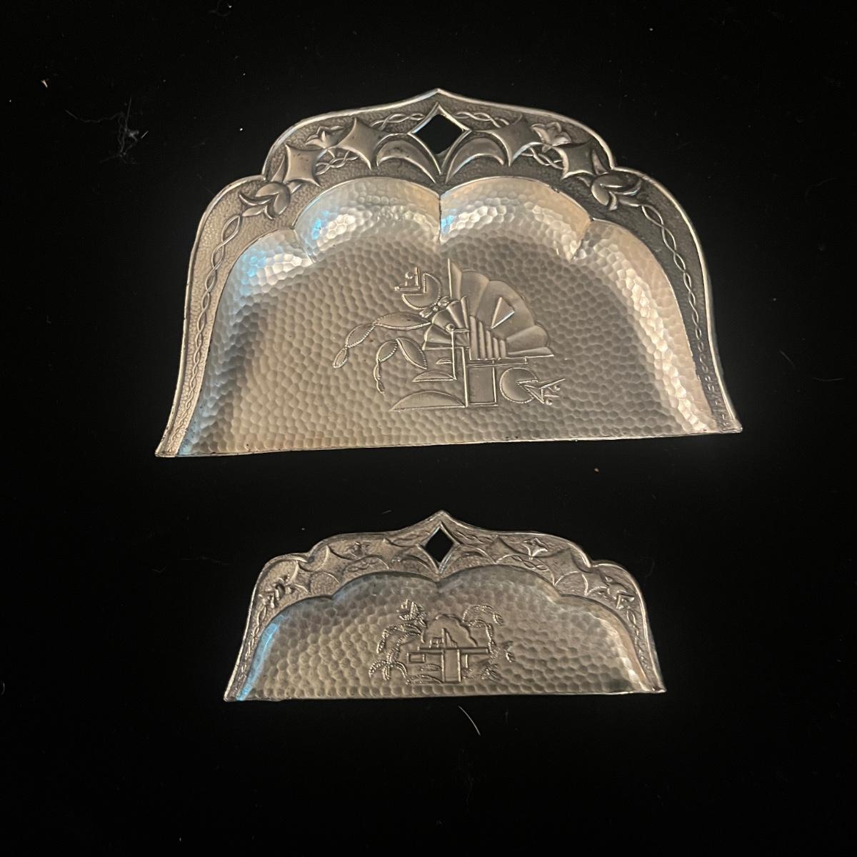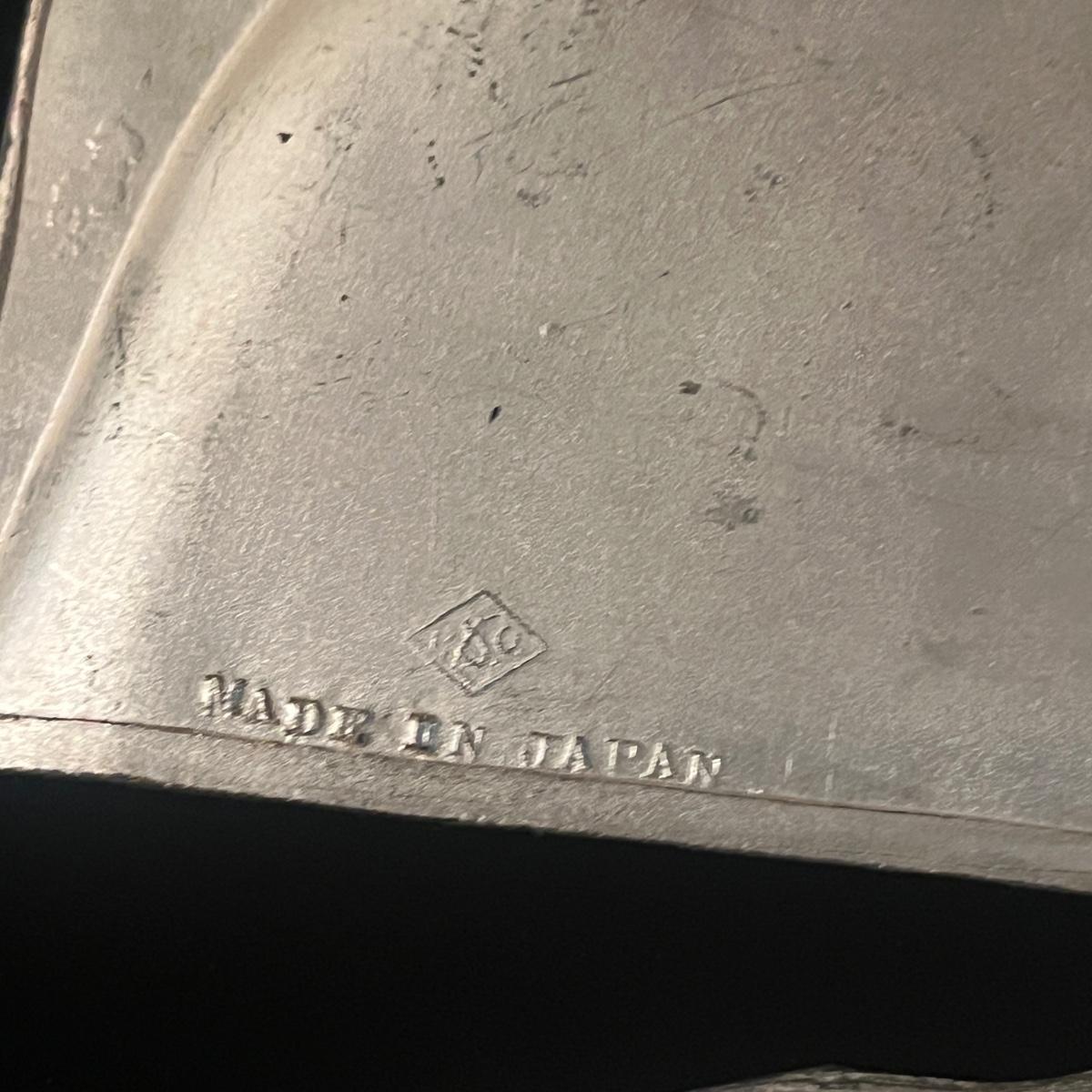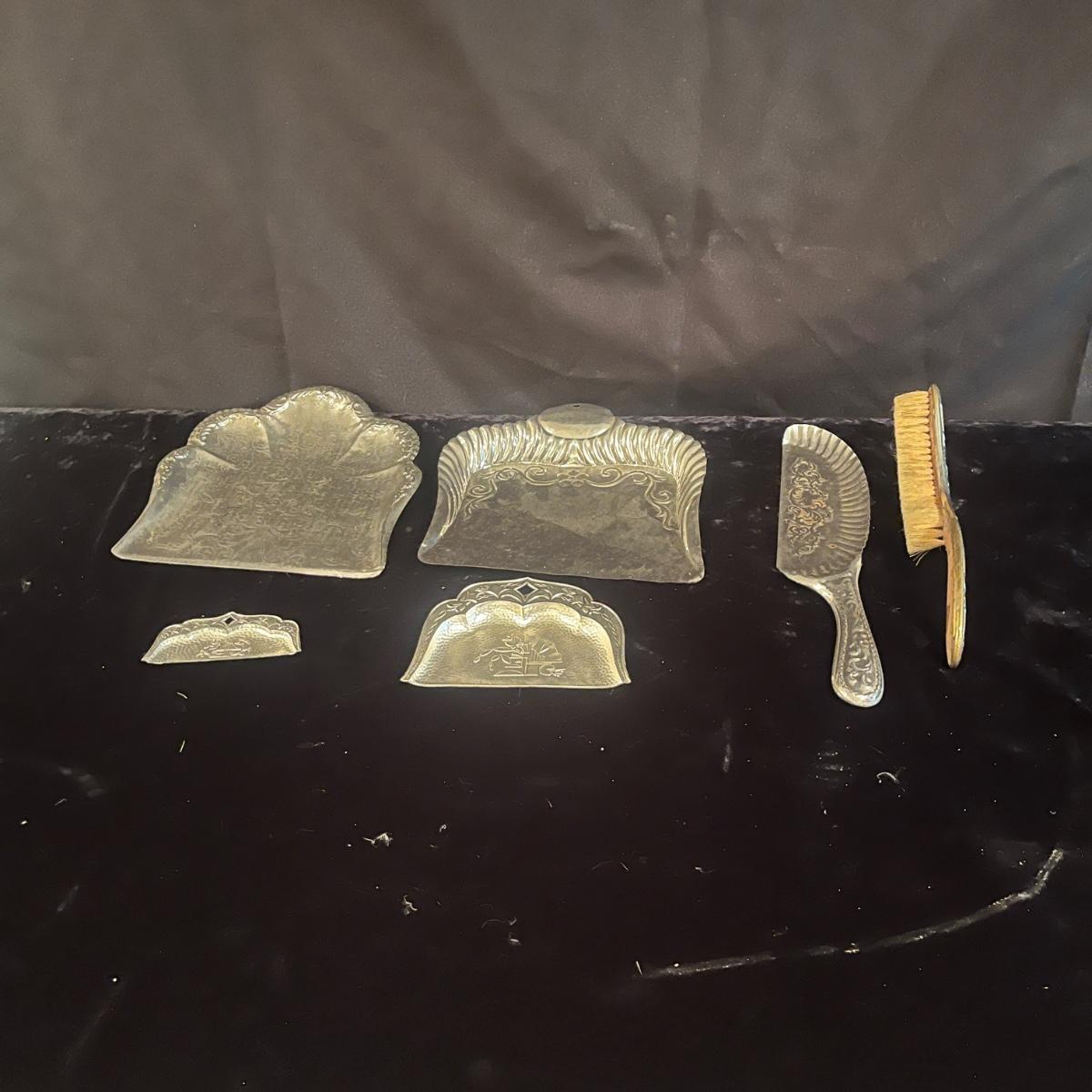 Lot includes two metal butler crumb trays that are stamped ‘Made in Japan’, three unmarked metal butler crumb trays, and one brush. Largest tray measures 9” x 9” x 1”H.