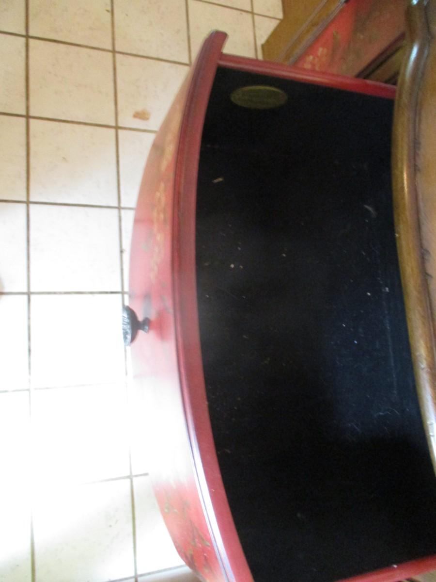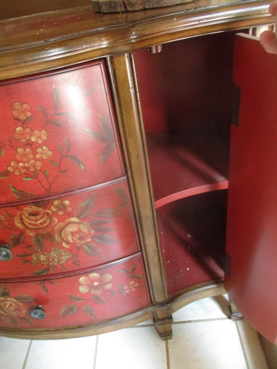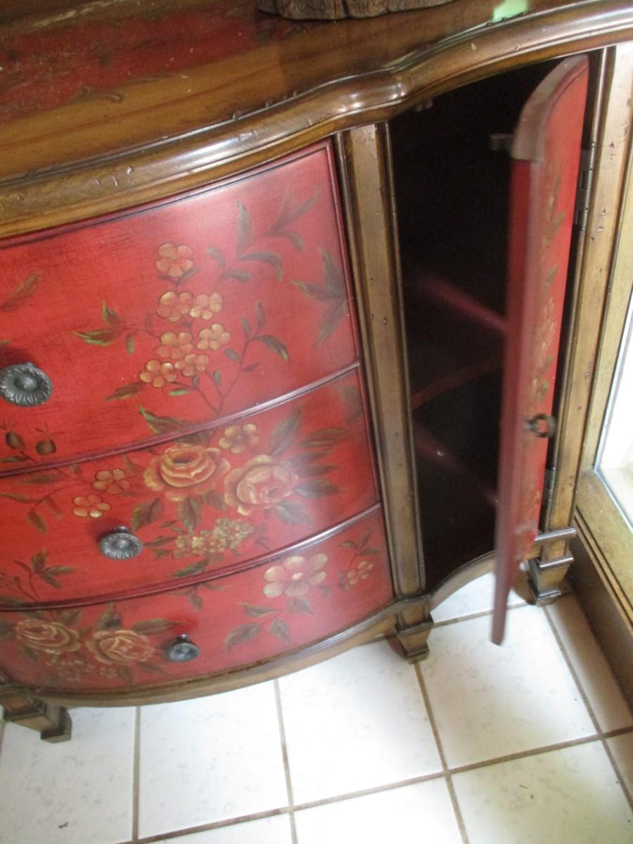 Red hand painted finish Choice Birch veneers felt lined drawers dovetail construction Brass Finished drawer knobs Hand carved wood legs 3 drawers and 2 side doors