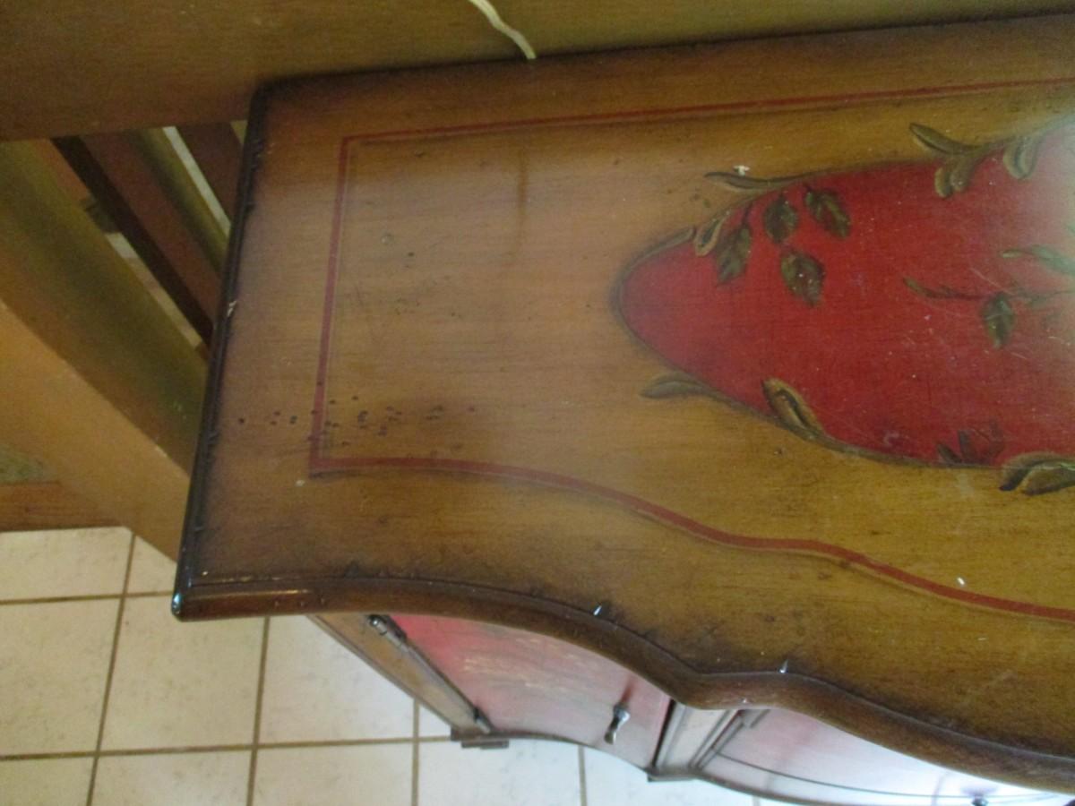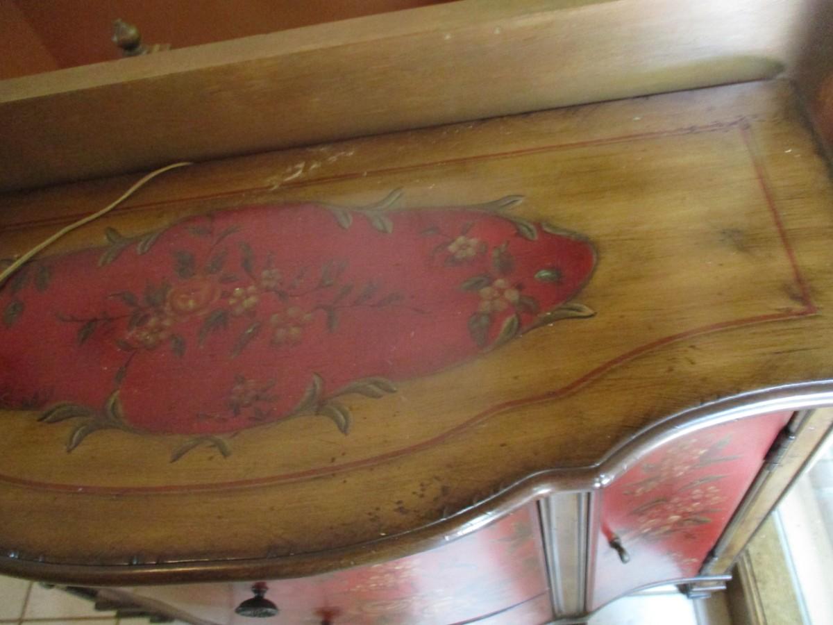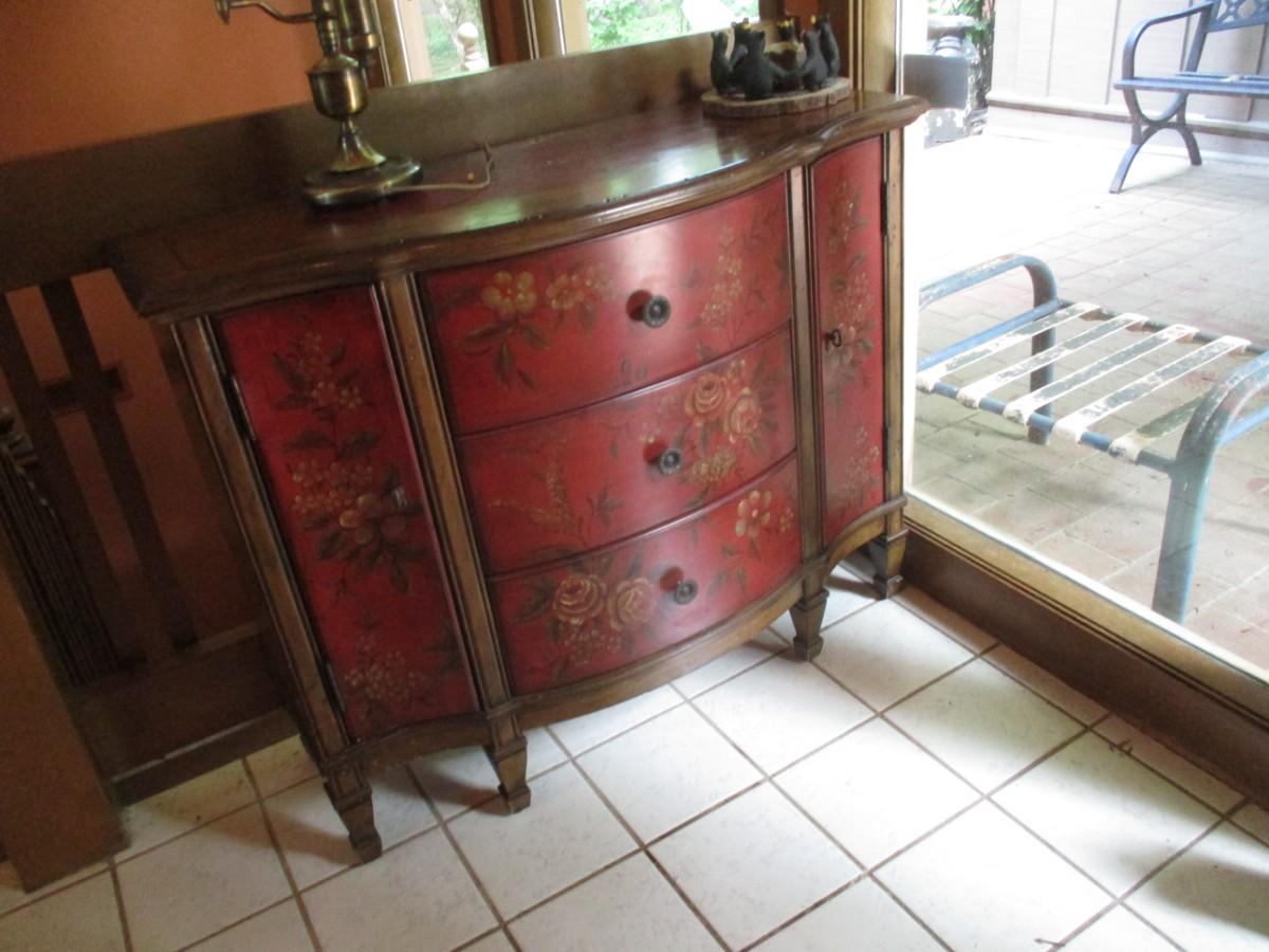 Red hand painted finish Choice Birch veneers felt lined drawers dovetail construction Brass Finished drawer knobs Hand carved wood legs 3 drawers and 2 side doors