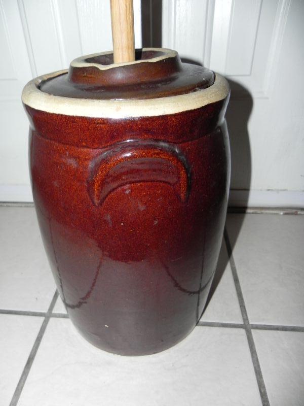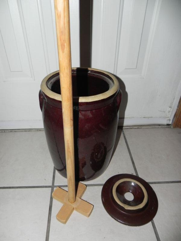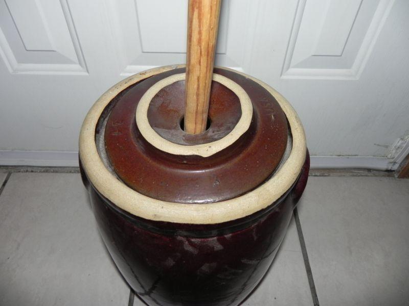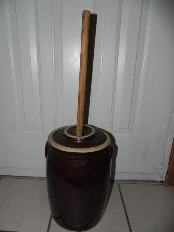 *CROCK WITH LID AND WOOD CHURN TOOL NO CRACKS, VERY NICE