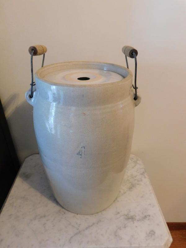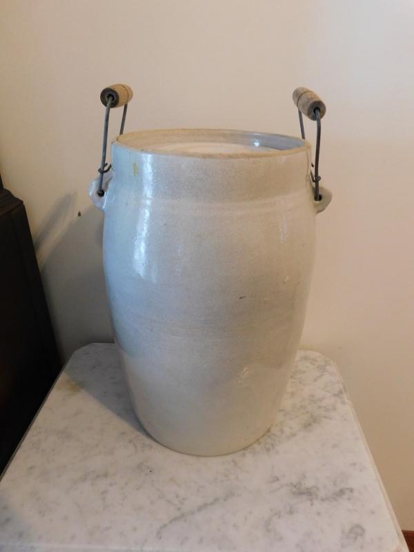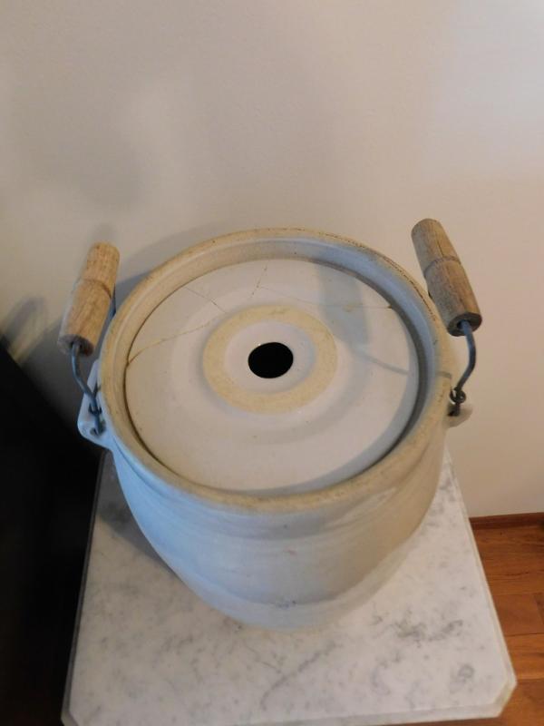 Butter Churn Crock with Wood Handles the lid is cracked and there is no plunger