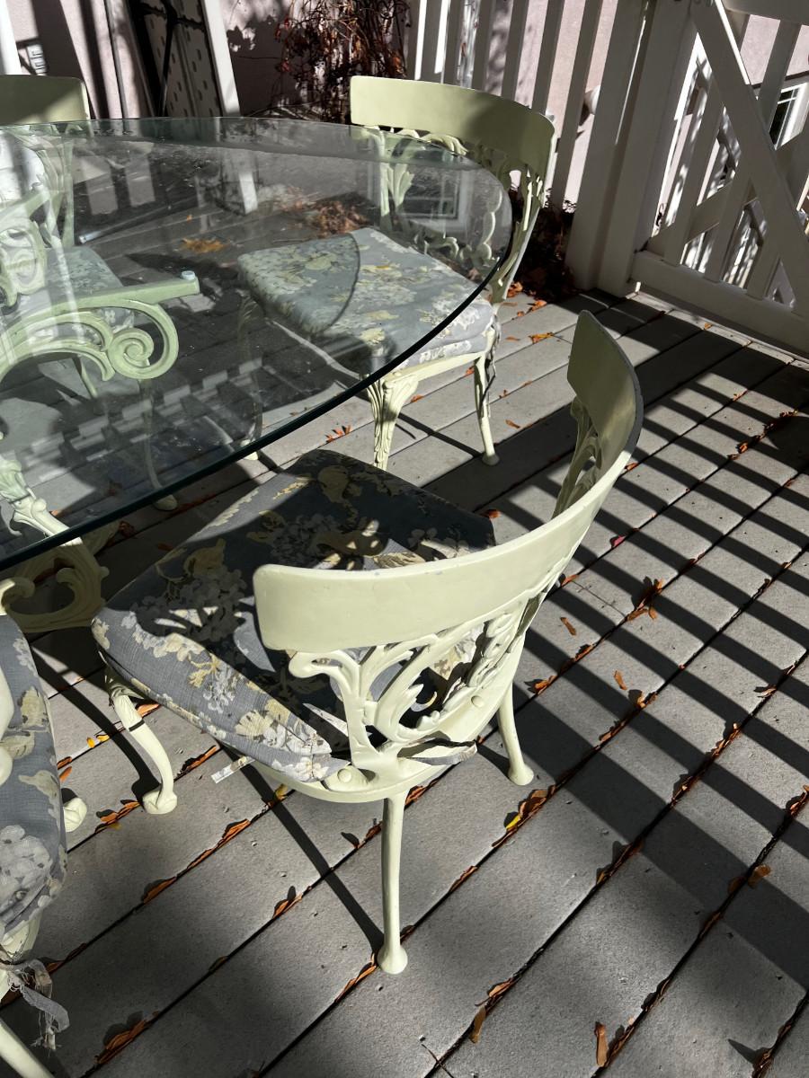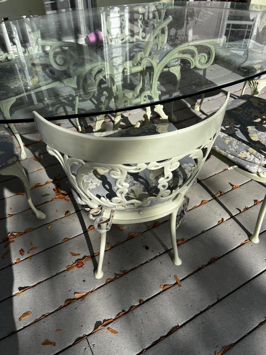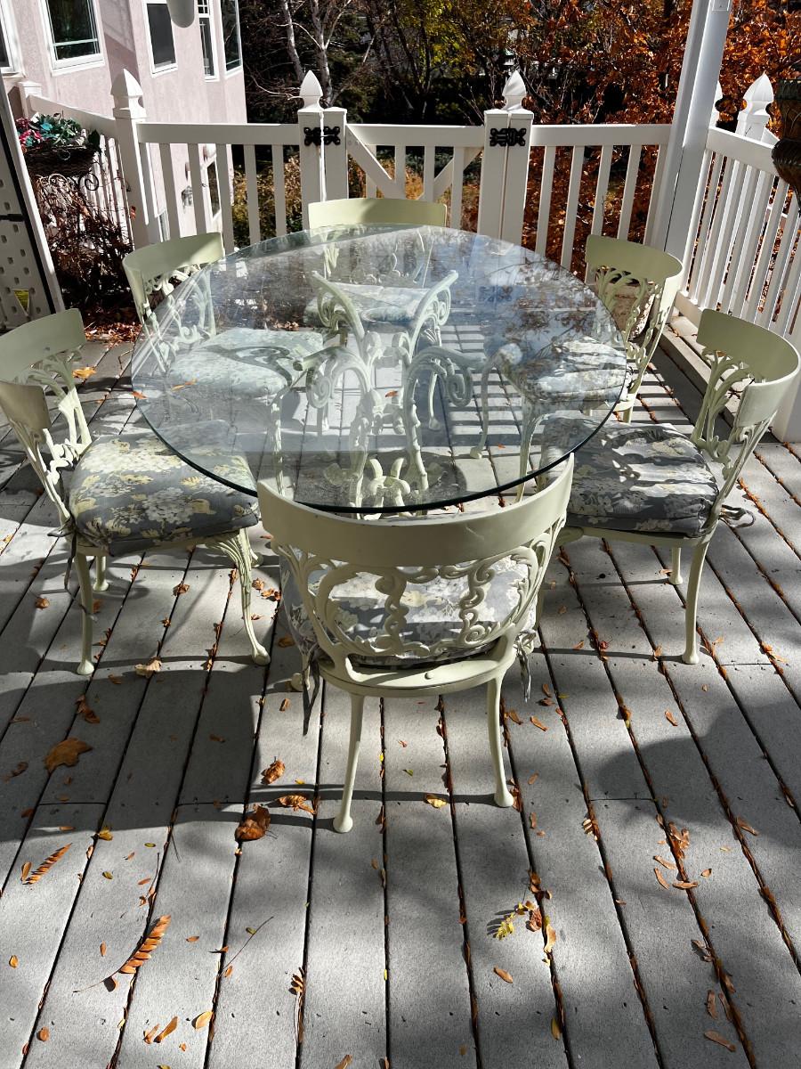 Being used outdoors! Oval Shape Seat 6 Comfortably! Very heavy Glass 3/8 BRING STRONG YOUNG ADULT HELP! 82-1/2 Ong on the Glass