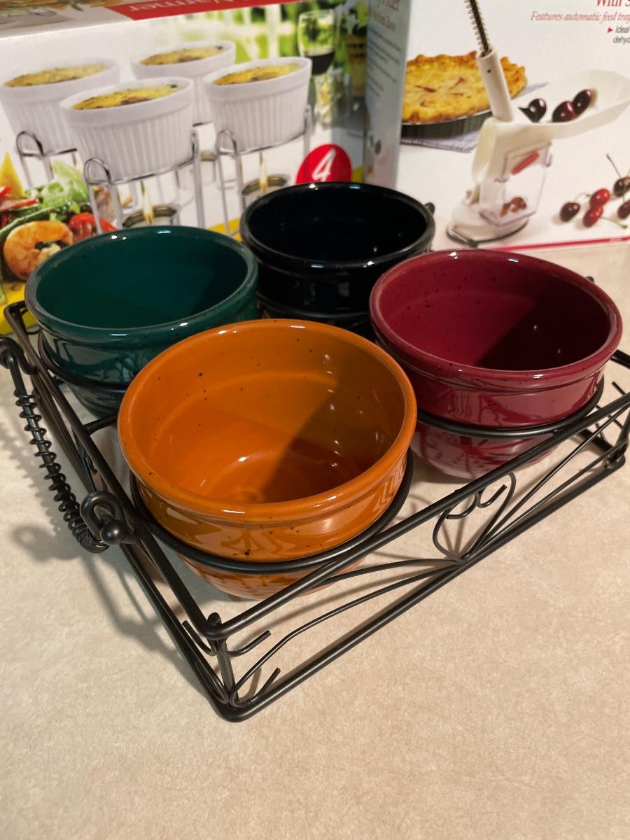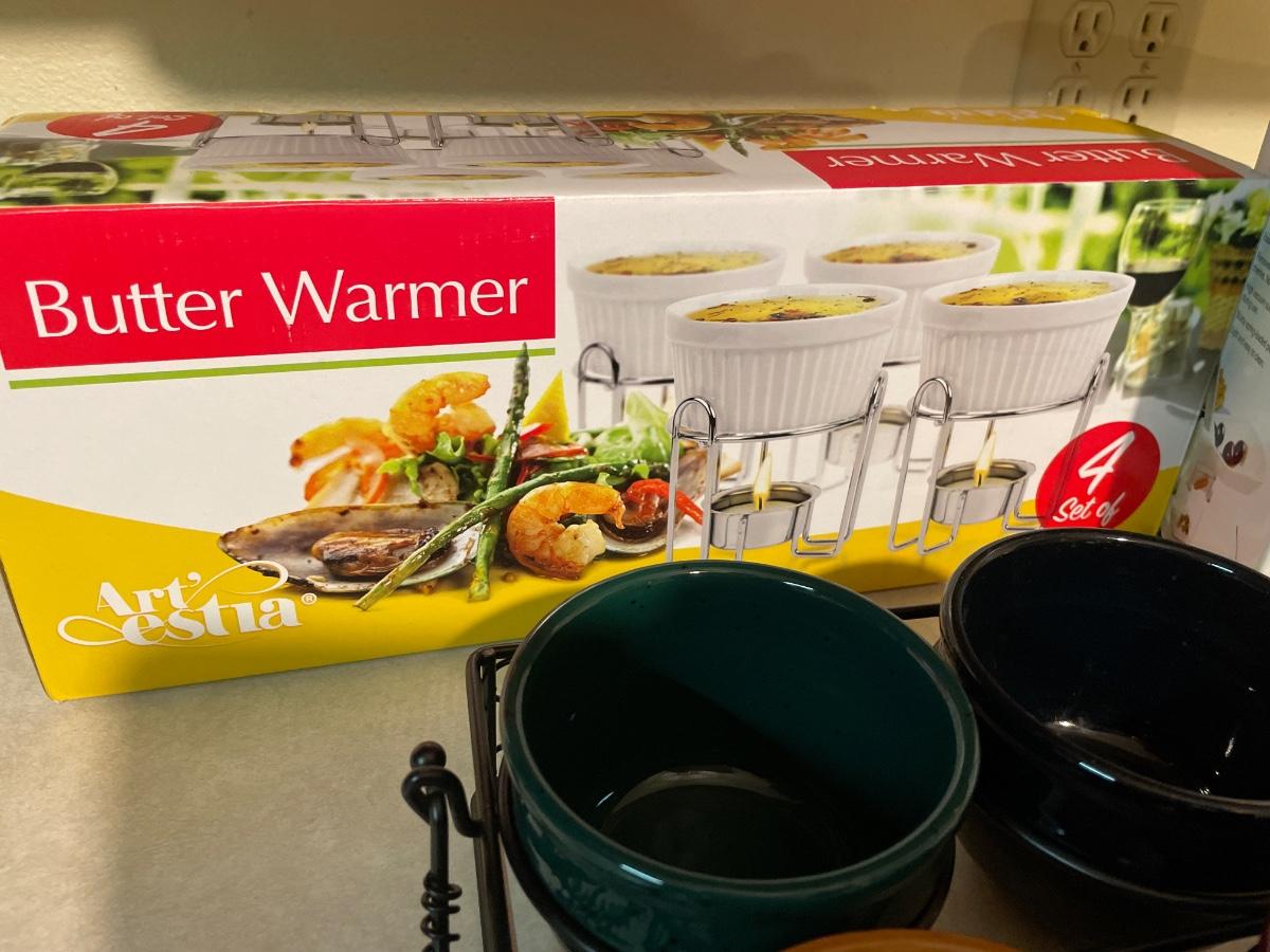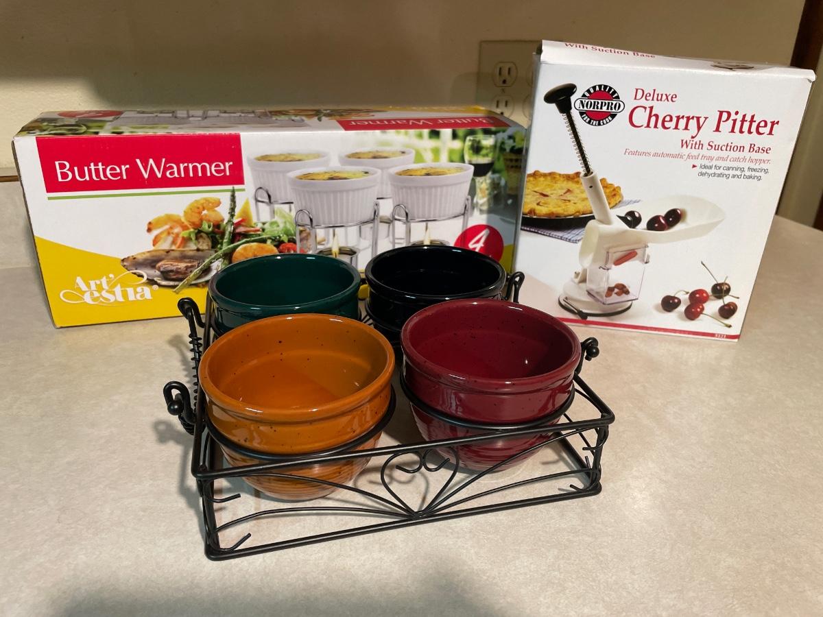 Butter warmer, cherry porter and 4 ceramic condiment holder