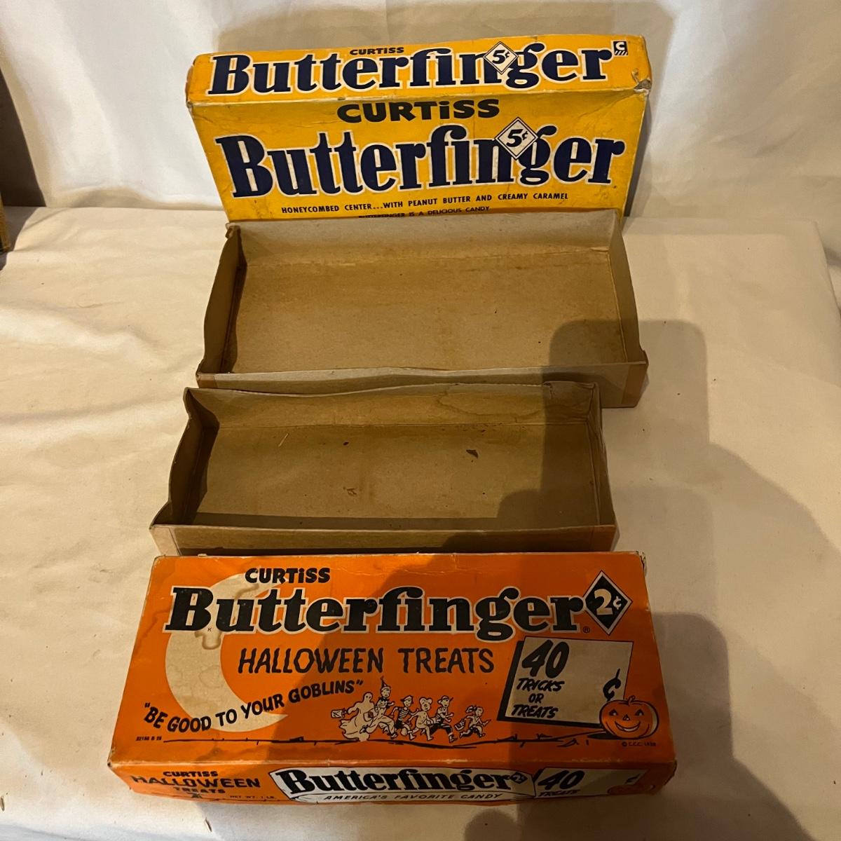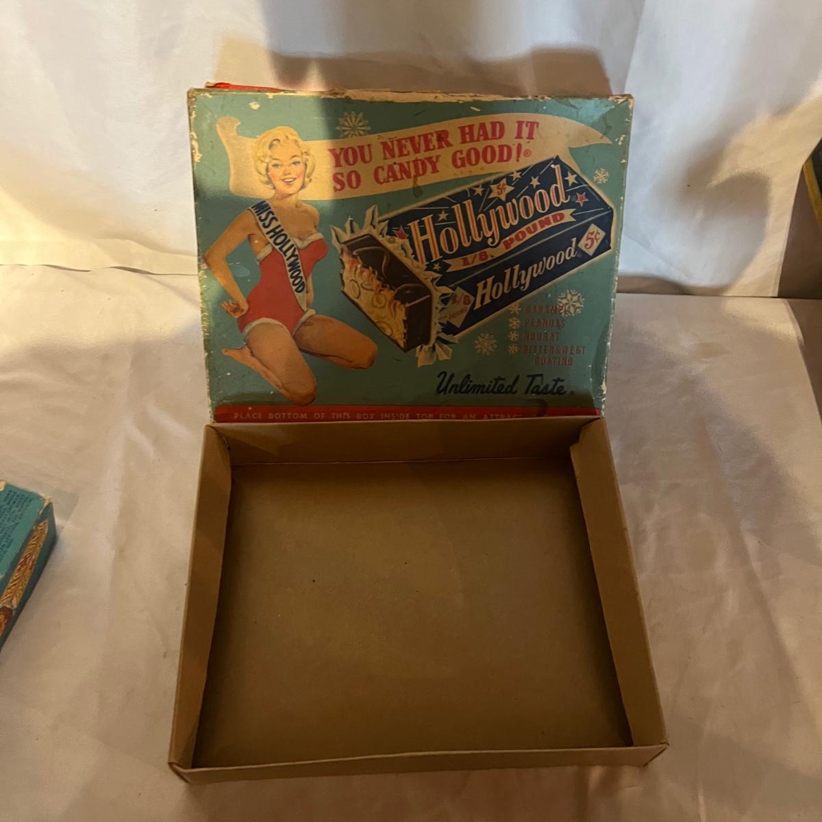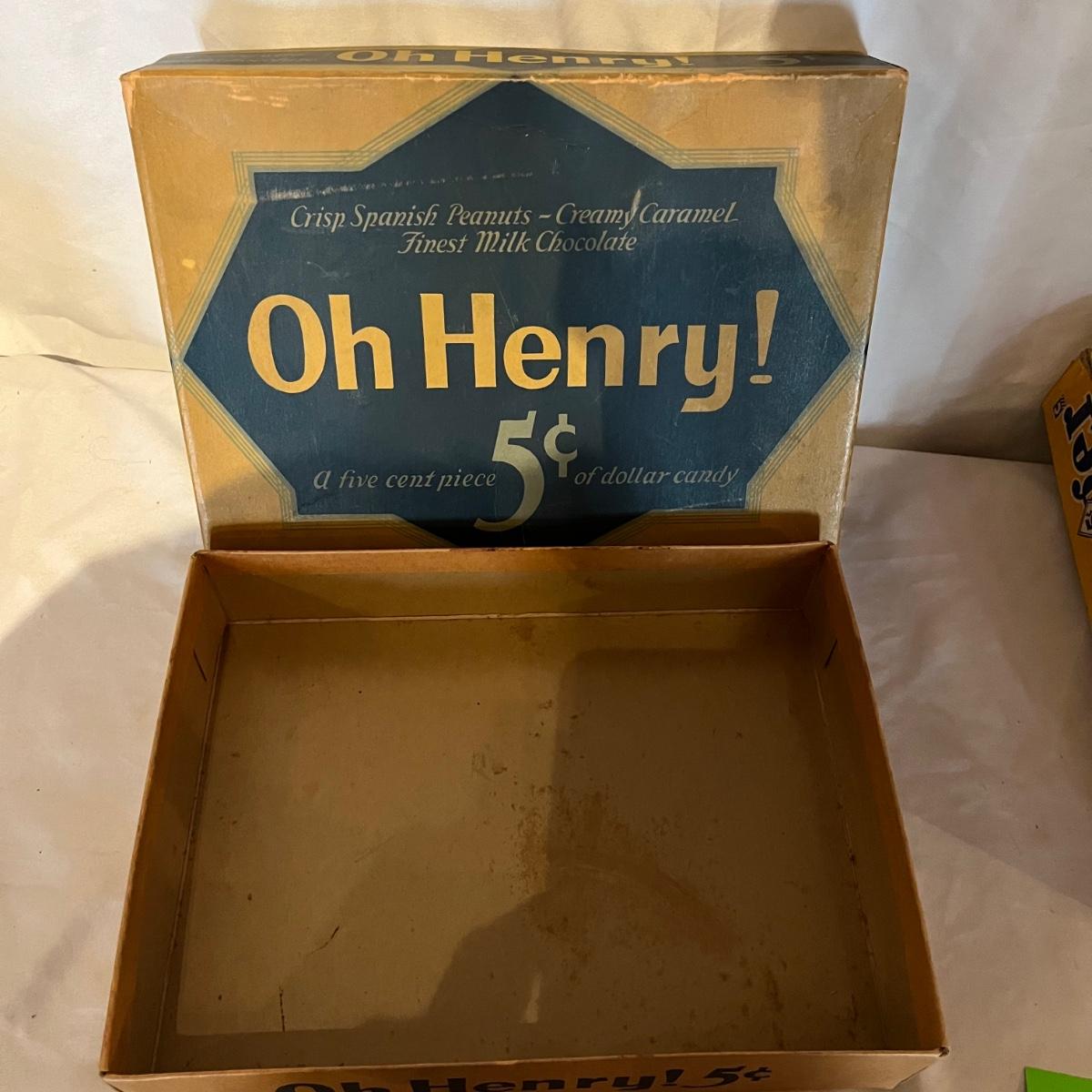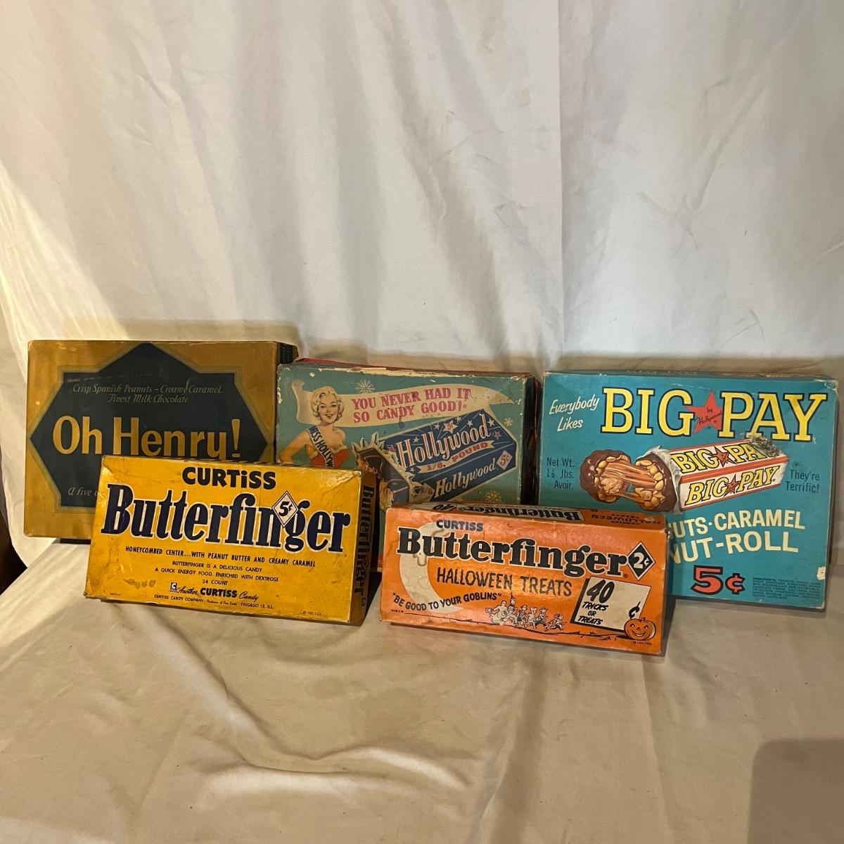Lot contains several empty vintage candy boxes. These include two Butterfinger candy boxes, Oh Henry box, Big Pay and Hollywood candy boxes. Remember when candy was just 5 cents!