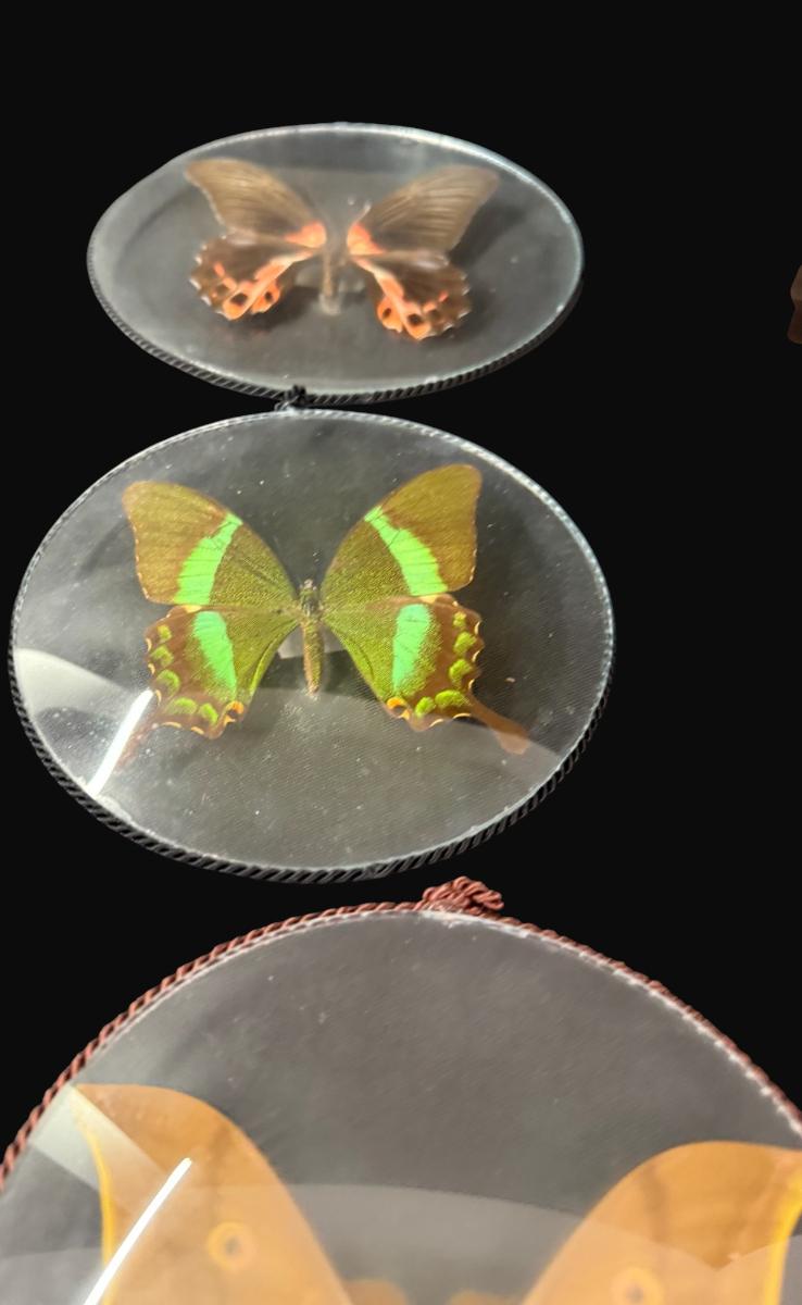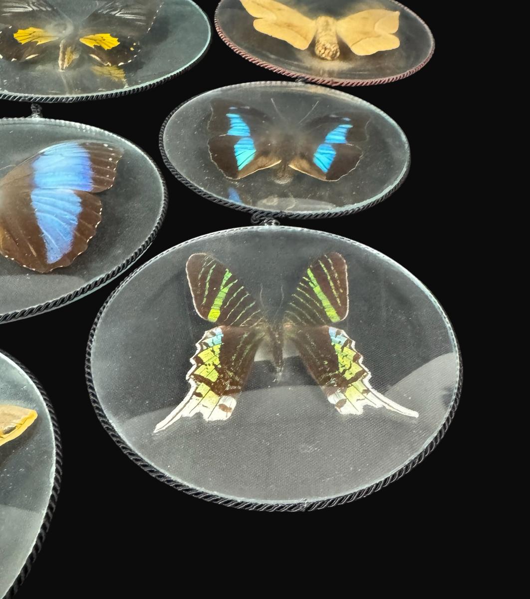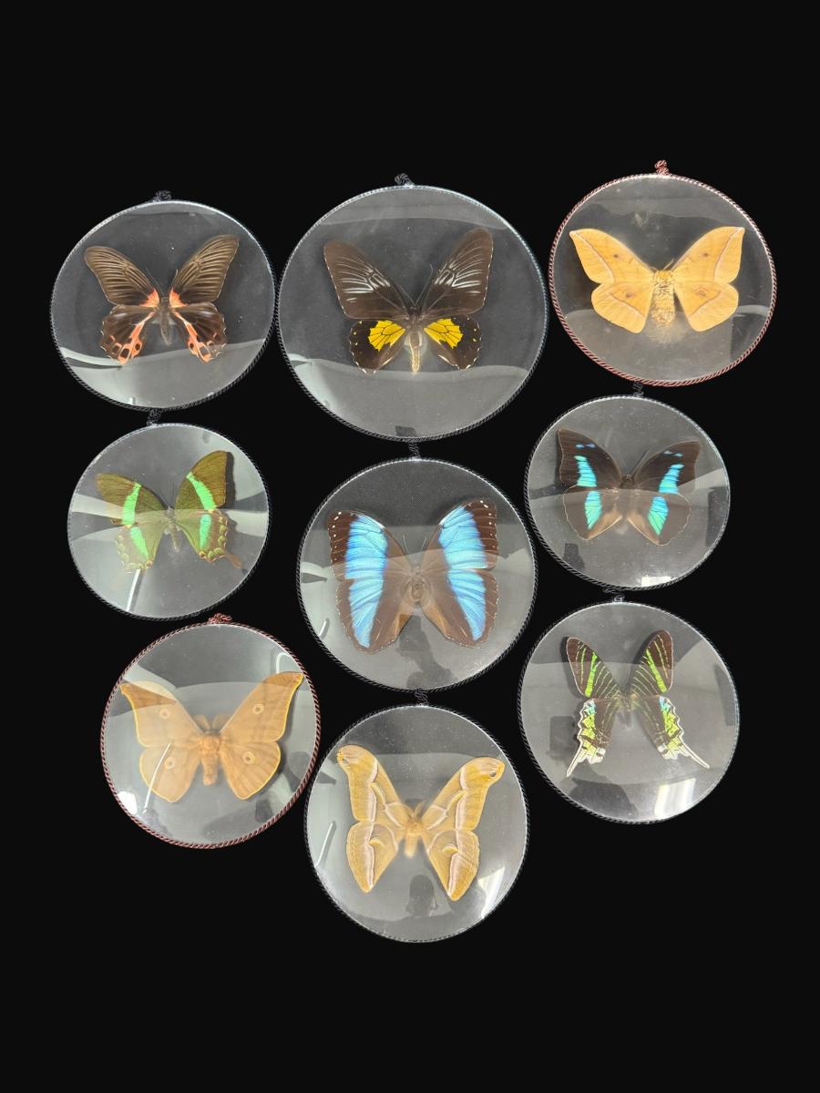These are mounted between two pieces of convex glass. Total of nine pieces. Measurement of largest: 7.5” Diameter. [RE]
