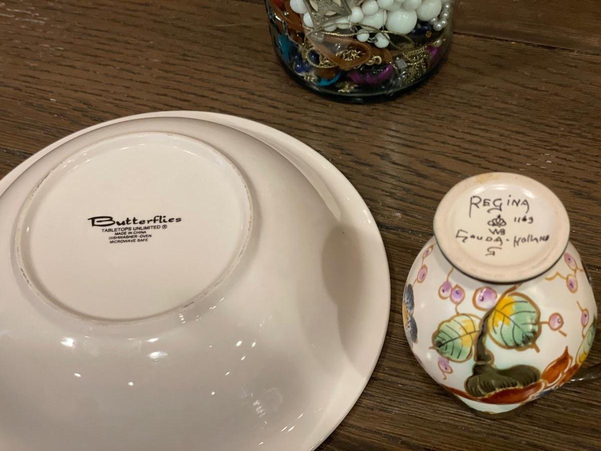 Includes butterfly bowl by Tabletops with Delft Blue Gouda-Regina #2439 and Blue Ball jar with miscellaneous jewelry pieces