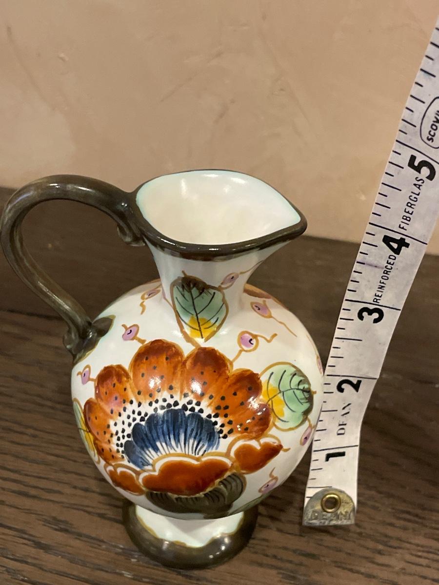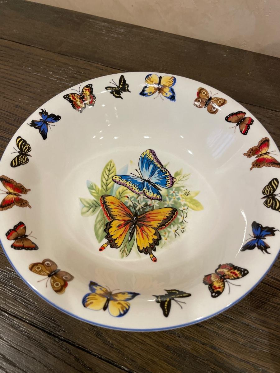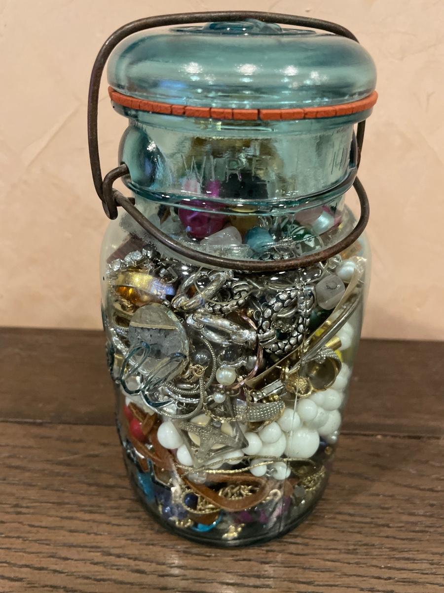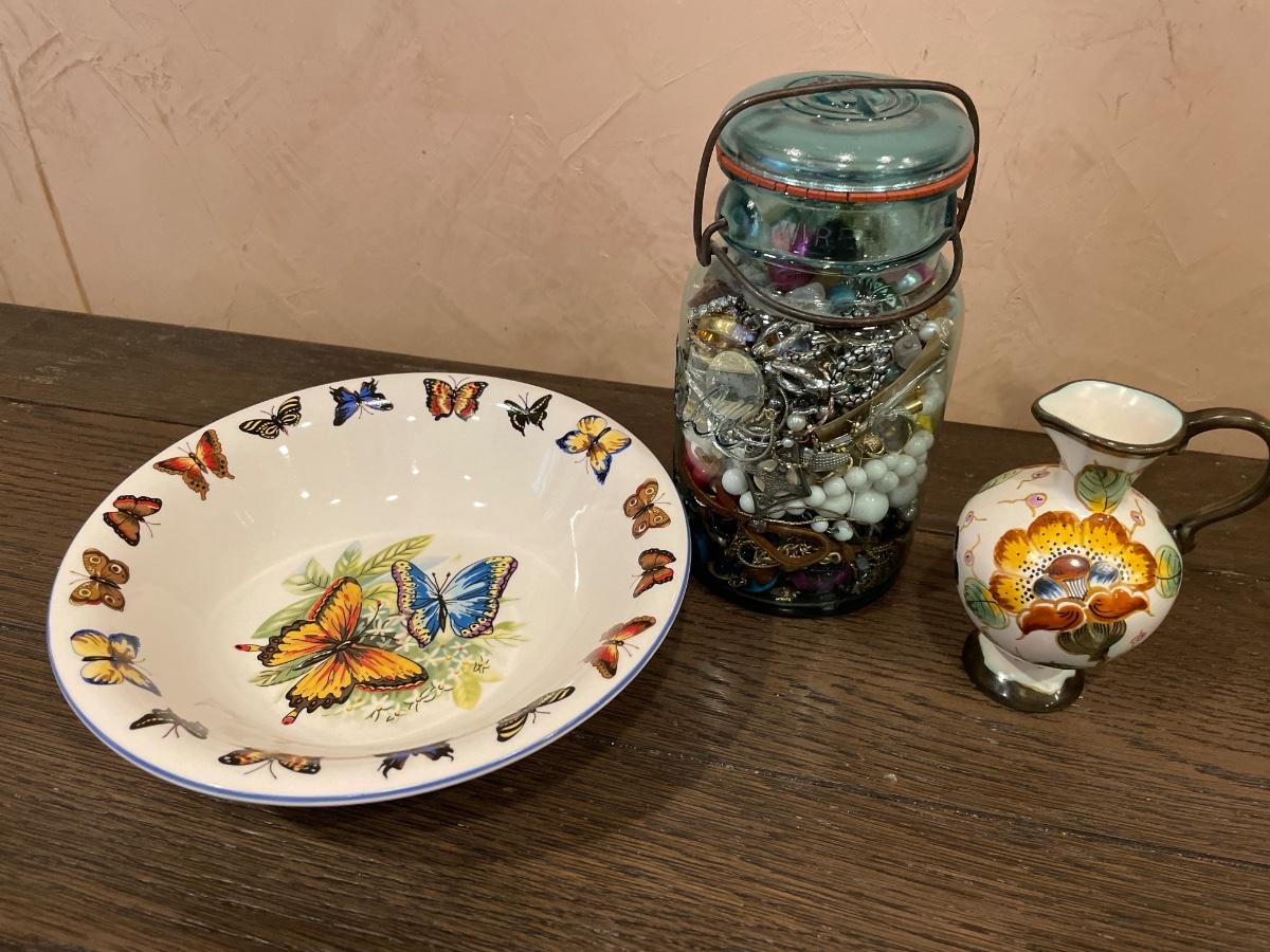 Butterfly bowl, small Regina pitcher and blue ball jar with jewelry pieces