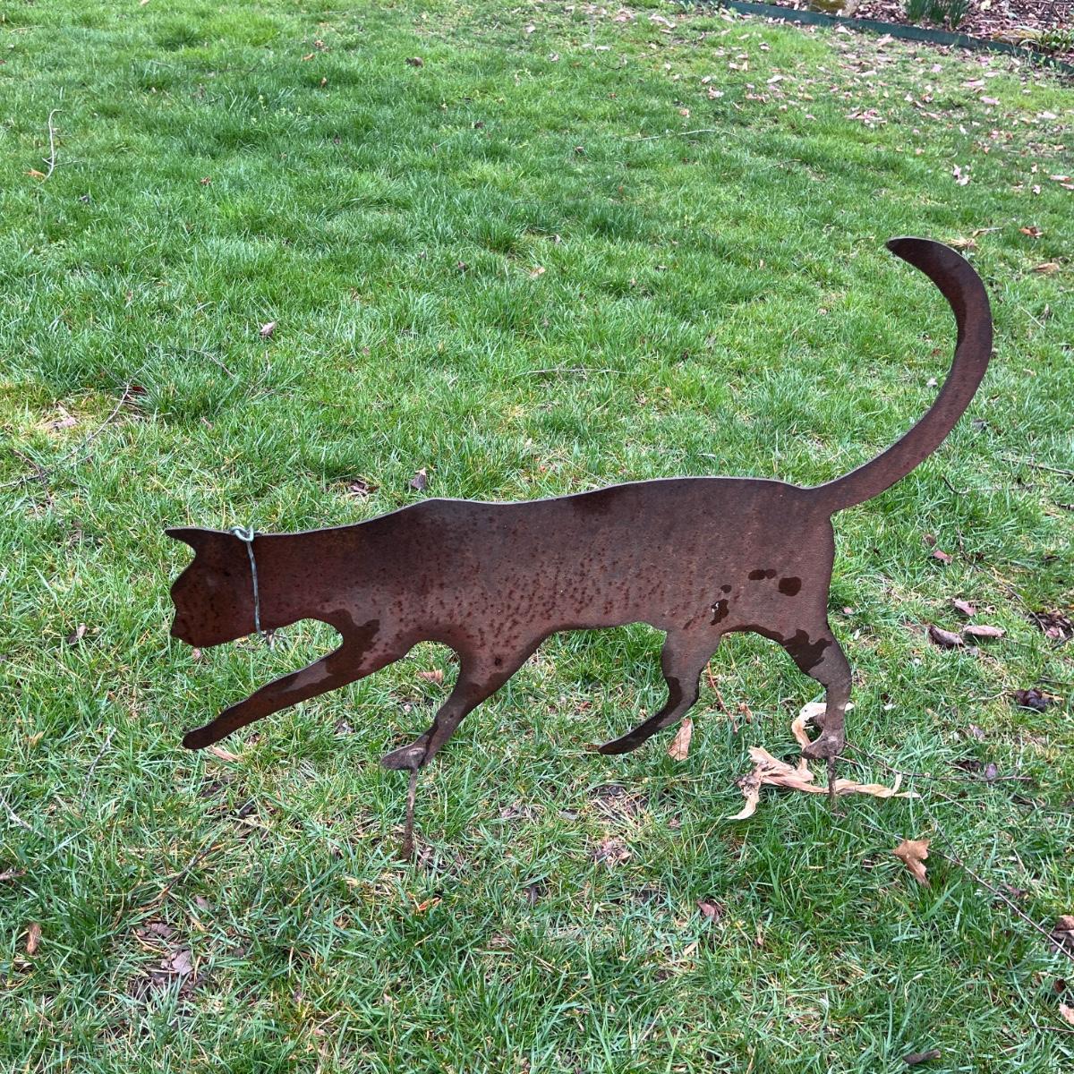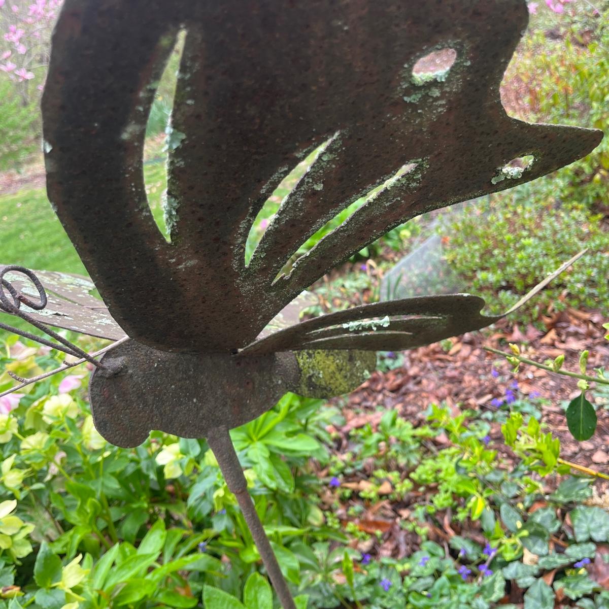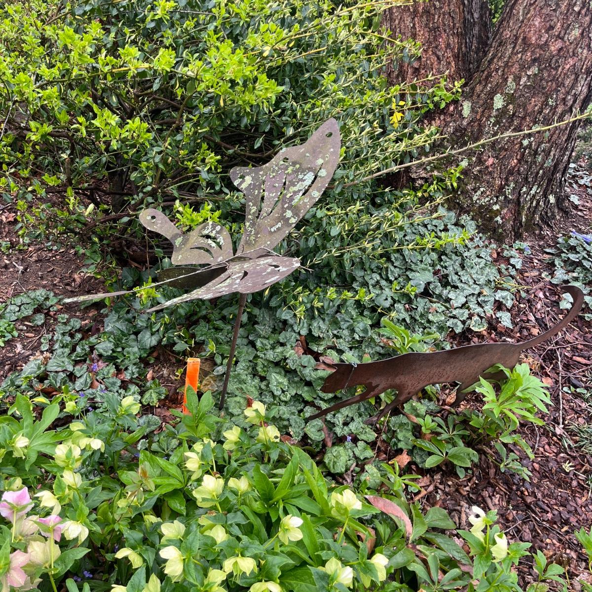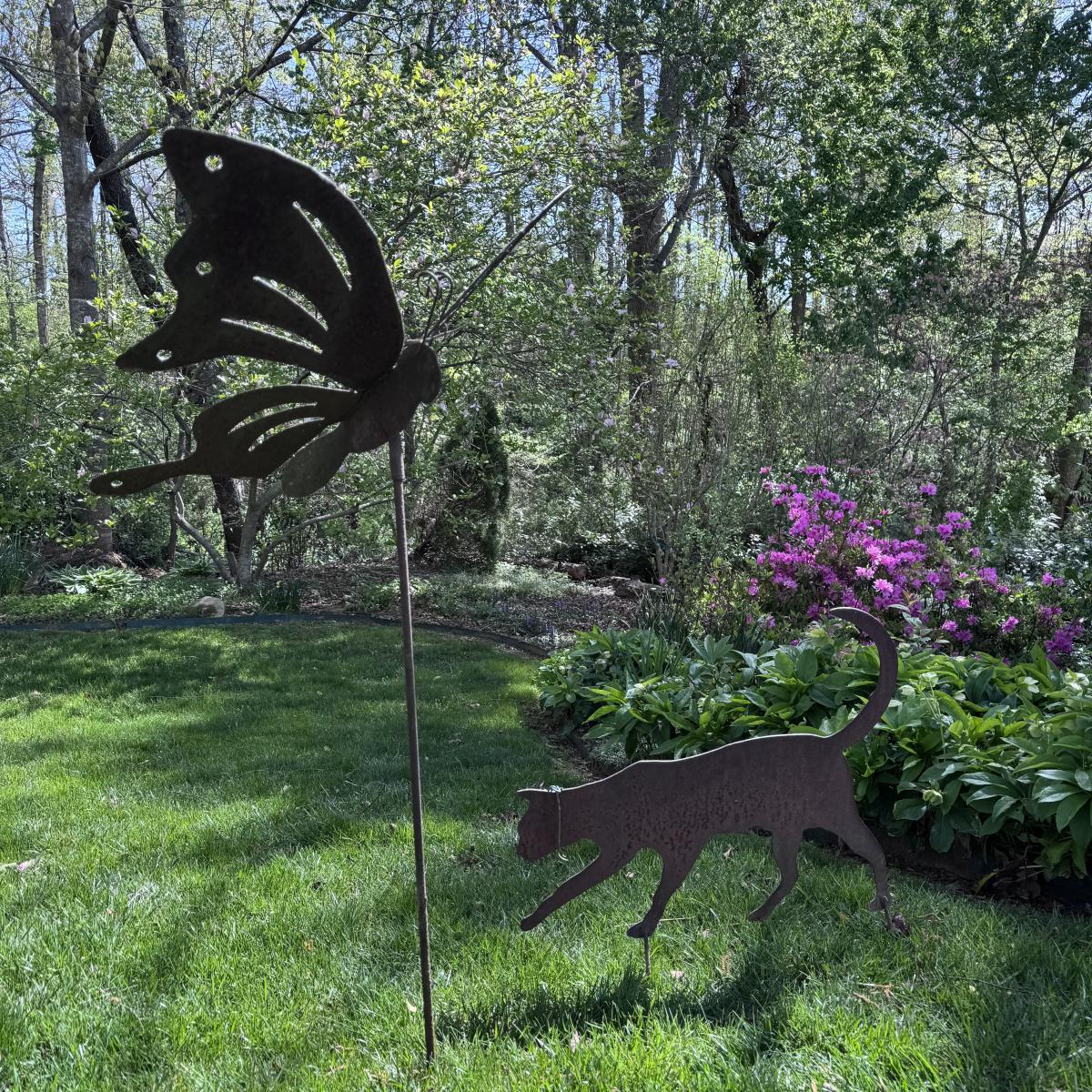 Lot includes a metal cat yard art and a metal butterfly piece of yard art that measures 27” x 23” x 35”H as pictured.