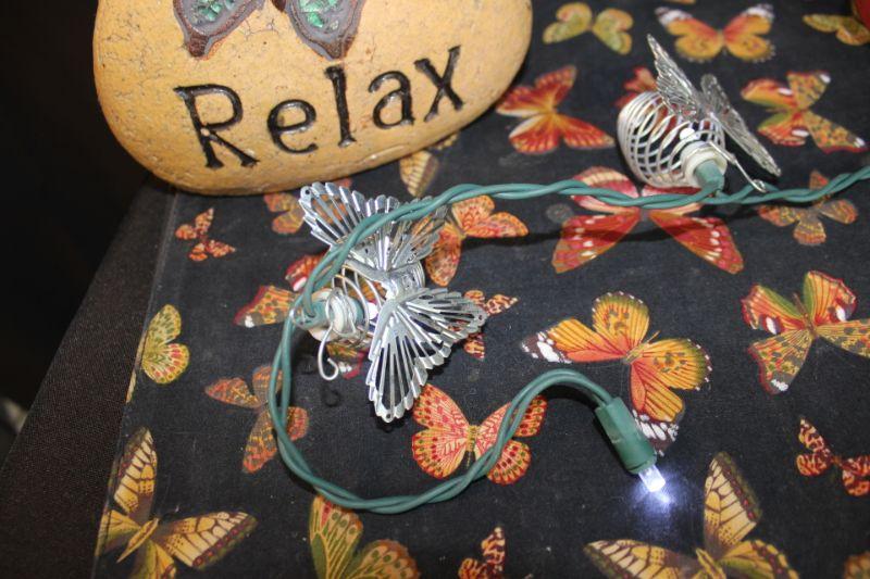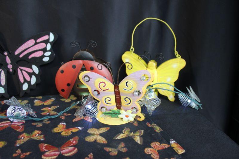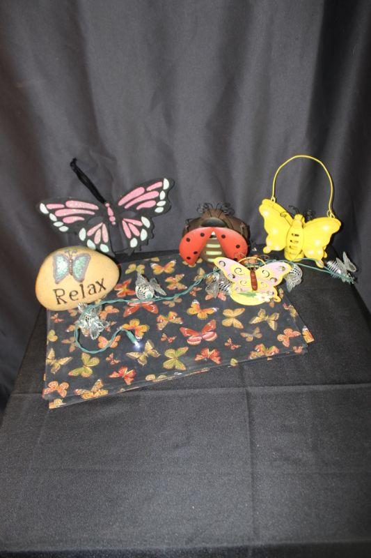Butterfly decor lot. Included are 3 metal candle holders, a garden decor rock, felt butterfly mask, LED string lights, and a set of 4 placemats. Placemats are in good condition, need to be washed.
