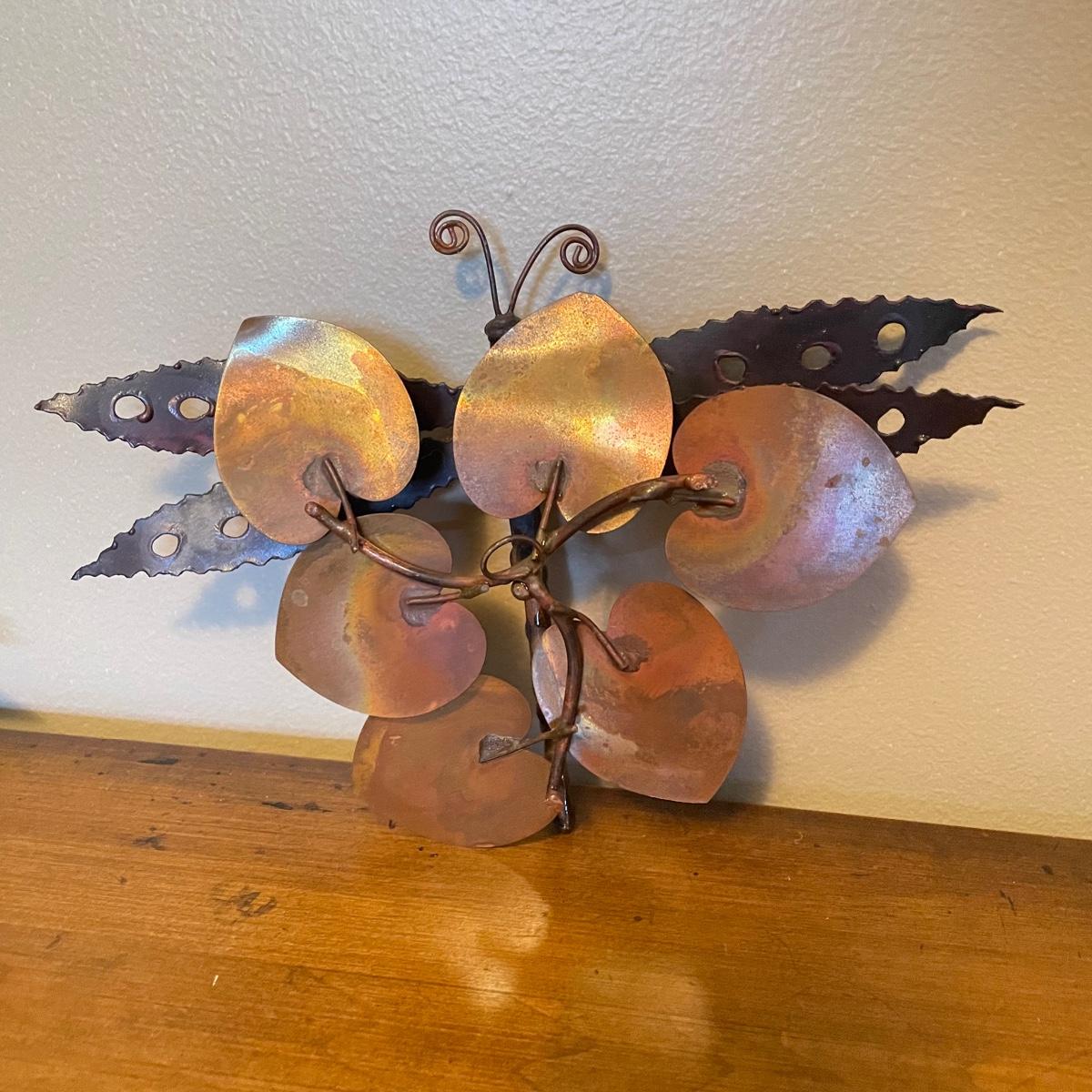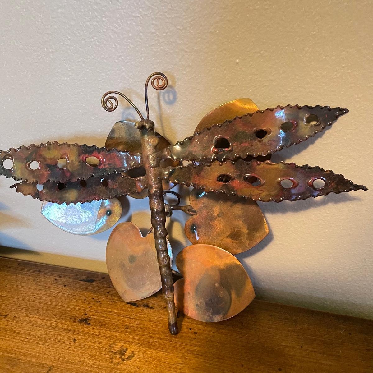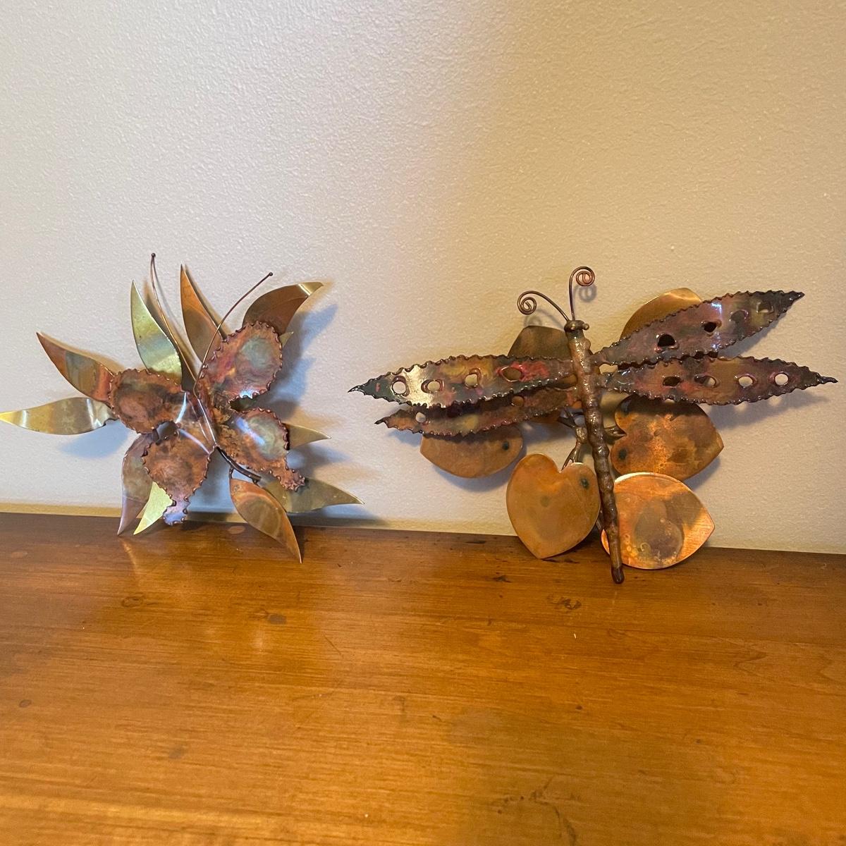 Two lovely hanging metal art pieces featuring a butterfly and dragonfly on leaves. Pieces appear to be mixed metal. The dragonfly measures about 9” x 6“. Shipping available.