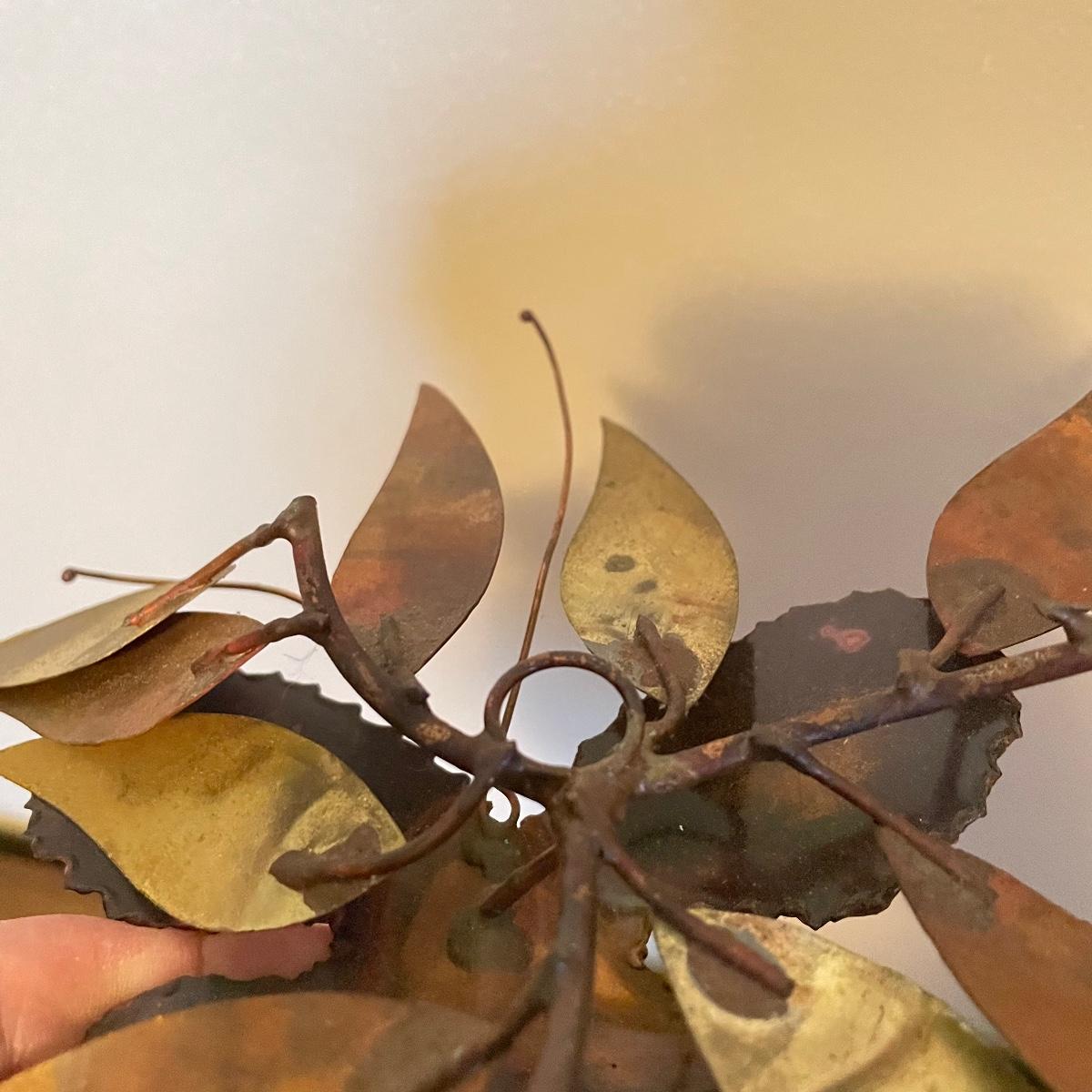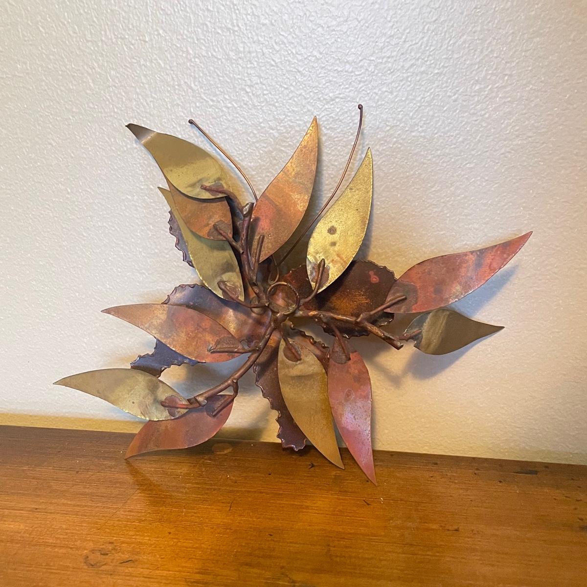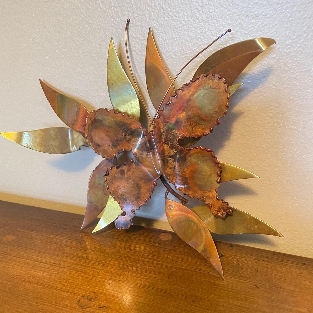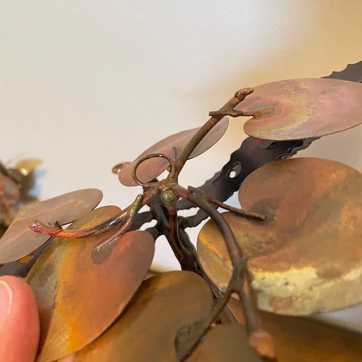 Two lovely hanging metal art pieces featuring a butterfly and dragonfly on leaves. Pieces appear to be mixed metal. The dragonfly measures about 9” x 6“. Shipping available.