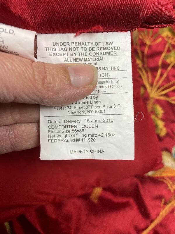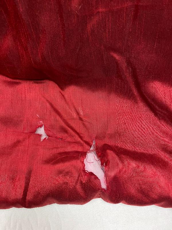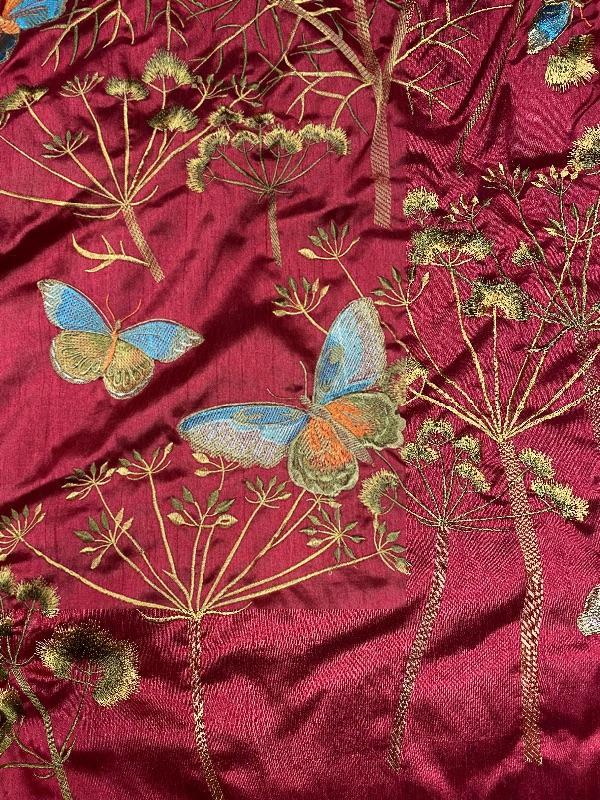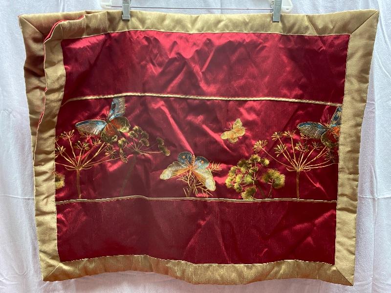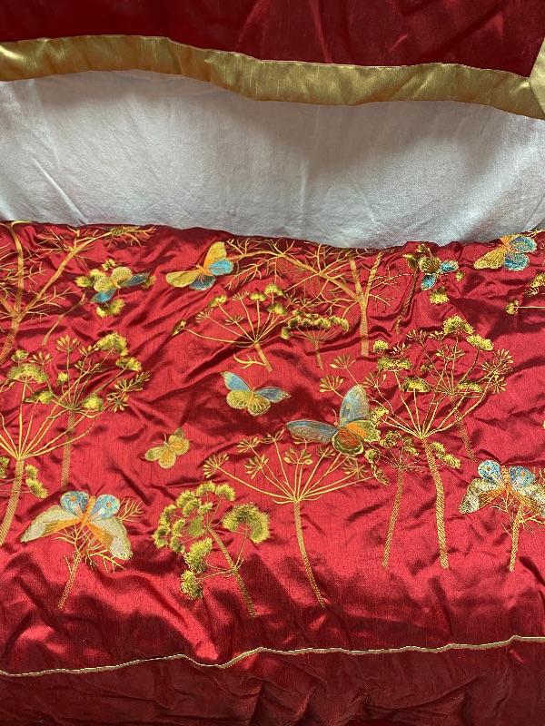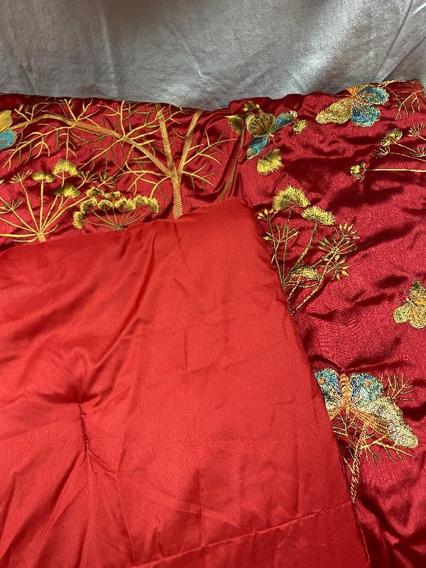 Butterfly and flower embroidered comforter set. Deep red color. Queen size comforter with standard shams. There is a tear in the comforter near the top edge. Could be stitched up, and covered by pillows when bed is made.
