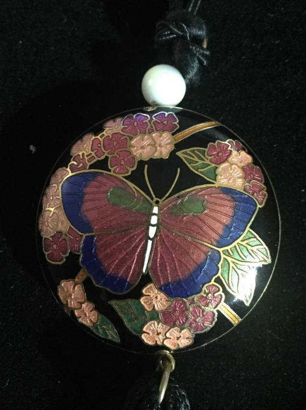 Butterfly enamel necklace And beautiful vintage condition this necklace is tattered to a black silk rope.
