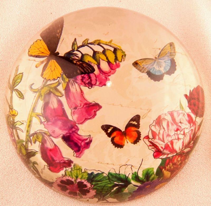 Butterfly background on a glass paperweight. Measures 3in. diameter and 1.5in tall