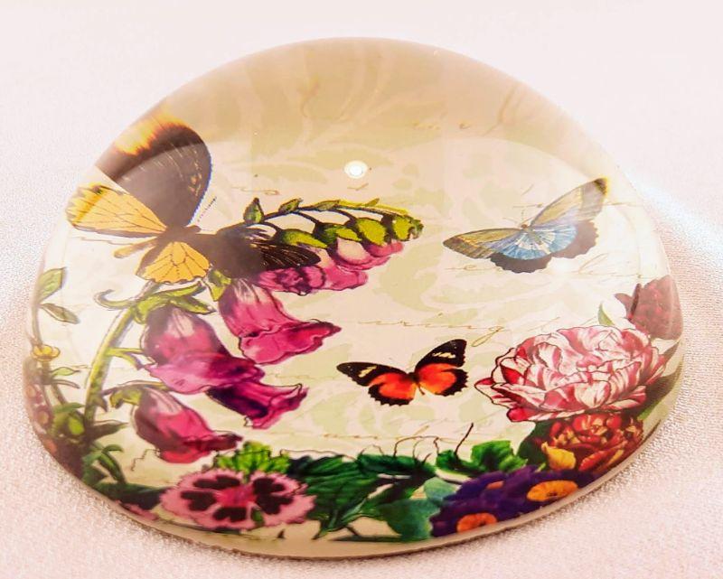 Butterfly background on a glass paperweight. Measures 3in. diameter and 1.5in tall