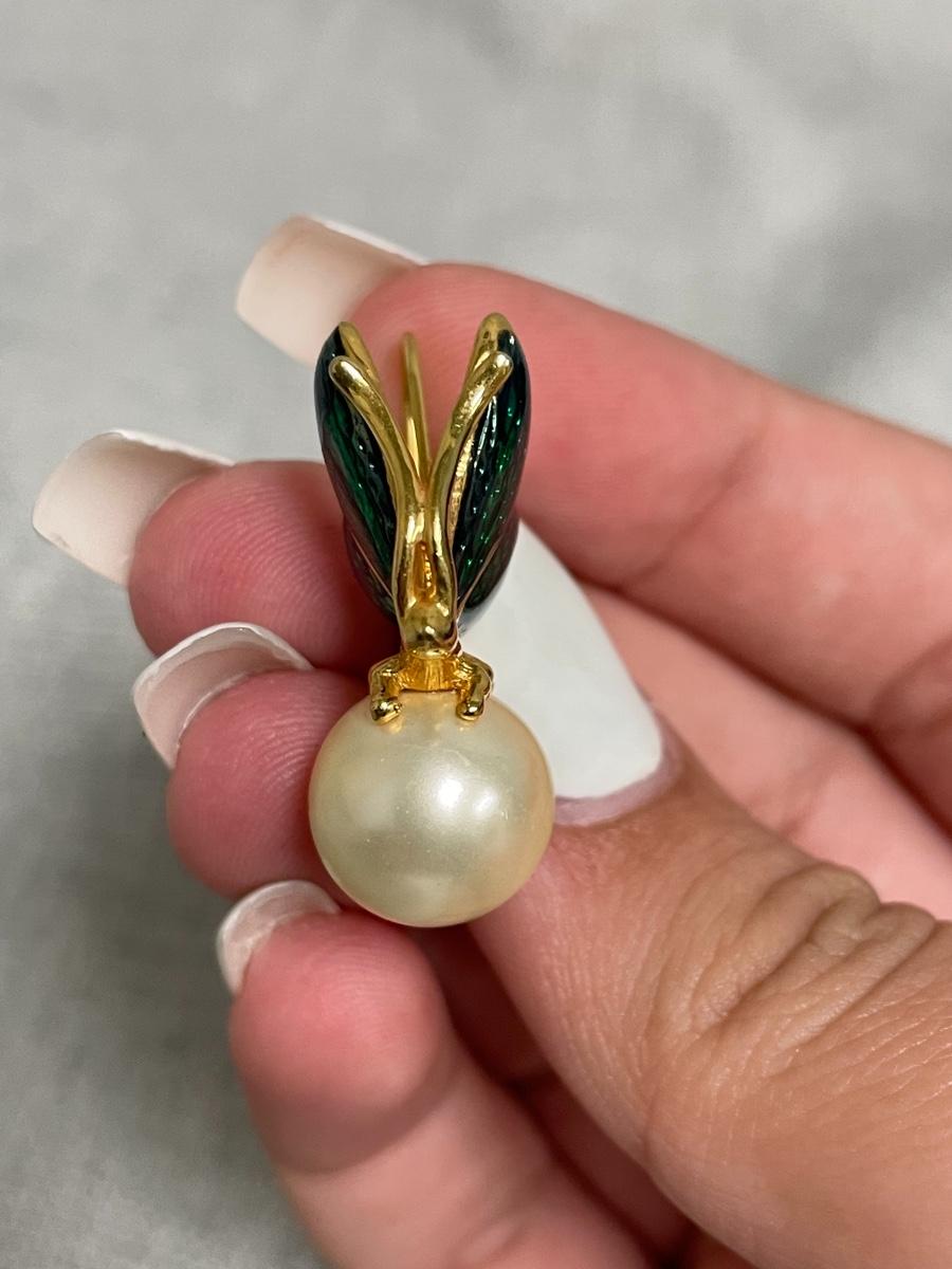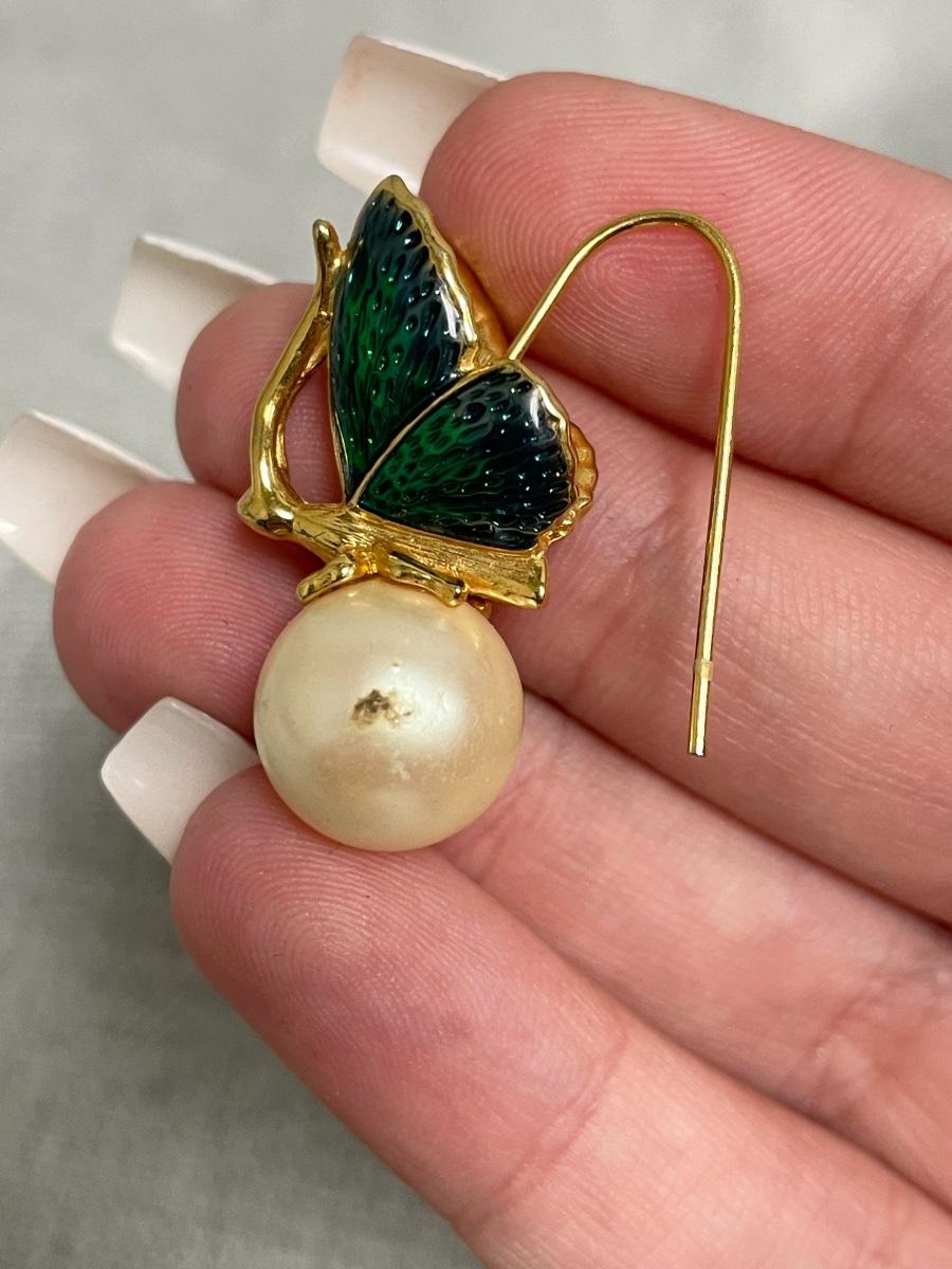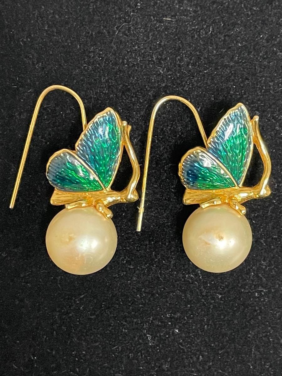 These earrings are gold tone enamel butterflies with faux pearl. Both pieces are in great condition. There is some slight discoloration on the pearl that the butterfly is sitting on.