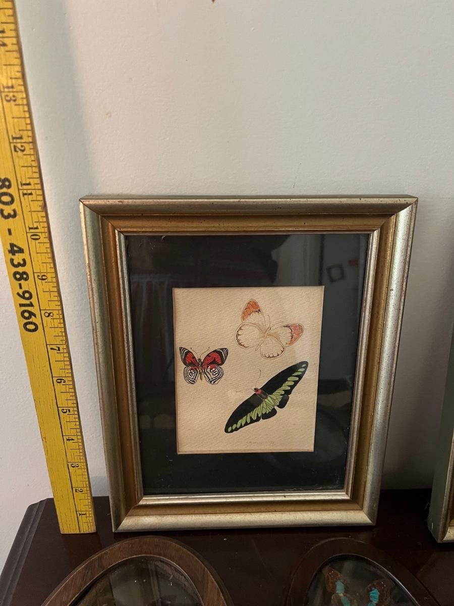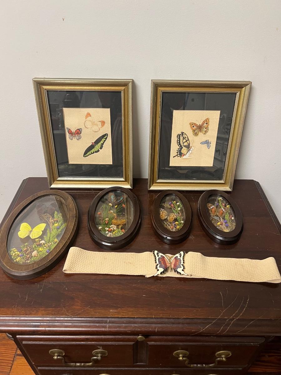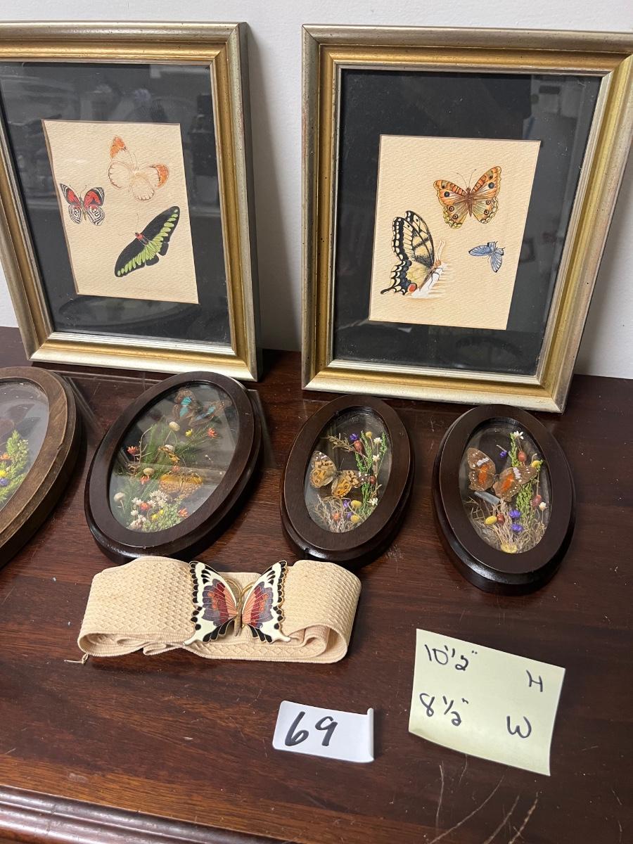 butterfly lot, misc framed butterfly art, belt buckles, as pictured